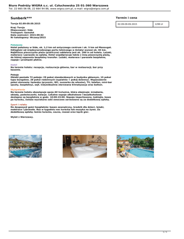 Biuro Podróży WIGRA s.c. ul. Człuchowska 25 01-360 Warszawa Tel. 22 665 06 06, 22 664 94 86, www.wigra.com.pl, e-mail: [email protected] Sunberk*** Turcja 02.09-09.09.2015 Termin i cena 02.09-09.09.2015 1299 zł Kraj: Turcja Miejscowość: Side Transport: Samolot Data ważności: 2015-09-02 Nr katalogowy: Wczasy/2015 Położenie Hotel położony w Side, ok. 1,2 km od antycznego centrum i ok. 5 km od Manavgat. Odległość od międzynarodowego portu lotniczego w Antalyi wynosi ok. 65 km. Najbliższa piaszczysta plaża (publiczna) oddalona jest ok. 200 m od hotelu. Leżaki, materace i parasole za opłatą. Hotel współpracuje także z inną piaszczystą plażą, do której zapewnia bezpłatny transfer. Leżaki, materace i parasole bezpłatne, napoje i przekąski płatne. Hotel Na terenie hotelu: recepcja, restauracja główna, bar w restauracji, bar przy basenie. Pokoje Obiekt posiada 72 pokoje: 29 pokoi standardowych w budynku głównym, 15 pokoi typu bungalow, 28 pokoi rodzinnych (sypialnia + pokój dzienny). Wyposażenie pokoi stanowią: łazienka (prysznic, WC, suszarka do włosów), TV, telefon, mini-bar (pusty, bezpłatny), sejf, indywidualnie sterowana klimatyzacja oraz balkon. Wyżywienie Na terenie hotelu obowiązuje opcja All Inclusive, która obejmuje: śniadania, obiady, podwieczorki, kolacje. Lokalne napoje alkoholowe i bezalkoholowe dostępne są bezpłatnie w godz. 10:00-23:00. Napoje importowane, koktajle, kawa po turecku, świeżo wyciskane soki owocowe serwowane są za dodatkową opłatą. Sport i relaks Do dyspozycji gości bezpłatnie: basen zewnętrzny, brodzik dla dzieci, leżaki, materace i parasole. Raz w tygodniu noc turecka lub muzyka na żywo. Za dodatkową opłatą: łaźnia turecka, sauna, masaż oraz kącik gier. Wylot z Warszawy. 1/1 Powered by TCPDF (www.tcpdf.org)