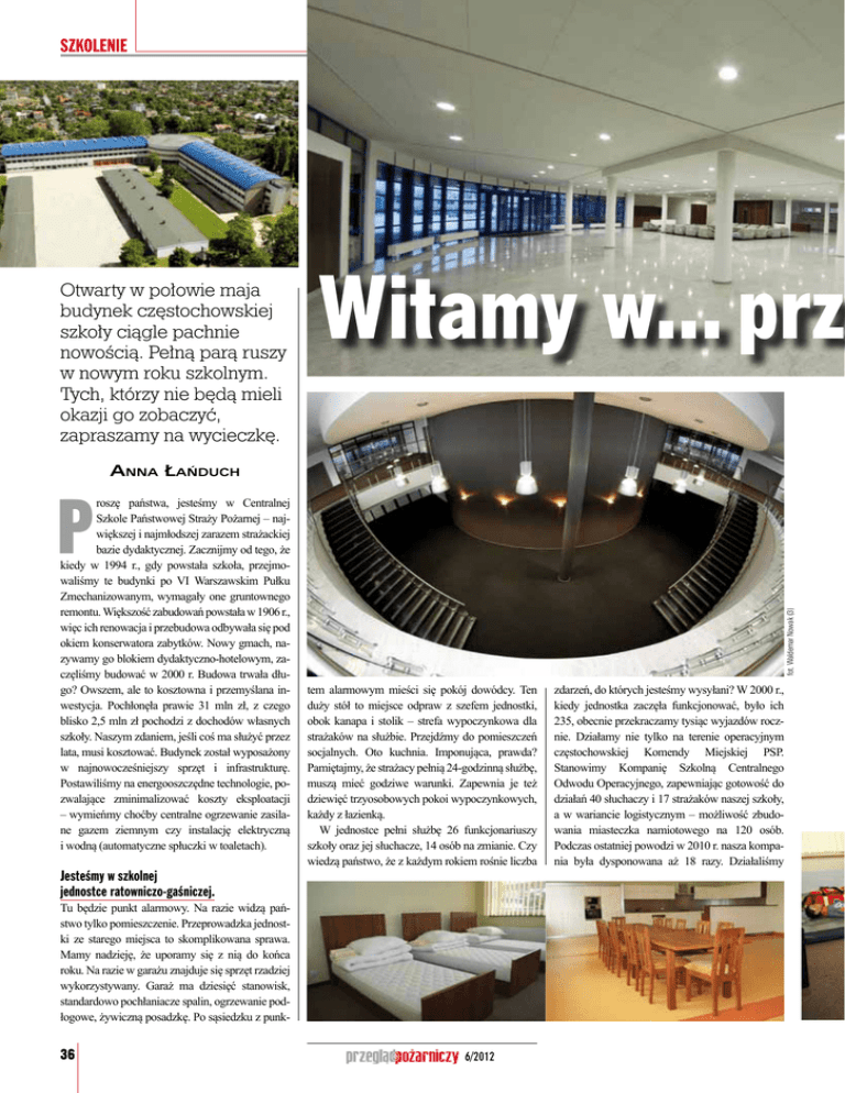 SZKOLENIE Otwarty w połowie maja budynek częstochowskiej szkoły ciągle pachnie nowością. Pełną parą ruszy w nowym roku szkolnym. Tych, którzy nie będą mieli okazji go zobaczyć, zapraszamy na wycieczkę. Anna Ł ańduch roszę państwa, jesteśmy w Centralnej Szkole Państwowej Straży Pożarnej – największej i najmłodszej zarazem strażackiej bazie dydaktycznej. Zacznijmy od tego, że kiedy w 1994 r., gdy powstała szkoła, przejmowaliśmy te budynki po VI Warszawskim Pułku Zmechanizowanym, wymagały one gruntownego remontu. Większość zabudowań powstała w 1906 r., więc ich renowacja i przebudowa odbywała się pod okiem konserwatora zabytków. Nowy gmach, nazywamy go blokiem dydaktyczno-hotelowym, zaczęliśmy budować w 2000 r. Budowa trwała długo? Owszem, ale to kosztowna i przemyślana inwestycja. Pochłonęła prawie 31 mln zł, z czego blisko 2,5 mln zł pochodzi z dochodów własnych szkoły. Naszym zdaniem, jeśli coś ma służyć przez lata, musi kosztować. Budynek został wyposażony w najnowocześniejszy sprzęt i infrastrukturę. Postawiliśmy na energooszczędne technologie, pozwalające zminimalizować koszty eksploatacji – wymieńmy choćby centralne ogrzewanie zasilane gazem ziemnym czy instalację elektryczną i wodną (automatyczne spłuczki w toaletach). Jesteśmy w szkolnej jednostce ratowniczo-gaśniczej. fot. Waldemar Nowak (3) P Witamy w... prz tem alarmowym mieści się pokój dowódcy. Ten duży stół to miejsce odpraw z szefem jednostki, obok kanapa i stolik – strefa wypoczynkowa dla strażaków na służbie. Przejdźmy do pomieszczeń socjalnych. Oto kuchnia. Imponująca, prawda? Pamiętajmy, że strażacy pełnią 24-godzinną służbę, muszą mieć godziwe warunki. Zapewnia je też dziewięć trzyosobowych pokoi wypoczynkowych, każdy z łazienką. W jednostce pełni służbę 26 funkcjonariuszy szkoły oraz jej słuchacze, 14 osób na zmianie. Czy wiedzą państwo, że z każdym rokiem rośnie liczba Tu będzie punkt alarmowy. Na razie widzą państwo tylko pomieszczenie. Przeprowadzka jednostki ze starego miejsca to skomplikowana sprawa. Mamy nadzieję, że uporamy się z nią do końca roku. Na razie w garażu znajduje się sprzęt rzadziej wykorzystywany. Garaż ma dziesięć stanowisk, standardowo pochłaniacze spalin, ogrzewanie podłogowe, żywiczną posadzkę. Po sąsiedzku z punk- 36 6/2012 zdarzeń, do których jesteśmy wysyłani? W 2000 r., kiedy jednostka zaczęła funkcjonować, było ich 235, obecnie przekraczamy tysiąc wyjazdów rocznie. Działamy nie tylko na terenie operacyjnym częstochowskiej Komendy Miejskiej PSP. Stanowimy Kompanię Szkolną Centralnego Odwodu Operacyjnego, zapewniając gotowość do działań 40 słuchaczy i 17 strażaków naszej szkoły, a w wariancie logistycznym – możliwość zbudowania miasteczka namiotowego na 120 osób. Podczas ostatniej powodzi w 2010 r. nasza kompania była dysponowana aż 18 razy. Działaliśmy bierzemy udział w miejskich akcjach promocyjnych, wspieramy miejscowy dom dziecka. Oto pracownia ratownictwa medycznego. zyszłości w 13 miejscach, w ośmiu województwach. Ważna informacja: w 2009 r. w szkole powstała Specjalistyczna Grupa Ratownictwa Technicznego, obejmująca powiaty lubliniecki, kłobucki i częstochowski. To pokłosie naszego udziału w trudnych i głośnych akcjach: po zawaleniu się chorzowskiej hali MTK, akcji usuwania skutków trąby powietrznej. Tak, odbieramy to jako dowód uznania dla naszej wiedzy, doświadczenia i umiejętności wykorzystania nowoczesnego sprzętu. Nasz ciężki samochód ratownictwa technicznego jest najnowocześniejszym takim pojazdem w województwie śląskim. Wszyscy strażacy przeszli specjalistyczne przeszkolenie z ratownictwa chemicznego. Mamy nowoczesny ciężki samochód Renault Kerax do takich działań. Kilku z nas może pochwalić się kwalifikacjami z ratownictwa wysokościowego, również do działań ze śmigłowcem. Ciekawostka: nasi strażacy uratowali dwie osoby, używając defibrylatora automatycznego. Może państwo zauważyli, że podziękowania od rodziny poszkodowanego ukazały się w „Gazecie Wyborczej”? Jesteśmy też dumni z naszego kolegi st. kpt. Dariusza Andryszkiewicza, który w dniu wolnym od służby uratował kobietę. Nieprzytomna leżała zakrwawiona na drodze. Dzięki udzielonej przez niego pierwszej pomocy odzyskała przytomność jeszcze przed przyjazdem karetki. Uczymy kadetów otwartości, To dwie sale po około 40 m kw. każda oraz zaplecze do przechowywania i dezynfekcji sprzętu. Są one, proszę państwa, wyposażone zgodnie z wytycznymi z rozporządzenia ministra spraw wewnętrznych i administracji oraz ministra obrony narodowej w sprawie szkoleń w zakresie kwalifikowanej pierwszej pomocy. W pierwszej z sal mamy m.in. cztery stanowiska do nauki resuscytacji krążeniowo-oddechowej, dwa do nauki udrożniania górnych dróg oddechowych, stanowisko do nauki przyrządowej wentylacji dróg oddechowych. Proszę spojrzeć, fantomy bezprzewodowo współpracują z oprogramowaniem komputerowym, pokazując prawidłowość wykonywania ćwiczeń. Nie plączemy się w kablach, tak jest o niebo wygodniej. W wyposażeniu są także cztery treningowe defibrylatory półautomatyczne. Przejdźmy do drugiej sali. Tutaj słuchacze uczą się, jak postępować z obrażeniami mechanicznymi, chemicznymi czy termicznymi. Poznają zasady działania podczas zdarzeń masowych i ewakuacji ze strefy zagrożenia. Proszę państwa, te duże fantomy pozwalają zaprezentować różne urazy, ale i ćwiczyć ewakuację. Wypełniamy manekina wodą i mamy 80-kilogramowego „poszkodowanego”, używamy piasku – zyskujemy 130-kilogramowego. Proszę spojrzeć na blaty – są wykonane z żywicy epoksydowej, odpornej na ogień. Przed nami pracownia ratownictwa drogowego. Ten żółty Fiat Panda (nowe nadwozie dostaliśmy od firmy Fiat Auto Poland) połączony jest z pulpitem sterującym. Za pomocą specjaln