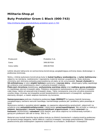 Militaria-Shop.pl Buty Protektor Grom-1 Black (000-743) http://militaria-shop.pl/produkt/buty-protektor-grom-1-743 Producent Protektor S.A. Cena 349.00 PLN Cena netto 349.00 PLN Lekkie obuwie taktyczne ze wzmocnioną konstrukcją uwzględniającą ochronę stawu skokowego i z podeszwą terenową. Skóra, z której wykonano konstrukcję buta to bukat bydlęcy wodoodporny, a nylon balistyczny odporny na rozcięcia, rozdzieranie i naprężenia materiał stanowi uzupełnienie. Staw skokowy chroniony jest skórzaną wstawką poprowadzoną od pięty aż do sznurowadeł. Szczyt cholewki to 50-milimetrowy (z tyłu) miękki kołnierz wykonany z owczej skóry - obejmujący łydkę zapobiega jej uciskaniu oraz powstawaniu otarć o sztywną krawędź cholewy. Pięta jest chroniona dodatkową, usztywnioną warstwą skóry oraz nadlaną gumą podeszwy, co zapobiega obiciom krawędzi pięty. Podobne rozwiązanie zastosowano w celu ochrony krawędzi całej stopy, także od wewnętrznej krawędzi stopy. Takie rozwiązanie znacznie utrudnia powstanie urazów stopy chroniąc jej krawędzie przed bezpośrednimi uderzeniami o krawężniki, wystające elementy zbrojeń, a nawet większe kamienie czy korzenie. Samoczyszcząca podczas chodzenia podeszwa typu ZERMATT to typowy bieżnik terenowy uwzględniający zarówno warunki twardego, kamienistego podłoża jak i problemy jakie powstają w lesie. Wykonana została z wysokiej jakości gumy, co zapewnia odpowiednią sprężystość, odporność na przebicie oraz antyelektrostatyczność i właściwości przeciwpoślizgowe. Nie wchodzi w reakcję z olejami, benzynami i innymi rozpuszczalnikami organicznymi, a także smarami czy kwasami (30%H2SO4) i zasadami (20% NaOH). Jest także odporna na krótkotrwały kontakt z gorącymi podłożami (60 sek w temp. 300 st. C). Materiał oraz kształt bieżnika łączą dobrą trakcję na śliskich kamieniach z elastycznością podeszwy do dynamicznego biegania, także odbicia z ostrych krawędzi i skrytego podchodzenia. Żebrowana powierzchnia pod śródstopiem zapewnia stabilność na schodach, drabinkach i krawędzich Strona 1 z 2 zabezpieczając przed zsuwaniem się buta. Podeszwa do cholewki jest mocowana metodą klejenia. Buty objęte są 12-miesięczną gwarancją. PROTEKTOR S.A. posiada certyfikat AQAP 2110:2006 dokumentujący dostosowanie jakości i funkcjonalności wytwarzanych butów militarnych do wymagań NATO. Dane techniczne Model: Grom-1 (743) Kolor: czarny Cholewka: wierzch: bukat bydlęcy wodoodporny, nylon balistyczny impregnowany Podeszwa: Guma z bieżnikiem ZERMATT System montażu: klejenie Waga pary: 1,6 kg (dla rozm. 42) Rozmiary: 36 - 46 Producent: Protektor, Polska numer acja Protek tor (stand ard) numer acja angiel ska numer acja metry czna 36 37 38 39 40 41 42 43 44 45 46 47 48 3,5 4,5 5 5,5 6,5 7 8 9 10 10,5 11,5 12 13 23 24 24,5 25 26 26,5 27 28 28,5 29 30 30,5 31 Strona 2 z 2