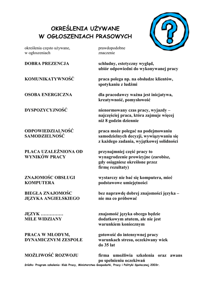 OKREŚLENIA UŻYWANE W OGŁOSZENIACH PRASOWYCH określenia często używane, w ogłoszeniach prawdopodobne znaczenie DOBRA PREZENCJA schludny, estetyczny wygląd, ubiór odpowiedni do wykonywanej pracy KOMUNIKATYWNOŚĆ praca polega np. na obsłudze klientów, spotykaniu z ludźmi OSOBA ENERGICZNA dla pracodawcy ważna jest inicjatywa, kreatywność, pomysłowość DYSPOZYCYJNOŚĆ nienormowany czas pracy, wyjazdy – najczęściej praca, która zajmuje więcej niż 8 godzin dziennie ODPOWIEDZIALNOŚĆ SAMODZIELNOŚĆ praca może polegać na podejmowaniu samodzielnych decyzji, wywiązywaniu się z każdego zadania, wyjątkowej solidności PŁACA UZALEŻNIONA OD WYNIKÓW PRACY przynajmniej część pracy to wynagrodzenie prowizyjne (zarobisz, gdy osiągniesz określone przez firmę rezultaty) ZNAJOMOŚC OBSŁUGI KOMPUTERA wystarczy nie bać się komputera, mieć podstawowe umiejętności BIEGŁA ZNAJOMOŚC JĘZYKA ANGIELSKIEGO bez naprawdę dobrej znajomości języka – nie ma co próbować JĘZYK …………… MILE WIDZIANY znajomość języka obcego będzie dodatkowym atutem, ale nie jest warunkiem koniecznym PRACA W MŁODYM, DYNAMICZNYM ZESPOLE gotowość do intensywnej pracy warunkach stresu, oczekiwany wiek do 35 lat MOŻLIWOŚĆ ROZWOJU firma umożliwia szkolenia oraz awans po spełnieniu oczekiwań źródło: Program szkolenia: Klub Pracy, Ministerstwo Gospodarki, Pracy i Polityki Społecznej 2003r.