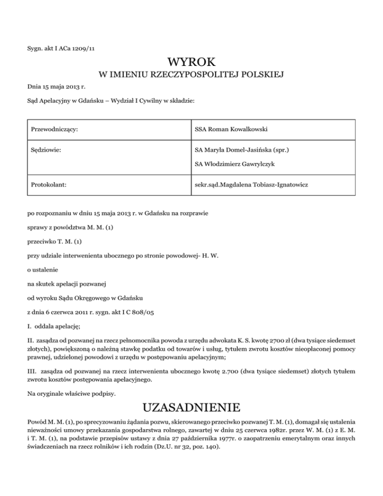 Sygn. akt I ACa 1209/11 WYROK W IMIENIU RZECZYPOSPOLITEJ POLSKIEJ Dnia 15 maja 2013 r. Sąd Apelacyjny w Gdańsku – Wydział I Cywilny w składzie: Przewodniczący: SSA Roman Kowalkowski Sędziowie: SA Maryla Domel-Jasińska (spr.) SA Włodzimierz Gawrylczyk Protokolant: sekr.sąd.Magdalena Tobiasz-Ignatowicz po rozpoznaniu w dniu 15 maja 2013 r. w Gdańsku na rozprawie sprawy z powództwa M. M. (1) przeciwko T. M. (1) przy udziale interwenienta ubocznego po stronie powodowej- H. W. o ustalenie na skutek apelacji pozwanej od wyroku Sądu Okręgowego w Gdańsku z dnia 6 czerwca 2011 r. sygn. akt I C 808/05 I. oddala apelację; II. zasądza od pozwanej na rzecz pełnomocnika powoda z urzędu adwokata K. S. kwotę 2700 zł (dwa tysiące siedemset złotych), powiększoną o należną stawkę podatku od towarów i usług, tytułem zwrotu kosztów nieopłaconej pomocy prawnej, udzielonej powodowi z urzędu w postępowaniu apelacyjnym; III. zasądza od pozwanej na rzecz interwenienta ubocznego kwotę 2.700 (dwa tysiące siedemset) złotych tytułem zwrotu kosztów postępowania apelacyjnego. Na oryginale właściwe podpisy. UZASADNIENIE Powód M. M. (1), po sprecyzowaniu żądania pozwu, skierowanego przeciwko pozwanej T. M. (1), domagał się ustalenia nieważności umowy przekazania gospodarstwa rolnego, zawartej w dniu 25 czerwca 1982r. przez W. M. (1) z E. M. i T. M. (1), na podstawie przepisów ustawy z dnia 27 października 1977r. o zaopatrzeniu emerytalnym oraz innych świadczeniach na rzecz rolników i ich rodzin (Dz.U. nr 32, poz. 140). Powód wywodził, że jego matka – W. M. (1), zmarła w 2003r., nie władała dobrze językiem polskim, nie umiała czytać i pisać, a zatem w myśl obowiązującego w dacie zawarcia umowy przekazania gospodarstwa rolnego art. 80 kc umowa taka winna zostać zawarta nie w szczególnej formie pisemnej, przewidzianej w przepisach wskazanej wyżej ustawy z dnia 27 października 1977r., lecz w formie aktu notarialnego. Nadto powód podniósł, iż gospodarstwo rolne przekazane przez W. E. i T. M. (1) wchodziło w skład majątku wspólnego J. i W. M. (1), a zatem przekazanie nie mogło być skuteczne co do całości tego gospodarstwa, a co najwyżej do jego części. E. i T. M. (1) nigdy nie zamierzali prowadzić i faktycznie nie prowadzili gospodarstwa. Pozwana T. M. (1) wniosła o oddalenie powództwa. Zaprzeczyła aby jej teściowa W. M. (1) nie umiała czytać i pisać. Podkreśliła, iż zgodnie ze stanowiskiem Sądu Najwyższego, wyrażonym w uchwale z dnia 27 października 1977r. III CZP 81/77, OSNC 1978/8/131, umowa przekazania gospodarstwa rolnego, zawarta przed organem gminy, została zrównana z umową zawartą w formie aktu notarialnego. Nie zachodziły zatem podstawy do żądania przez powoda ustalenia nieważności umowy. Nadto pozwana zaprzeczyła, aby przekazane jej i jej zmarłemu mężowi E. M. gospodarstwo rolne stanowiło przedmiot współwłasności małżeńskiej J. i W. M. (1). Interwencję uboczną po stronie powodowej zgłosiła pismem z dnia 21 września 2007r. siostra powoda – H. W., która wskazała, iż posiada interes prawny w ustaleniu nieważności umowy przekazania gospodarstwa rolnego, gdyż należy do kręgu spadkobierców ustawowych zmarłej W. M. (1). Interwenientka uboczna podniosła dodatkowy zarzut, stanowiący podstawę do ustalenia nieważności umowy. Wywodziła, że w dacie zawarcia umowy przekazania gospodarstwa rolnego, tj. 25 czerwca 1982r., W. M. (1) znajdowała się w stanie wyłączającym świadome i swobodne powzięcie decyzji i wyrażenie woli, z uwagi na zaburzenia czynności psychicznych. Sąd Okręgowy w Gdańsku wyrokiem z dnia 6 czerwca 2011r. ustalił, że umowa przekazania własności i posiadania gospodarstwa rolnego, położonego w G.-Ł. przy ul. (...), o powierzchni 6.09 ha, zapisanego w księdze wieczystej Kw (...) Sądu Rejonowego (...), zawarta w dniu 25 czerwca 1982r. w Urzędzie Miejskim w G. pomiędzy W. M. (1) a E. M. i T. M. (1) jest nieważna. Powyższe rozstrzygnięcie Sąd I instancji oparł na następujących ustaleniach faktycznych i rozważaniach prawnych. W. M. (1) – matka powoda i interwenientki ubocznej oraz teściowa pozwanej – urodziła się (...) w województwie (...). W 1947r. wraz z mężem J. i rodziną przyjechała do G.. Była wraz z mężem właścicielką gospodarstwa rolnego, położonego w G.-Ł. przy ul. (...). Sprawami urzędowymi zajmował się J. M. (1). W. M. (1) nigdy nie chodziła do szkoły. Gdy była dzieckiem, jej ojciec został wywieziony na S., a ona, jako najstarsza z dzieci, opiekowała się młodszym rodzeństwem. Po wyjściu za mąż W. M. (1) zajmowała się wychowaniem dzieci i pracą w gospodarstwie. Nie umiała czytać i pisać. Składała wyuczony podpis na dokumentach. Znała tylko kilka liter. Podpisu nauczyły ją córki i wnuczka D. N.. Po śmierci męża J. M. (1), która nastąpiła w dniu (...)1975r., W. M. (1) odziedziczyła po nim z mocy ustawy gospodarstwo rolne, co znalazło odzwierciedlenie w postanowieniu Sądu Rejonowego w Gdańsku z dnia 5 lipca 1976r. sygn. akt III Ns (...) (k. 90). Śmierć męża wywołała pogorszenie stanu zdrowia W. M. (1), w tym również zdrowia psychicznego. W latach 1976-1977 była ona pod stałą kontrolą lekarzy z Przychodni (...) w G. przy ul. (...), do której skierował ją lekarz z przychodni rejonowej w G.-U. – M. P.. Lekarz ten sprawował opiekę medyczną nad W. M. (1) od 1976r. do 1994r., zarówno wówczas, gdy zgłaszała się ona w przychodni, jak i podczas wizyt domowych. Na podstawie zeznań świadka M. P. Sąd Okręgowy ustalił, że W. M. (1) skarżyła się na zaburzenia równowagi, zawroty głowy i upadki. Lekarz zaobserwował również u niej chwilowe utraty kontaktu z otoczeniem i urojenia. Zdarzały się takie dni, w których W. M. (1) nie poznawała swoich dzieci. W. M. (1) zażywała wówczas silne i toksyczne leki psychotropowe, m.in. thioridazin, relanium, reladorm i