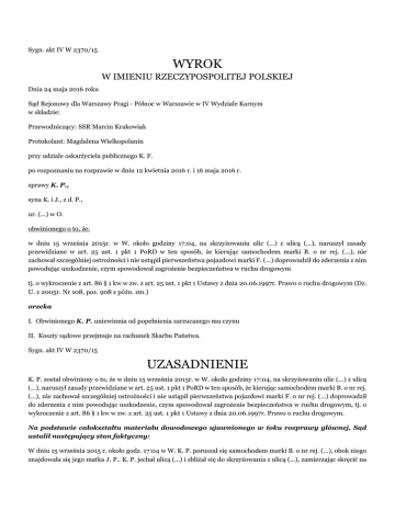 Sygn. akt IV W 2370/15 WYROK W IMIENIU RZECZYPOSPOLITEJ POLSKIEJ Dnia 24 maja 2016 roku Sąd Rejonowy dla Warszawy Pragi - Północ w Warszawie w IV Wydziale Karnym w składzie: Przewodniczący: SSR Marcin Krakowiak Protokolant: Magdalena Wielkopolanin przy udziale oskarżyciela publicznego K. F. po rozpoznaniu na rozprawie w dniu 12 kwietnia 2016 r. i 16 maja 2016 r. sprawy K. P., syna K. i J., z d. P., ur. (...) w O. obwinionego o to, że: w dniu 15 września 2015r. w W. około godziny 17:04, na skrzyżowaniu ulic (...) z ulicą (...), naruszył zasady przewidziane w art. 25 ust. 1 pkt 1 PoRD w ten sposób, że kierując samochodem marki B. o nr rej. (...), nie zachował szczególniej ostrożności i nie ustąpił pierwszeństwa pojazdowi marki F. (...) doprowadził do zderzenia z nim powodując uszkodzenie, czym spowodował zagrożenie bezpieczeństwa w ruchu drogowym tj. o wykroczenie z art. 86 § 1 kw w zw. z art. 25 ust. 1 pkt 1 Ustawy z dnia 20.06.1997r. Prawo o ruchu drogowym (Dz. U. z 2005r. Nr 108, poz. 908 z późn. zm.) orzeka I. Obwinionego K. P. uniewinnia od popełnienia zarzucanego mu czynu II. Koszty sądowe przejmuje na rachunek Skarbu Państwa. Sygn. akt IV W 2370/15 UZASADNIENIE K. P. został obwiniony o to, że w dniu 15 września 2015r. w W. około godziny 17:04, na skrzyżowaniu ulic (...) z ulicą (...), naruszył zasady przewidziane w art. 25 ust. 1 pkt 1 PoRD w ten sposób, że kierując samochodem marki B. o nr rej. (...), nie zachował szczególniej ostrożności i nie ustąpił pierwszeństwa pojazdowi marki F. o nr rej. (...) doprowadził do zderzenia z nim powodując uszkodzenie, czym spowodował zagrożenie bezpieczeństwa w ruchu drogowym, tj. o wykroczenie z art. 86 § 1 kw w zw. z art. 25 ust. 1 pkt 1 Ustawy z dnia 20.06.1997r. Prawo o ruchu drogowym. Na podstawie całokształtu materiału dowodowego ujawnionego w toku rozprawy głównej, Sąd ustalił następujący stan faktyczny: W dniu 15 września 2015 r. około godz. 17:04 w W. K. P. poruszał się samochodem marki B. o nr rej. (...), obok niego znajdowała się jego matka J. P.. K. P. jechał ulicą (...) i zbliżał się do skrzyżowania z ulicą (...), zamierzając skręcić na skrzyżowaniu w prawo. Pojazd kierowany przez K. P., dojeżdżając do skrzyżowania, poruszał się z prędkością ok. 20 km/h. Gdy K. P. zaczął hamować i próbował skręcić kierownicę w prawo, samochód nie reagował na podejmowane przez niego manewry, ale sunął do przodu ślizgając się po powierzchni. K. P. przejechał przez skrzyżowanie na wprost, wjeżdżając na pas ruchu dla przeciwnego kierunku jazdy, gdzie doszło do kolizji z samochodem marki F. (...) o nr rej. (...), skręcającym w lewą stronę z ulicy (...) w ulicę (...), w którym znajdowała się E. O.. K. P. po zderzeniu się pojazdów wysiadł z samochodu i poślizgnął się na substancji, która rozlana była na powierzchni drogi. Była to śliska ciecz, o tęczowym odcieniu, przypominająca benzynę. Substancja znajdowała się na odcinku ok. 500 metrów na całej szerokości jezdni ulicy (...), którą poruszał się K. P. i rozlewała się na skrzyżowaniu. W wyniku kolizji w samochodzie marki F. ujawniono uszkodzenia felgi i opony koła przedniego lewego, powierzchni blacharskiej lewego przedniego nadkola, powłoki lakierniczej zderzaka przedniego z lewej strony, zbitego szkła lampy przedniej lewej, zbitego szkła światła przeciwmgielnego przedniego lewego, trudności z otwieraniem drzwi przednich, bocznych lewych. W samochodzie marki B. ujawniono uszkodzenia przedniego zderzaka, powierzchni blacharskiej i lakierniczej pokrywy silnika. Powyższy stan faktyczny Sąd ustalił na podstawie: wyjaśnień obwinionego K. P. (k.14,154-156), zeznań świadków: E. O. (k.24,157-158), T. O. (k.179-180), J. P. (k.20,158-159), notatki urzędowej (k.1-2), szkicu do notatki urzędowej (k.3), protokołów oględzin (k.4-5), protokołów z przebiegu badania trzeźwości (k.6-7), informacji o wpisach w ewidencji kierowców (k.63), zdjęć nawierzchni załączonych przez obwinionego (k.66-71,75-89,93-107), zdjęć ulicy (...) z serwisu (...) na sierpień 2014 r. (k.146-152), szkicu wykonanego przez świadka T. O. na rozprawie w dniu 16 maja 2016 r. Obwiniony K. P. w trakcie postępowania wyjaśniającego przyznał się do popełnienia zarzucanego mu czynu i wyjaśnił, że w dniu 12 września 2015 r. około godziny 15:45 jechał samochodem ul. (...). Zwolnił na skrzyżowaniu żeby skręcić w ulicę (...) – zgodnie z pierwszeństwem. W momencie, gdy dojeżdżał do skrzyżowania z prędkością ok. 20 km/h, na drugim biegu, zaczął hamować. Poczuł wówczas, że samochód nie reaguje na hamowanie i skręt kół. Próbował pulsacyjnie hamować, nie udało mu się jednak zapanować nad samochodem, który sunął do przodu i uderzył w jadący pojazd. Gdy wysiadł z samochodu poślizgnął się na substancji rozlanej na całej szerokości skrzyżowania. Wezwał Policję, żeby zabezpieczyli miejsce zdarzenia, żeby nikomu nic się stało. (k.14). W trakcie rozprawy głównej obwiniony przyznał się do uderzenia w drugi pojazd, nie przyznał się do winy w zakresie spowodowania kolizji i niezachowania szczególnej ostrożności i wyjaśnił, że jechał razem z matką ul. (...) w kierunku ul. (...). To jest niewielka droga, więc prędkość tam była ok. 45-50 km, przed tym skrzyżowaniem ok. 70 m zostało zaczęte hamowanie. Dojeżdżając do skrzyżowania z ul. (...), zredukował maksymalnie prędkość do kilkunastu km/h, tak żeby skręcić w zakręt 90 stopni, to była minimalna prędkość. Na samym dojeździe przy skręceniu kierownicy i dohamowaniu, samochód nie zagregował na naciśnięcie pedału hamulca i zaczął sunąć do przodu bez jakiejkolwiek możliwości manewru. Zamiast skręcić w prawo, przejechał przez skrzyżowanie na wprost, uderzając w samochód jadący z prawej strony, mający pierwszeństwo. Uderzenie było bardzo ma