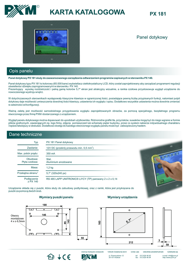 R KARTA KATALOGOWA PX 181 Panel dotykowy Opis panelu Panel dotykowy PX 181 służy do zaawansowanego zarządzania odtwarzaniem programów zapisanych w sterowniku PX 140. Panel dotykowy typu PX 181 to kolorowy (65.000 barw) wyświetlacz ciekłokrystaliczny LCD, który został zaprojektowany aby zarządzać programami regulacji oświetlenia i dźwięku zaprogramowanymi w sterowniku PX 140. Prezentujący wysoką rozdzielczość i pełną gamę kolorów 5,7" ekran jest atrakcyjny wizualnie, a ramka czołowa przystosowuje wygląd urządzenie do nowoczesnego wystroju wnętrz. W dotychczasowych sterownikach występowały klasyczne klawisze w ograniczonej ilości, posiadające pewną liczbę przypisanych funkcji, natomiast pulpit dotykowy daje możliwość umieszczenia dowolnej ilości klawiszy, ustawienia ich wyglądu i opisu. Dodatkowo wszystkie ustawienia można dowolnie zmieniać w zależności od konfiguracji. Ważną zaletą jest możliwość samodzielnego przygotowania wyglądu zaprojektowanych obrazów, za pomocą specjalnego, bezpłatnego programu stworzonego przez firmę PXM i dostarczanego z urządzeniem. Wygląd panelu dotykowego można dopasować do upodobań użytkownika. Różnorodne grafiki tła, przycisków, suwaków mogą być do niego wgrane w formie plików graficznych, zawierających np. logo firmy, zdjęcia pomieszczeń lub schematy pięter budynku, przez co system nabierze indywidualnego charakteru i będzie łatwiejszy w obsłudze. Dodatkowo dostęp do każdego stworzonego wyglądu panelu może być zabezpieczony hasłem. Dane techniczne Typ PX 181 Panel dotykowy 12V DC (przekrój przewodu min. 0,5 mm2) Zasilanie: Max. pobór prądu: 350 mA Obudowa: Płyta czołowa: Stal, Aluminium anodowane Masa: 1,2 kg Przekątna ekranu” 5,7“ (320x240 px) Podłączenie z PX 140 RS 485 LAPP UNITRONIC® LiYCY (TP) parowany 2 x 2 x 0,14 Urządzenie składa się z puszki, która służy do zabudowy podtynkowej, oraz z ramki, która jest przykręcana do puszki za pomocą dwóch śrub. Wymiary puszki panelu Wymiary urządzenia 190 146 ” 5,7 160 85 140 Otwory montażowe 4 x o 6,5mm 55 3 212 Konsole teatralne i estradowE Cyfrowe ściemniacze mocy ul. Przemysłowa 12 30-701 Kraków 58 SYSTEM dmx Sterowniki ARCHITEKTONICZNE tel: 012 626 46 92 fax: 012 626 46 94 OŚWIETLENIE LED e-mail: [email protected] http://www.pxm.pl R PX 181 Program konfiguracyjny Podczas przygotowywania konfiguracji, panel nie musi być podpięty do komputera, gdyż projekt można zapisać, a skonfigurowane ustawienia wgrać w dowolnym momencie. Wgrywanie odbywa się poprzez port USB znajdujący się pod ramką urządzenia, która jest mocowana na dwóch śrubach Do każdego elementu przyporządkowuje się określoną akcję zaprogramowaną w sterowniku PX 140. Tekst w formie komunikatów i objaśnień na ekranie panelu PX 181, może służyć jako opis lub aktywny element. Pole wyboru wywoływanego zdarzenia w kontrolerze PX 140 Aplikacja pozwala na wgrywanie własnych grafik, które można użyć do tworzenia własnych widoków panelu jako: tło, przyciski, suwaki lub odnośniki. Dodatkowo można edytować ich rozmiar, kolor oraz położenie (przemieścić, wyrównać, przyciągnąć do siatki). Przykładowe widoki panelu Konsole teatralne i estradowE Cyfrowe ściemniacze mocy ul. Przemysłowa 12 30-701 Kraków SYSTEM dmx Sterowniki ARCHITEKTONICZNE tel: 12 626 46 92 fax: 12 626 46 94 OŚWIETLENIE LED e-mail: [email protected] http://www.pxm.pl