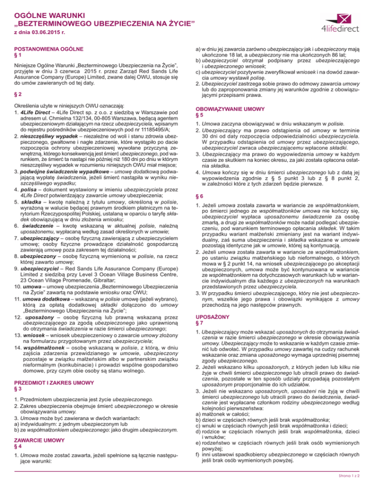 OGÓLNE WARUNKI „BEZTERMINOWEGO UBEZPIECZENIA NA ŻYCIE” z dnia 03.06.2015 r. POSTANOWIENIA OGÓLNE §1 Niniejsze Ogólne Warunki „Bezterminowego Ubezpieczenia na Życie”, przyjęte w dniu 3 czerwca 2015 r. przez Zarząd Red Sands Life Assurance Company (Europe) Limited, zwane dalej OWU, stosuje się do umów zawieranych od tej daty. §2 Określenia użyte w niniejszych OWU oznaczają: 1. 4Life Direct – 4Life Direct sp. z o.o. z siedzibą w Warszawie pod adresem ul. Chmielna 132/134, 00-805 Warszawa, będącą agentem ubezpieczeniowym działającym na rzecz ubezpieczyciela, wpisanym do rejestru pośredników ubezpieczeniowych pod nr 11185495/A; 2. nieszczęśliwy wypadek – niezależne od woli i stanu zdrowia ubezpieczonego, gwałtowne i nagłe zdarzenie, które wystąpiło po dacie rozpoczęcia ochrony ubezpieczeniowej wywołane przyczyną zewnętrzną, którego konsekwencją jest śmierć ubezpieczonego, pod warunkiem, że śmierć ta nastąpi nie później niż 180 dni po dniu w którym nieszczęśliwy wypadek w rozumieniu niniejszych OWU miał miejsce; 3. podwójne świadczenie wypadkowe – umowę dodatkową podwajającą wypłatę świadczenia, jeżeli śmierć nastąpiła w wyniku nieszczęśliwego wypadku; 4. polisa – dokument wystawiony w imieniu ubezpieczyciela przez 4Life Direct potwierdzający zawarcie umowy ubezpieczenia; 5. składka – kwotę należną z tytułu umowy, określoną w polisie, wyrażoną w walucie będącej prawnym środkiem płatniczym na terytorium Rzeczypospolitej Polskiej, ustalaną w oparciu o taryfę składek obowiązującą w dniu złożenia wniosku; 6. świadczenie – kwotę wskazaną w aktualnej polisie, należną uposażonemu, wypłacaną według zasad określonych w umowie; 7. ubezpieczający – osobę fizyczną zawierającą z ubezpieczycielem umowę; osoby fizyczne prowadzące działalność gospodarczą zawierają umowę poza zakresem tej działalności; 8. ubezpieczony – osobę fizyczną wymienioną w polisie, na rzecz której zawarto umowę; 9. ubezpieczyciel – Red Sands Life Assurance Company (Europe) Limited z siedzibą przy Level 3 Ocean Village Business Centre, 23 Ocean Village Promenade, Gibraltar; 10. umowa – umowę ubezpieczenia „Bezterminowego Ubezpieczenia na Życie” zawartą na podstawie wniosku oraz OWU; 11. umowa dodatkowa – wskazaną w polisie umowę (jeżeli wybrano), którą za opłatą dodatkowej składki dołączono do umowy „Bezterminowego Ubezpieczenia na Życie”; 12. uposażony – osobę fizyczną lub prawną wskazaną przez ubezpieczającego za zgodą ubezpieczonego jako uprawnioną do otrzymania świadczenia w razie śmierci ubezpieczonego; 13. wniosek – wniosek ubezpieczeniowy o zawarcie umowy złożony na formularzu przygotowanym przez ubezpieczyciela; 14. współmałżonek – osobę wskazaną w polisie, z którą, w dniu zajścia zdarzenia przewidzianego w umowie, ubezpieczony pozostaje w związku małżeńskim albo w partnerskim związku nieformalnym (konkubinacie) i prowadzi wspólne gospodarstwo domowe, przy czym obie osoby są stanu wolnego. PRZEDMIOT I ZAKRES UMOWY §3 1. Przedmiotem ubezpieczenia jest życie ubezpieczonego. 2. Zakres ubezpieczenia obejmuje śmierć ubezpieczonego w okresie obowiązywania umowy. 3. Umowa może być zawierana w dwóch wariantach: a) indywidualnym: z jednym ubezpieczonym lub b) ze współmałżonkiem ubezpieczonego: jako drugim ubezpieczonym. ZAWARCIE UMOWY §4 1. Umowa może zostać zawarta, jeżeli spełnione są łącznie następujące warunki: a) w dniu jej zawarcia zarówno ubezpieczający jak i ubezpieczony mają ukończone 18 lat, a ubezpieczony nie ma ukończonych 86 lat; b) ubezpieczyciel otrzymał podpisany przez ubezpieczającego i ubezpieczonego wniosek; c) ubezpieczyciel pozytywnie zweryfikował wniosek i na dowód zawarcia umowy wystawił polisę. 2. Ubezpieczyciel zastrzega sobie prawo do odmowy zawarcia umowy lub do zaproponowania zmiany jej warunków zgodnie z obowiązującymi przepisami prawa. OBOWIĄZYWANIE UMOWY §5 1. Umowa zaczyna obowiązywać w dniu wskazanym w polisie. 2. Ubezpieczający ma prawo odstąpienia od umowy w terminie 30 dni od daty rozpoczęcia odpowiedzialności ubezpieczyciela. W przypadku odstąpienia od umowy przez ubezpieczającego, ubezpieczyciel zwraca ubezpieczającemu wpłacone składki. 3. Ubezpieczający ma prawo do wypowiedzenia umowy w każdym czasie ze skutkiem na koniec okresu, za jaki została opłacona ostatnia składka. 4. Umowa kończy się w dniu śmierci ubezpieczonego lub z datą jej wypowiedzenia zgodnie z § 5 punkt 3 lub z § 8 punkt 2, w zależności które z tych zdarzeń będzie pierwsze. §6 1. Jeżeli umowa została zawarta w wariancie ze współmałżonkiem, po śmierci jednego ze współmałżonków umowa nie kończy się, ubezpieczyciel wypłaca uposażonemu świadczenie za osobę zmarłą, a drugi ze współmałżonków może nadal podlegać ubezpieczeniu, pod warunkiem terminowego opłacania składek. W takim przypadku wariant małżeński zmieniany jest na wariant indywidualny, zaś suma ubezpieczenia i składka wskazane w umowie pozostają identyczne jak w umowie, której są kontynuacją. 2. Jeżeli umowa została zawarta w wariancie ze współmałżonkiem, po ustaniu związku małżeńskiego lub nieformalnego, o których mowa w § 2 punkt 14, na wniosek ubezpieczającego po akceptacji ubezpieczonych, umowa może być kontynuowana w wariancie ze współmałżonkiem na dotychczasowych warunkach lub w wariancie indywidualnym dla każdego z ubezpieczonych na warunkach przedstawionych przez ubezpieczyciela. 3. W przypadku śmierci ubezpieczającego, który nie jest ubezpieczonym, wszelkie jego prawa i obowiązki wynikające z umowy przechodzą na jego następców prawnych. UPOSAŻONY §7 1. Ubezpieczający może wskazać uposażonych do otrzymania świadczenia w razie śmierci ubezpieczonego w okresie obowiązywania umowy. Ubezpieczający może to wskazanie w każdym czasie zmi