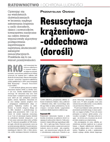 RATOWNICTWO I OCHRONA LUDNOŚCI Opierając się na wieloletnich doświadczeniach w leczeniu nagłego zatrzymania krążenia u osób dorosłych, dzieci i noworodków, towarzystwa medyczne na całym świecie wypracowały algorytmy postępowania zapewniające najwyższą skuteczność zabiegów resuscytacyjnych. Przekłada się to na wzrost przeżywalności. Przemysław Osiński Resuscytacja krążeniowo-oddechowa (dorośli) RKO czyli resuscytacja krążeniowo-oddechowa to czynności medyczne mające na celu podtrzymanie i przywrócenie podstawowych funkcji życiowych, tzn. krążenia krwi i oddechu, jeśli doszło do ich zatrzymania. Obecnie obowiązujące wytyczne resuscytacji krążeniowo-oddechowej zostały opublikowane w 2010 r. przez Europejską Radę Resuscytacji – European Resuscitation Council (ERC). U osób dorosłych główną przyczyną nagłego zatrzymania krążenia (NZK) są choroby serca, w tym m.in. choroba niedokrwienna mięśnia sercowego. Do zatrzymania akcji serca może również dojść w następstwie przyczyn zewnętrznych, takich jak uraz, podtopienie, porażenie prądem, zatrucie, hipotermia. Zatrzymanie akcji serca skutkuje ustaniem przepływu krwi i postępującym niedotlenieniem całego organizmu. Najbardziej wrażliwe na niedotlenienie są komórki mózgowe, dlatego już po kilku sekundach u poszkodowanego następuje utrata przytomności. Jeśli w tym momencie nie zostanie rozpoczęta resuscytacja, to po 4 min od zatrzymania krążenia dochodzi do uszkodzenia komórek mózgowych, a po 10 min szanse uratowania takiej osoby są bliskie zeru. W większości przypadków do NZK dochodzi nagle; człowiek traci przytomność, osuwa się na ziemię i przestaje oddychać. Czasami zatrzymanie krążenia może być poprzedzone wystąpieniem niepokojących objawów: bólu w klatce piersiowej, szybko narastającej duszności (zwiększony 10 1 wysiłek oddechowy, przyspieszony oddech), zaburzeń świadomości, bladości, sinicy, potliwości i ochłodzenia skóry, słabo wyczuwalnego tętna lub jego braku na tętnicy promieniowej. Są one związane z rozwojem choroby i pogorszeniem wydolności układu krążeniowo-oddechowego. Rozpoznanie NZK Rozpoznanie zatrzymania krążenia u osoby dorosłej stwierdzamy na podstawie dwóch występujących jednocześnie objawów: braku przytomności i nieprawidłowego (agonalnego) oddechu – lub w ogóle jego braku. Ponieważ ocena obecności tętna na tętnicy szyjnej może sprawiać trudności, użycie tej metody – jako uzupełniającej – jest zarezerwowane wyłącznie dla osób z wykształceniem medycznym. Potrzeba tu po 10/2014 prostu klinicznego doświadczenia w badaniu oznak życia. W takim przypadku ocena tętna wykonywana jest jednocześnie z oceną oddechu i nie powinna trwać dłużej niż 10 s. W pierwszej kolejności należy sprawdzić stan przytomności poszkodowanego, to znaczy sprawdzić, czy reaguje na bodźce. W tym celu mocno potrząsamy za ramiona i głośno pytamy: „Czy wszystko w porządku ?”. Gdy dana osoba nie reaguje – nie otwiera oczu, nie porusza się, nie odpowiada, uznajemy ją za nieprzytomną. Gdy przystępujemy do oceny oddechu, poszkodowany powinien znajdować się w pozycji leżącej, z drogami oddechowymi udrożnionymi poprzez odgięcie głowy wraz z uniesieniem żuchwy. Wyjątkiem są osoby z podejrzeniem obrażeń szyjnego odcinka rdzenia kręgowego. Resuscytacja Przed przystąpieniem do RKO należy ułożyć ratowanego na plecach, na twardej i równej powierzchni. Może to oznaczać konieczność przeniesienia go z łóżka na podłogę czy z pochylonego terenu na płaski. Resuscytację osoby dorosłej rozpoczynamy od 30 uciśnięć klatki piersiowej, a następnie udrożnienia dróg oddechowych i wykonania dwóch oddechów ratowniczych, zgodnie ze schematem C-A-B (Chest compressions, Airway, Breathing – uciskanie klatki piersiowej, drogi oddechowe, oddech). Uciskanie klatki piersiowej Prawidłowe wykonanie uciśnięć klatki piersiowej wymaga odpowiedniej techniki. Trzeba zwrócić uwagę na właściwe tempo i głębokość uciśnięć. Ratownik klęka obok poszkodowanego i umieszcza nasadę jednej dłoni na środku klatki piersiowej, tj. dolnej połowie mostka (fot. 1). Nasadę drugiej dłoni kładzie na powierzchni grzbietowej pierwszej i splata palce obu rąk tak, aby odsunąć palce dolnej ręki od powierzchni klatki piersiowej (fot. 2). Technika ta zapobiega przenoszeniu nacisku na żebra i ich ewentualnemu złamaniu. Ręce powinny być wyprostowane w stawach łokciowych i ustawione prostopadle do klatki piersiowej. Mostek uciskamy na głębokość nie mniejszą niż 5 cm (maks. 6 cm), z częstotliwością co najmniej 100/min (maks. 120/min). Po każdym uciśnięciu bez odrywania rąk zwalniamy nacisk na klatkę piersiową, pozwalając jej na powrót do poprzedniego kształtu. Czas uciśnięcia powinien być równy czasowi zwalniania ucisku mostka. Zwracamy uwagę, aby utrzymywać właściwe położenie rąk na klatce piersiowej, unikając uciskania dolnego końca mostka i górnej części brzucha. W sytuacji, gdy dostęp do poszkodowanego jest utrudniony, dopuszcza się prowadzenie uciśnięć klatki piersiowej przez osobę stojącą w rozkroku nad pacjentem lub zza jego głowy. 2 Wentylacja Wentylację płuc prowadzimy za pomocą worka samorozprężalnego przez maskę twarzową o odpowiednim rozmiarze wraz z dołączonym rezerwuarem zasilanym tlenem o przepływie co najmniej 15 l na minutę. Przed rozpoczęciem wentylacji konieczne jest udrożnienie dróg oddechowych i wprowadzenie do jamy ustnej rurki ustno-gardłowej. Pozwoli to wdmuchiwanemu powietrzu przedostać się przez usta do płuc. Jest to niezbędne w przypadku niedrożności jamy nosowej. Maskę przykładamy do twarzy pacjenta, a następnie dociskamy ją, jednocześnie utrzymując drożność dróg oddechowych, i wykonujemy dwa wdechy. Czas trwania pojedynczego wdechu powinien wynosić około 1 s, a całkowity czas wykona