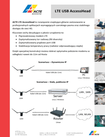LTE USB AccessHead ACTE LTE AccessHead to rozwiązanie znajdujące główne zastosowanie w profesjonalnych aplikacjach wymagających szerokiego pasma oraz stabilnego dostępu do sieci 4G. Kluczowe cechy decydujące o jakości urządzenia to: Pięciozakresowy modem LTE Zoptymalizowany tor radiowy (RX diversity) Zoptymalizowany prądowo port USB Stabilizacja temperatury pracy (radiator odprowadzający ciepło) Dzięki specjalnej konstrukcji możesz dobrać optymalne położenie modemu w odległości nawet do 11m od Hosta Scenariusz – Dynamiczne IP Kabel USB (do 11m) PC UAH Linux / Windows Scenariusz – Stałe, publiczne IP LAN , SAN Kabel USB (do 11m) Server UAH Linux / Windows LAN, WLAN Kabel USB (do 11m) UAH Router Linux Specyfikacja Techniczna Modem Sierra Wireless MC7304* Obsługiwane technologie LTE,HSPA+, EDGE, GPRS, GSM Max. prędkość transmisji download/upload 100 Mbps/50Mbps Obsługiwane pasma LTE 800/900/1800/2100/2600 MHz WCDMA 900/2100 MHz EDGE/GPRS/GSM 900/1800/1900 Interfejs komunikacyjny USB 2.0 High Speed Interfejs karty SIM 1.8V lub 3V AntennaDiversity Wymiary 115x190x37mm Waga 270g Temp. zakres pracy -25°C to +60°C System Operacyjny Windows, Linux Software/sterowniki Sierra Watcher: http://acte.pl/produkty/urzadzenia-acte/acte/lte-accesshead Obudowa Aluminium Chłodzenie Pasywne Akcesoria Anteny SMA, repeter USB na kablu 11m lub kabel USB 2m, uchwyt montażowy * Istnieje możliwość instalowania innych modemów Sierra Wireless z rodziny AirPrime seria MC. Wersje produktu, kody zamówieniowe: UAH-MC7304-1800-STD UAH-MC7304-1800-EXT UAH – USB AccessHead MC7304 – oparty na module MC7304 1800 – tor radiowy zoptymalizowany dla częstotliwości 1800MHz do 2600MHz STD – zestaw standardowy z 2m kablem USB EXT – zestaw rozszerzony z 11-metrowym kablem z repeaterem Treść zawarta w niniejszej karcie katalogowej stanowi własność firmy ACTE i służy celom informacyjnym. Firma ACTE zastrzega sobie możliwość dokonywania zmian w czasie , wraz z pojawieniem się nowych funkcji urządzenia.