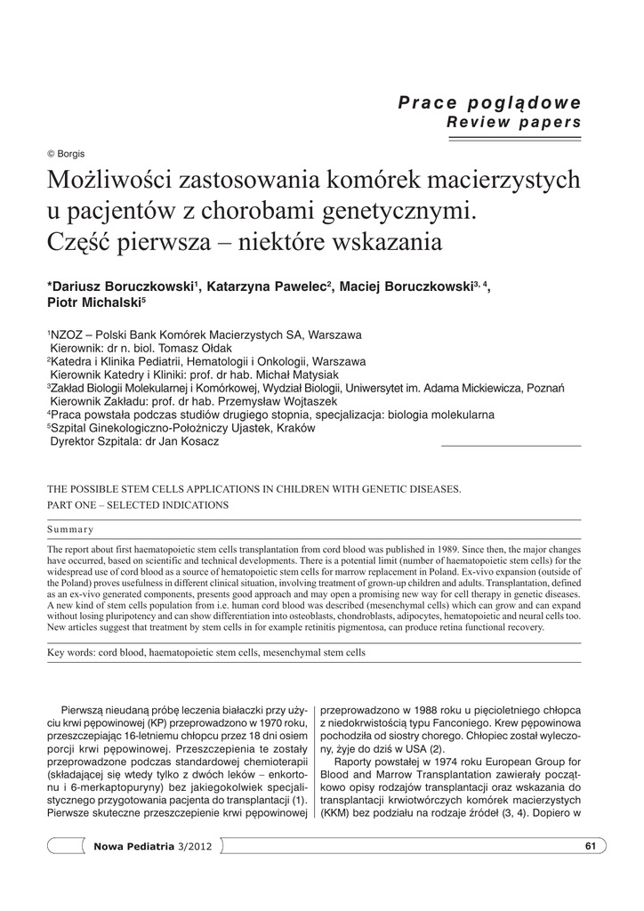 Prace poglądowe Review papers © Borgis Możliwości zastosowania komórek macierzystych u pacjentów z chorobami genetycznymi. Część pierwsza – niektóre wskazania *Dariusz Boruczkowski1, Katarzyna Pawelec2, Maciej Boruczkowski3, 4, Piotr Michalski5 NZOZ – Polski Bank Komórek Macierzystych SA, Warszawa Kierownik: dr n. biol. Tomasz Ołdak 2 Katedra i Klinika Pediatrii, Hematologii i Onkologii, Warszawa Kierownik Katedry i Kliniki: prof. dr hab. Michał Matysiak 3 Zakład Biologii Molekularnej i Komórkowej, Wydział Biologii, Uniwersytet im. Adama Mickiewicza, Poznań Kierownik Zakładu: prof. dr hab. Przemysław Wojtaszek 4 Praca powstała podczas studiów drugiego stopnia, specjalizacja: biologia molekularna 5 Szpital Ginekologiczno−Położniczy Ujastek, Kraków Dyrektor Szpitala: dr Jan Kosacz 1 THE POSSIBLE STEM CELLS APPLICATIONS IN CHILDREN WITH GENETIC DISEASES. Part one – SELECTED INDICATIONS Summary The report about first haematopoietic stem cells transplantation from cord blood was published in 1989. Since then, the major changes have occurred, based on scientific and technical developments. There is a potential limit (number of haematopoietic stem cells) for the widespread use of cord blood as a source of hematopoietic stem cells for marrow replacement in Poland. Ex-vivo expansion (outside of the Poland) proves usefulness in different clinical situation, involving treatment of grown-up children and adults. Transplantation, defined as an ex-vivo generated components, presents good approach and may open a promising new way for cell therapy in genetic diseases. A new kind of stem cells population from i.e. human cord blood was described (mesenchymal cells) which can grow and can expand without losing pluripotency and can show differentiation into osteoblasts, chondroblasts, adipocytes, hematopoietic and neural cells too. New articles suggest that treatment by stem cells in for example retinitis pigmentosa, can produce retina functional recovery. Key words: cord blood, haematopoietic stem cells, mesenchymal stem cells Pierwszą nieudaną próbę leczenia białaczki przy użyciu krwi pępowinowej (KP) przeprowadzono w 1970 roku, przeszczepiając 16-letniemu chłopcu przez 18 dni osiem porcji krwi pępowinowej. Przeszczepienia te zostały przeprowadzone podczas standardowej chemioterapii (składającej się wtedy tylko z dwóch leków – enkortonu i 6-merkaptopuryny) bez jakiegokolwiek specjalistycznego przygotowania pacjenta do transplantacji (1). Pierwsze skuteczne przeszczepienie krwi pępowinowej Nowa Pediatria 3/2012 przeprowadzono w 1988 roku u pięcioletniego chłopca z niedokrwistością typu Fanconiego. Krew pępowinowa pochodziła od siostry chorego. Chłopiec został wyleczony, żyje do dziś w USA (2). Raporty powstałej w 1974 roku European Group for Blood and Marrow Transplantation zawierały początkowo opisy rodzajów transplantacji oraz wskazania do transplantacji krwiotwórczych komórek macierzystych (KKM) bez podziału na rodzaje źródeł (3, 4). Dopiero w 61 Dariusz Boruczkowski i wsp. 2002 roku, w trzecim raporcie EBMT, po raz pierwszy został zamieszczony podział KKM na trzy rodzaje (źródła) używane do transplantacji (szpik, mobilizowana krew obwodowa, krew pępowinowa) oraz po raz pierwszy zamieszczono skrócony opis warunków koniecznych do spełnienia przed transplantacją KKM z krwi pępowinowej (5). W przedostatnim (6) oraz ostatnim (7) raporcie EBMT, opublikowanych odpowiednio w 2006 oraz 2010 roku, stwierdzono po raz kolejny, że wskazania do transplantacji komórek macierzystych KP są takie same, jak w przypadku komórek macierzystych pochodzących ze szpiku kostnego lub z mobilizowanej krwi obwodowej. Według EBMT transplantacje KKM przeprowadza się w określonych jednostkach chorobowych już w sposób standardowy (standard of care) – co oznacza, że sposób przeprowadzenia procedury transplantacji KM został dobrze poznany, a jej wyniki zostały zdefiniowane i są statystycznie lepsze od wyników leczenia prowadzonego bez udziału transplantacji KM. Standardowe wskazania do transplantacji komórek macierzystych (pochodzących np. z KP) obejmują kilkadziesiąt chorób, a wśród nich m.in. następujące choroby uwarunkowane genetycznie: a) pierwotne niedobory odporności, b) hemoglobinopatie – talasemie, c) niedokrwistość sierpowatokrwinkową, d) wrodzone defekty szpiku kostnego (niedokrwistość Fanconiego i niedokrwistość Blackfana-Diamonda), e) choroby spichrzeniowe – mukopolisacharydozę I typu, f) osteopetrozę (6, 7). A) Pierwotne niedobory odporności – zostały sklasyfikowane w ośmiu kategoriach: 1. złożone niedobory odporności, 2. niedobory z przewagą zaburzeń produkcji przeciwciał, 3. inne dobrze zdefiniowane niedobory odporności, 4. choroby dysregulacji odpowiedzi immunologicznej, 5. wrodzone zaburzenia liczby i/lub funkcji komórek żernych, 6. zaburzenia odporności naturalnej, 7. zaburzenia odpowiedzi zapalnej, 8. niedobory układu dopełniacza (8). W pierwszej grupie chorób, obejmującej złożone niedobory odporności – genetycznie uwarunkowane ciężko przebiegające zaburzenia kliniczne – transplantacje KKM przeprowadza się najczęściej w zespole ciężkiego złożonego niedoboru odporności (ang. severe combined immune deficiency – SCID) oraz w zespole Omenna. W obydwu zespołach sposób przygotowania biorcy do transplantacji zależy od rodzaju dawcy (9). W przypadku przeprowadzenia transplantacji w SCID jeszcze wewnątrzmacicznie (przed 14 tygodniem), chory biorca nie wymaga ze względu na przebieg ontogenezy żadnego kondycjonowania, a ze względu na odizolowanie od środowiska profilaktyki zakażeń bakteryjnych, wirusowych lub grzybiczych. Niedobór CD40L podlega również leczeniu przeszczepieniem KKM, jednak w tym przypadku termin przeprowadzenia transplantacji dodatkowo zależy od rodzaju dawcy (spokrewniony lub niespokrewniony) i jego stopnia zgodności z biorcą. Wymienia