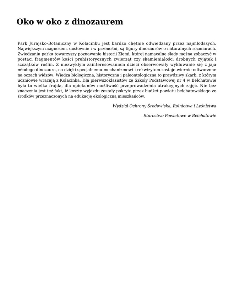 Oko w oko z dinozaurem Park Jurajsko-Botaniczny w Kołacinku jest bardzo chętnie odwiedzany przez najmłodszych. Największym magnesem, dosłownie i w przenośni, są figury dinozaurów o naturalnych rozmiarach. Zwiedzaniu parku towarzyszy poznawanie historii Ziemi, której namacalne ślady można zobaczyć w postaci fragmentów kości prehistorycznych zwierząt czy skamieniałości drobnych żyjątek i szczątków roślin. Z niezwykłym zainteresowaniem dzieci obserwowały wykluwanie się z jaja młodego dinozaura, co dzięki specjalnemu mechanizmowi i rekwizytom zostaje wiernie odtworzone na oczach widzów. Wiedza biologiczna, historyczna i paleontologiczna to prawdziwy skarb, z którym uczniowie wracają z Kołacinka. Dla pierwszoklasistów ze Szkoły Podstawowej nr 4 w Bełchatowie była to wielka frajda, dla opiekunów możliwość przeprowadzenia atrakcyjnych zajęć. Nie bez znaczenia jest też fakt, iż koszty wyjazdu zostały pokryte przez budżet powiatu bełchatowskiego ze środków przeznaczonych na edukację ekologiczną mieszkańców. Wydział Ochrony Środowiska, Rolnictwa i Leśnictwa Starostwo Powiatowe w Bełchatowie