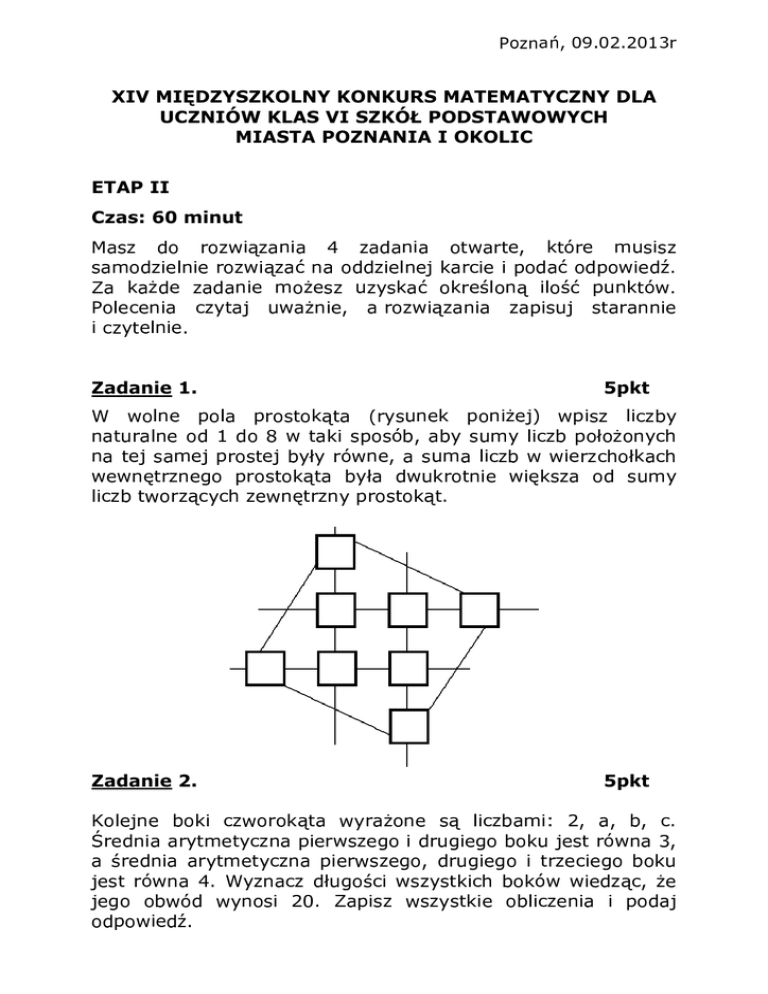 XIV MIĘDZYSZKOLNY KONKURS MATEMATYCZNY DLA UCZNIÓW KLAS VI SZKÓŁ PODSTAWOWYCH MIASTA POZNANIA I OKOLIC ETAP II Czas: 60 minut ! " !# $ %" %&' ( ) ) *" +! !+" % ' ,!$ $*# ) % # $*!' Zadanie 1. 5pkt Zadanie 2. 5pkt - ! %! % .* %)#/ % !$0* ! 1 2 %0 0* * !$0 %3 )*$4 # # %# 0*3 * !$0 $43 $4 56 % 0*3 5 * !$0 $*$4 5* %' 7!# 0 $ *) !$0 8 9 0 $' : **$ %6 66 0 # ; + **$ %6 66 $6 0 # ' -*$ 3 6+$ *$4 0 $ ) # 6 0 * 9< ' (% * 0 !$ %# %&' Zadanie 3 ' 5pkt $4* 3 # 5 1 # *$4 0*$4 % *$4 ** % %)* * ' 0 !$ 0# 5+" 0 )*6 $4 *' (% * 0 !$' -* %# ' Zadanie 4. 5pkt 7 ! 6 +* * $4$ %" 1< ' ) 0" $ 8 %5$ 5$4 % 9 )* %5$ 5$4 % ; )* b) %5$ 5$4 % )* c) a) % * $4' . * # 6 ) %" # % ! 0 %/