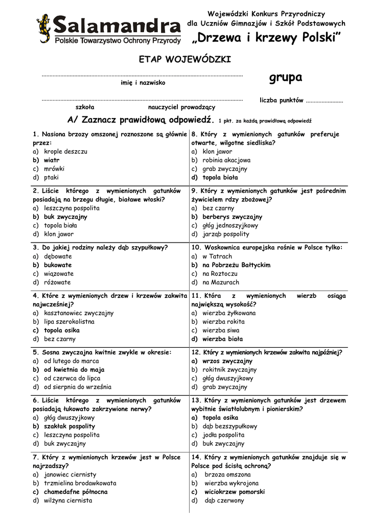 Wojewódzki Konkurs Przyrodniczy dla Uczniów Gimnazjów i Szkół Podstawowych „Drzewa i krzewy Polski” ETAP WOJEWÓDZKI .................................................................................................................................. imię i nazwisko .................................................................................................................................. szkoła nauczyciel prowadzący A/ Zaznacz prawidłową odpowiedź. grupa liczba punktów ........................ 1 pkt. za każdą prawidłową odpowiedź 1. Nasiona brzozy omszonej roznoszone są głównie 8. Który z wymienionych gatunków preferuje otwarte, wilgotne siedliska? przez: a) klon jawor a) krople deszczu b) robinia akacjowa b) wiatr c) grab zwyczajny c) mrówki d) topola biała d) ptaki 2. Liście którego z wymienionych gatunków posiadają na brzegu długie, białawe włoski? a) leszczyna pospolita b) buk zwyczajny c) topola biała d) klon jawor 9. Który z wymienionych gatunków jest pośrednim żywicielem rdzy zbożowej? a) bez czarny b) berberys zwyczajny c) głóg jednoszyjkowy d) jarząb pospolity 3. a) b) c) d) 10. Woskownica europejska rośnie w Polsce tylko: a) w Tatrach b) na Pobrzeżu Bałtyckim c) na Roztoczu d) na Mazurach Do jakiej rodziny należy dąb szypułkowy? dębowate bukowate wiązowate różowate 4. Które z wymienionych drzew i krzewów zakwita 11. Która z wymienionych najwcześniej? największą wysokość? a) kasztanowiec zwyczajny a) wierzba żyłkowana b) lipa szerokolistna b) wierzba rokita c) topola osika c) wierzba siwa d) bez czarny d) wierzba biała 5. a) b) c) d) wierzb osiąga Sosna zwyczajna kwitnie zwykle w okresie: od lutego do marca od kwietnia do maja od czerwca do lipca od sierpnia do września 12. Który z wymienionych krzewów zakwita najpóźniej? a) wrzos zwyczajny b) rokitnik zwyczajny c) głóg dwuszyjkowy d) grab zwyczajny 6. Liście którego z wymienionych gatunków posiadają łukowato zakrzywione nerwy? a) głóg dwuszyjkowy b) szakłak pospolity c) leszczyna pospolita d) buk zwyczajny 13. Który z wymienionych gatunków jest drzewem wybitnie światłolubnym i pionierskim? a) topola osika b) dąb bezszypułkowy c) jodła pospolita d) buk zwyczajny 7. Który z wymienionych krzewów jest w Polsce najrzadszy? a) janowiec ciernisty b) trzmielina brodawkowata c) chamedafne północna d) wilżyna ciernista 14. Który z wymienionych gatunków znajduje się w Polsce pod ścisłą ochroną? a) brzoza omszona b) wierzba wykrojona c) wiciokrzew pomorski d) dąb czerwony 15. Owoce którego z wymienionych krzewów i drzew wykorzystywane są przy wędzeniu produktów mięsnych i ryb? a) berberys zwyczajny b) kruszyna pospolita c) jarząb pospolity d) jałowiec pospolity 19. Jak nazywamy las o strukturze kępkowodolinkowej, rosnący w miejscach gdzie stagnuje woda? a) mszar b) oles c) grąd d) łęg 16. Liście którego z gatunków są jasnozielono lub szaro owłosione unerwione? a) brzoza niska b) dąb szypułkowy c) irga zwyczajna d) buk zwyczajny 20. Który z wymienionych ciernie? a) róża dzika b) dereń świdwa c) ligustr pospolity d) rokitnik zwyczajny od spodu i bogato gatunków posiada 17. Wierzba żyłkowana występuje w Polsce: a) na Pomorzu b) w Wielkopolsce c) w Górach Świętokrzyskich d) w Tatrach i na Babiej Górze 21. Które części cisa pospolitego nie są trujące? a) liście b) osnówka c) kora d) korzenie 18. Która z wymienionych cech dotyczy wiciokrzewu pomorskiego? a) krzew o charakterze liany b) kwiaty mają kolor fioletowy c) owocem jest strąk d) liście osadzone są na długich ogonkach 22. Który z wymienionych asymetryczną nasadę liścia? a) wiąz szypułkowy b) dąb czerwony c) klon zwyczajny d) grab zwyczajny gatunków posiada B/ Odpowiedz na pytania. 23. Jaki kolor kwiatów ma czeremcha zwyczajna? 25. Do jakiej miotlasty? rodziny BIAŁY – 1 pkt. MOTYLKOWATE – 1 pkt. należy 24. Wymień występujące u nas dziko gatunki wiązów. 26. Podaj nazwę gatunku SZYPUŁKOWY (LIMAK), GORSKI (SZORSTKI, nazywany jest łozą. BRZOST), POSPOLITY (POLNY) 0,5 za każdą prawidłową odp. WIERZBA SZARA – 1 pkt. C/ Podaj nazwy drzew przedstawionych na rysunkach. (27 – nazwa gatunkowa, 28 – rodzajowa) 1 pkt. za każdą prawidłową odpowiedź 27. 28. DĄB BEZSZYPUŁKOWY BRZOZA żarnowiec krzewu, który