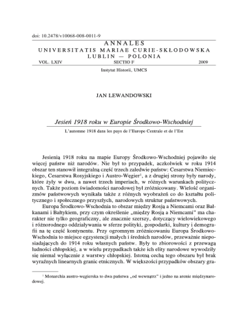 doi: 10.2478/v10068-008-0011-9 18 JAN LEWANDOWSKI niczne miêdzy rejonami zwartego zasiedlenia grup narodowych mia³y charakter szerokich pasów pogranicznych, gdzie ludnoæ zró¿nicowana etnicznie, religijnie i jêzykowo mieszka³a od stuleci. Powstawanie w koñcowych latach Wielkiej Wojny niepodleg³ych pañstw narodowych2, sukcesorów trzech imperiów, by³o, w d³u¿szej perspektywie, rezultatem XIX-wiecznych procesów narodotwórczych, przyspieszonych po uw³aszczeniu ch³opów. Procesy te mia³y zró¿nicowany zasiêg i przebiega³y w ró¿nym tempie, zarówno w odniesieniu do poszczególnych narodów, jak i na obszarach zamieszka³ych przez poszczególne nacje.3 Wydarzenia z lat 19141918 przyspieszy³y proces kszta³towania siê wiadomoci narodowej przede wszystkim podstawowej grupy ludnoci ch³opów, ale te¿ spowodowa³y ogromn¹ radykalizacjê nastrojów i postaw sprzyjaj¹cych bolszewikom.4 Jesieni¹ 1918 roku sytuacja militarna i polityczna by³a sprzyjaj¹ca dla realizacji d¹¿eñ poszczególnych narodów do utworzenia w³asnych, suwerennych organizmów pañstwowych. Prawie ca³y ten obszar znajdowa³ siê we w³adzy pañstw centralnych: Niemiec i Austro-Wêgier, stanowi¹c czy to czêæ ich terytorium pañstwowego (Czechy, S³owacja, Galicja, l¹sk Austriacki, Wielkopolska, Górny l¹sk, Pomorze), czy te¿ teren okupowany przez ich armie, które w lutym i marcu 1918 roku dotar³y do linii NarwaPskówMohylewRostów nad DonemMorze Azowskie. Wojska pañstw centralnych (przede wszystkim armia niemiecka) realizowa³y imperialistyczne cele II Rzeszy, ale te¿ broni³y terenów i powstaj¹cych na nich narodowych struktur pañstwowych na zachód od linii frontu przed rewolucj¹ wiatow¹, która mia³a kszta³t oddzia³ów Robotniczo-Ch³opskiej Armii Czerwonej i organizowanych na jej ty³ach organów w³adzy radzieckiej. Rola Niemiec na tym terenie nie by³a jednak¿e wcale jednoznaczna, z jednej strony ich armie chroni³y przed agresj¹ bolszewick¹, ale z drugiej Niemcy nie uznawali m³odych pañstw narodowych czy wrêcz zwalczali je (Estonia, £otwa), a nawet jeli je wspierali (Ukraina) lub tylko tolerowali, to ograniczali lub uniemo¿liwiali budowê ich struktur pañstwowych, zw³aszcza si³ porz¹dkowych i wojska, a przy tym prowadzili bezwzglêdn¹ eksploatacjê wyczerpanych wojn¹ terenów. Tymczasem na pocz¹tku jesieni 1918 roku klêska pañstw centralnych by³a W artykule pomijam w¹tek polski, wêgierski i rumuñski. wiadomoæ narodowa Ukraiñców galicyjskich by³a bardziej rozwiniêta ni¿ ich pobratymców w imperium rosyjskim. 4 W literaturze polskiej szerzej proces ten omówi³ J. C h l e b o w c z y k w pracach: O prawie do bytu ma³ych i m³odych narodów. Kwestia narodowa i procesy narodotwórcze we wschodniej Europie rodkowej w dobie kapitalizmu (od koñca XVIII w. do pocz¹tków XX w.), Warszawa Kraków 1983 i Miêdzy dyktatem, realiami a prawem do samostanowienia. Prawo do samookrelenia i problem granic we wschodniej Europie rodkowej w pierwszej w wojnie wiatowej oraz po jej zakoñczeniu, Warszawa 1988. 2 3 JESIEÑ 1918 ROKU W EUROPIE RODKOWO-WSCHODNIEJ 19 ju¿ widoczna i nieuchronna. W listopadzie przesta³y istnieæ Austro-Wêgry. Rozejm, a w³aciwie kapitulacjê podpisa³y ogarniête p³omieniem rewolucji Niemcy, zobowi¹zuj¹c siê do uzgodnionego ze zwyciêzcami wycofania swoich wojsk ze wszystkich okupowanych terenów. Do ogólnego obrazu sytuacji trzeba jeszcze dodaæ ogromne wyczerpanie ekonomiczne, sprzyjaj¹ce radykalizacji nastrojów i podatnoci na has³a bolszewickie z zewn¹trz i od wewn¹trz, oraz ogromn¹ wêdrówkê ludów powracaj¹cych do domów ¿o³nierzy, jeñców wojennych i cywilnych bie¿eñców, a tak¿e kolejnych uchodców na Zachód, tym razem z ogarniêtej rewolucj¹ i wojn¹ domow¹ Rosji. Budowa w³asnych narodowych struktur pañstwowych rozpoczê³a siê raczej jeszcze przed jesieni¹ 1918 roku, czy to pod rz¹dami okupacyjnymi, czy te¿ w ramach demokratyzuj¹cego siê po rewolucji lutowej pañstwa rosyjskiego. W wielu przypadkach istotn¹ rolê w tych poczynaniach odegrali polityczni emigranci i stworzone przez nich struktury o charakterze pañstwowym, zarówno na Zachodzie, jak i w Rosji.5 Jesieni¹ 1918 roku, w zale¿noci od sytuacji militarnej (£otwa, Bia³oru i Ukraina by³y w latach 19151918 podzielone lini¹ frontu), w³asnych wysi³ków i polityki w³adz Niemiec, Austro-Wêgier oraz Rosji, poszczególne narody mia³y ró¿ny dorobek i zró¿nicowane dowiadczenia w budowie w³asnych struktur pañstwowych. Dzia³ania wojenne nie objê³y ziem zamieszkanych przez Czechów i S³owaków, jednak¿e po wybuchu wojny ich warunki ¿ycia narodowego wyranie siê pogorszy³y. Oba narody ¿y³y wprawdzie pod jednym ber³em, ale w dwu ró¿nych czêciach dualistycznej monarchii, a S³owacy byli poddani silnej presji madziaryzacyjnej. W tych warunkach w pierwszych latach wojny najbardziej aktywna politycznie by³a emigracja w Europie Zachodniej i Ameryce Pó³nocnej, deklaruj¹ca d¹¿enia do utworzenia wspólnego pañstwa czechos³owackiego. W Pary¿u utworzono w 1915 roku Czeski Komitet Zagraniczny, przekszta³cony póniej w Czechos³owack¹ Radê Narodow¹. Demonstracje na rzecz w³asnej pañstwowoci nasili³y siê w roku 1917. W tym samym roku powsta³y kilkudziesiêciotysiêczne czechos³owackie formacje zbrojne na Zachodzie, podporz¹dkowane politycznie Czechos³owackiej Radzie Narodowej i Rosji. W Pradze dzia³a³ czeski Komitet Sprawy te w literaturze polskiej zosta³y ostatnio omówione w serii prac wydawnictwa TRIO Historia Pañstw wiata w XX Wieku: E. M i r o n o w i c z, Bia³oru, Warszawa 1999; J. T o m a s z e w s k i, Czechos³owacja, Warszawa 1997; J. L e w a n d o w s k i, Estonia, Warszawa 2001; P. £ o s s o w s k i, Litwa, Warszawa 2001; A. C h o j n o w s k i, Ukraina, Warszawa 1997. Co do £otwy zob.: Latvijas vësture 20. gadsimts (Historia £otwy XX wieku), Riga 2005, tak¿e w przek³adach na jêzyk rosyjski, 