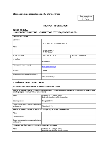 Stan na dzień sporządzenia prospektu informacyjnego Data sporządzenia prospektu: 05.12.2012r. PROSPEKT INFORMACYJNY CZĘŚĆ OGÓLNA I. DANE IDENTYFIKACYJNE I KONTAKTOWE DOTYCZĄCE DEWELOPERA DANE DEWELOPERA Deweloper MDC SP. Z 0.0 (KRS 0000345291) Adres ul. Sprzętowa 2, 10-467 Olsztyn Nr NIP i REGON NIP 739 377 02 52 REGON 280460894 Nr telefonu 608 293 102 Adres poczty elektronicznej [email protected] Nr faksu BRAK Adres strony internetowej dewelopera www.opisie-mdc.pl II. DOŚWIADCZENIE DEWELOPERA HISTORIA I UDOKUMENTOWANE DOŚWIADCZENIE DEWELOPERA PRZYKŁAD UKOŃCZONEGO PRZEDSIĘWZIĘCIA DEWELOPERSKIEGO (należy wskazać (o ile istnieją) trzy ukończone przedsięwzięcia deweloperskie, w tym ostatnie) Adres ul. Mroza 15 – Olsztyn, Jaroty Budynek mieszkalny z 70 mieszkaniami Data rozpoczęcia Listopad 2010 r. Data wydania ostatecznego pozwolenia na użytkowanie Wrzesień 2011r. PRZYKŁAD INNEGO UKOŃCZONEGO PRZEDSIĘWZIĘCIA DEWELOPERSKIEGO Adres Data rozpoczęcia Data wydania ostatecznego pozwolenia na użytkowanie OSTATNIE UKOŃCZONE PRZEDSIĘWZIĘCIE DEWELOPERSKIE Adres ul. Mroza 19 – Olsztyn, Jaroty Budynek mieszkalny z 25 mieszkaniami Data rozpoczęcia Kwiecień 2011 Data wydania ostatecznego pozwolenia na użytkowanie Grudzień 2012 Czy przeciwko deweloperowi prowadzono (lub prowadzi się) postępowania egzekucyjne na kwotę powyżej 100.000 zł NIE III. INFORMACJE DOTYCZĄCE NIERUCHOMOŚCI I PRZEDSIĘWZIĘCIA DEWELOPERSKIEGO INFORMACJE DOTYCZĄCE GRUNTU Adres i nr działki ewidencyjnej1 Działka zlokalizowana jest przy ul. Mroza w Olsztynie. Działka nr 594/1, 594/2, 594/3, 594/4, 594/5, 594/6, 594/7 Nr księgi wieczystej OL1)/00120278/9 , OL1O/00152916/7 ,OL1O/00152915/0 ,OL1O/00152916/7 , OL1O/00153358/4 Istniejące obciążenia hipoteczne nieruchomości lub wnioski o wpis w dziale czwartym księgi wieczystej W przypadku braku księgi wieczystej informacja o powierzchni działki i stanie prawnym nieruchomości2 Plan zagospodarowania przestrzennego dla sąsiadujących działek3 Hipoteka umowna 40 715 000 NIE DOTYCZY Przeznaczenie w planie Działka inwestycyjna w planie jest określona jako działka przeznaczona na zabudowę wielorodzinną. Przeznaczenie działek w miejscowym planie zagospodarowania przestrzennego miasta Olsztyn. Dopuszczalna wysokość zabudowy Zabudowa wielorodzinna do 5 kondygnacji. Dopuszczalny procent zabudowy działki Informacje zawarte w publicznie dostępnych dokumentach dotyczących przewidzianych inwestycji w promieniu 1 km od przedmiotowej nieruchomości, w szczególności o budowie lub rozbudowie dróg, budowie linii szynowych oraz przewidzianych korytarzach powietrznych, a także znanych innych inwestycjach komunalnych, w szczególności oczyszczalniach ścieków, spalarniach śmieci, wysypiskach, cmentarzach 30% W planie zabudowa mieszkaniowa wielorodzinna, dopuszczalna wysokość zabudowy do pięciu kondygnacji. Dopuszczalny procent zabudowy działki 30%. W odległości 200m wzdłuż ulicy Witosa i wzdłuż ulicy Płoskiego powstanie linia tramwajowa łącząca Osiedle Jaroty ze śródmieściem Olsztyna. W rejonie ul. Piotrowskiego i Jarockiej do roku 2013 powstaną małe zespoły zabudowy wielorodzinnej o wysokości do 5 kondygnacji. W bezpośrednim sąsiedztwie Osiedla od strony wschodniej wznoszony jest budynek wielorodzinny czterokondygnacyjny. W promieniu 1 km. istniejących kwartałach zabudowy mogą powstawać jedynie pojedyncze budynki plombowe i małe pawilony usług podstawowych. INFORMACJE DOTYCZĄCE BUDYNKU Czy jest pozwolenie na budowę tak* nie* Czy pozwolenie na budowę jest ostateczne tak* nie* Czy pozwolenie na budowę jest zaskarżone tak* nie* Nr pozwolenia na budowę oraz nazwa organu, który je wydał DECYZJA nr II-593/2010 z dnia 10.08.2010r. wydana przez Prezydenta Miasta Olsztyn Planowany termin rozpoczęcia i zakończenia prac budowlanych Rozpoczęcie prac – październik 2011r. Zakończenie prac – styczeń 2013r. Termin, do którego nastąpi przeniesienie prawa własności nieruchomości Do końca kwiecień 2013r. Opis przedsięwzięcia deweloperskiego Liczba budynków Rozmieszczenie ich na nieruchomości (należy podać minimalny odstęp pomiędzy budynkami) 5 18m Sposób pomiaru powierzchni lokalu mieszkalnego lub domu jednorodzinnego Pomiar na podstawie Polskiej normy PN-ISO 9836:1997 Zamierzony sposób i procentowy udział źródeł finansowania przedsięwzięcia deweloperskiego Inwestycja finansowana ze środków własnych i kredytu inwestorskiego w Alior Bank w następujących instytucjach finansowych: w Bank Alior Środki ochrony nabywców Bankowy rachunek powierniczy służący gromadzeniu środków nabywcy otwarty* zamknięty* Gwarancja instytucji finansowej gwarantująca zwrot środków nabywcy lokalu, w razie nie przeniesienia odrębnej własności w terminie określonym w umowie* Brak wymogu założenia rachunku powierniczego zgodnie z art. 37 Ustawy o ochronie praw nabywcy lokalu mieszkalnego lub domu jednorodzinnego z dnia 16 września 2011 roku. Główne zasady funkcjonowania wybranego rodzaju zabezpieczenia środków nabywcy Nazwa instytucji zapewniającej bezpieczeństwo środków nabywcy Harmonogram przedsięwzięcia deweloperskiego, w etapach Dopuszczenie waloryzacji ceny oraz określenie zasad waloryzacji Zgodnie z Ustawą brak zabezpieczenia Zgodnie z Ustawą brak ETAP I – roboty ziemne do końca grudnia 2011r.-15% ETAP II – stan „0” do końca marca 2011r. -20% ETAP III – konstrukcja żelbetowa nadziemna do końca lipca 2012r.-25% ETAP IV – ścianki działowe, elementy ślusarki, okna do końca wrzesień 2012r.-25% ETAP V – drzwi wewnętrzne, malowanie, elewacja, prace wykończeniowe części wspólnej do końca październik 2012r.-15% BRAK WARUNKI ODSTĄPIENIA OD UMOWY DEWELOPERSKIEJ Należy opisać na jakich warunkach można odstąpić od umowy deweloperskiej 1) Nabywca ma prawo odstąpić od niniejszej umowy: a) jeżeli umowa nie zawiera elementów, o których mowa w art. 