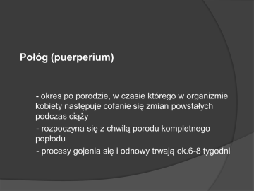 Połóg (puerperium) - okres po porodzie, w czasie którego w organizmie kobiety następuje cofanie się zmian powstałych podczas ciąży - rozpoczyna się z chwilą porodu kompletnego popłodu - procesy gojenia się i odnowy trwają ok.6-8 tygodni Procesy charakteryzujące połóg cofanie się zmian ciążowych i porodowych (inwolucja) 2. gojenie się ran porodowych 3. rozpoczęcie i utrzymanie laktacji 4. ponowne podjęcie czynności przez jajniki 1. Cofanie się zmian ciążowych i porodowych 1. macica i drogi rodne - zmniejszanie się macicy - zamykanie się kanału szyjki - wydalanie resztek zmienionego endometrium - gojenie się miejsca łożyskowego 2. dno miednicy, powłoki brzuszne, pęcherz moczowy, jelita 3. inne jak zwiększenie napięcia mięśni brzucha, zmniejszenie uwodnienia organizmu 1. prawie zupełne przerwanie działania hormonów na macicę (HCG, HPL, E, P) 2. ograniczony dopływ krwi do macicy (3 rodzaje skurczów połogowych) 1. zmniejszenie ukrwienia mięśnia macicy - dochodzi do zmian degeneracyjnych i autolizy włókien mięśniowych (inwolucja; zwijanie się macicy) - zmniejszanie masy i rozmiarów macicy w połogu gł. wskutek zmniejszenia jej masy mięśniowej - masa macicy po porodzie ok.1000 gramów, po 6-8 tyg. ok.50-70g 2. hamowanie krwawienia w obrębie rany macicy 3. wydalanie wydzieliny z jamy macicy - odchody połogowe(lochia) Zmiany w układzie krążenia 1. po porodzie wzrost pojemności minutowej o 1020 % 2. zwolnienie czynności serca 3. w pierwszej dobie może być wzrost objętości krwi krążącej a następnie spadek objętości, powrót do normy po ok.4-6 tyg. 1. po ok. 12 h nasilenie diurezy do ok. 2-4 l/dobę, a u kobiet z obrzękami do 6 l/dobę 2. istniejące w czasie ciąży poszerzenie dróg moczowych ustępuje zwykle do 2 tygodni po porodzie 3. filtracja kłębuszkowa i klirens endogennej kreatyniny, podwyższone w ciąży, wracają do normy ok. 8 tygodni po porodzie 1. stopniowy wzrost hematokrytu 2. wzrost liczby leukocytów bezpośrednio po porodzie, następnie spadek 3. w pierwszych dniach po porodzie przesunięcie w lewo wzoru odsetkowego leukocytów 4. wzrost liczby płytek krwi i poziomu fibrynogenu 5. znika oporność na insulinę – w 2,3-im dniu spadek poziomu glukozy 1. mammogeneza –rozwój i tworzenie gruczołu piersiowego do czynnościowo sprawnego narządu (E, P) 2. laktogeneza – przygotowanie gruczołu do wydzielania mleka (HPL, PRL) 3. galaktogeneza – wywołanie wytwarzania mleka w komórkach wydzielniczych (spadek gwałtowny E i P; PRL) 4. galaktopoeza – utrzymanie wydzielania mleka (PRL) 5. galaktokineza – wydalanie mleka (oksytocyna) względny niedobór hormonów steroidowych wydzielanie hormonów gonadotropowych przysadki stopniowy powrót czynności jajników U większości kobiet karmiących cykle miesiączkowe pojawiają się pod koniec laktacji lub po ustaniu karmienia. U kobiet, które nie karmią piersią pierwsza miesiączka występuje najczęściej w 5-6 tygodniu po porodzie. 1. występujące w pierwszych dwóch godzinach połogu – związane z samym przebiegiem porodu: - krwotoki poporodowe - okołoporodowe uszkodzenia dróg rodnych 2. występujące w późniejszym okresie połogu tj. od 2 godzin do 6 tygodni po porodzie: - zakażenia połogowe - późne krwawienia poporodowe - połogowe zapalenie piersi - choroba zakrzepowa - uszkodzenie spojenia łonowego - zaburzenia psychiczne Definicja: Procesy chorobowe przebiegające z podwyższeniem ciepłoty ciała powyżej 39 st.C. oraz innymi wykładnikami zakażenia (zaczerwienienie rany, ropny wyciek z rany lub dróg rodnych) po 24 godzinach od porodu, wywołane przez drobnoustroje wnikające do ran poporodowych (patogeny: bakterie tlenowe gł. E.coli, Proteus, Klebsiella, Pseudomonas, Streptococcus, Staphylococcus; bakterie beztlenowe gł. Bacteroides, Clostridium, Peptostreptococcus). W przypadku zakażeń połogowych występują gł. zakażenia mieszane (egzogenne; endogenne w tym samoistne i sztuczne). Drogi szerzenia się zakażenia połogowego: - błony śluzowe kanału rodnego - przez endometrium, jajowody, jajniki oraz otrzewną - naczynia limfatyczne – z endometrium przechodzi na przymacicza, omacicza i otrzewną - naczynia krwionośne – zakażenie uogólnione czyli posocznica połogowa (najcięższa postać zakażenia połogowego) zakażenie ran krocza i pochwy - bolesność, zaczerwienienie rany, obrzęk, obecność nalotu na brzegach rany - zapalenie błony śluzowej macicy – gł. 3,4 doba, 38-39 stop. C (tzw. jednodniowa gorączka), stany podgorączkowe, cuchnące odchody, często zatrzymanie odchodów, zwolnione zwijanie macicy, bolesność uciskowa macicy gł. w okolicy krawędzi, bóle podbrzusza, czasem skąpe krwawienie - - zapalenie przymacicz – ropne zapalenie leżącej zaotrzewnowo luźnej tkanki łącznej - ból, uczucie ucisku bocznie od macicy z promieniowaniem do jednej z kończyn dolnych, ucisk na pęcherz moczowy i odbytnicę, czasem objawy podrażnienia otrzewnej zapalenie przydatków – ciągnące, kłujące bóle gł. jednostronnie, znaczna bolesność uciskowa, nagłe podwyższenie temperatury, objawy podrażnienia otrzewnej, silne bóle całego podbrzusza - - zapalenie otrzewnej 1. izolowanie położnicy 2. posiew wydzieliny z pochwy i rany (+ antybiogram) 3. antybiotyk o szerokim spektrum działania, ew. zmiana po uzyskaniu antybiogramu 4. przy braku reakcji po 72 godz. leczenia, szukamy powikłań np. ropień miednicy małej czy zakrzepowe zapalenie żył miednicy małej 5. leczenie objawowe: przeciwbólowe, przeciwgorączkowe zakrzepowe zapalenie żył - w ciąży 0,1- 0,7 /1000 porodów, częściej po porodach 0,24 %. • ryzyko 5,5 razy większe w okresie okołoporodowym niż u kobiet nieciężarnych • na wzrost ryzyka mają wpływ czynniki tj: otyłość, starszy wiek >40 r.ż., większa liczba przebytych ciąż, żylaki kończyn dolnych, uprzednio przebyte epizody zakrzepowo-zatorowe, trombofilie 