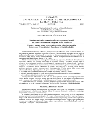 ANNALES UNIVERSITATIS MARIAE CURIE-SKŁODOWSKA LUBLIN - POLONIA VOL.LX, SUPPL. XVI, 257 SECTIO D 2005 Państwowa Wyższa Szkoła Zawodowa w Białej Podlaskiej Zofia Kubińska, Józef Bergier State Vocational College in Biała Podlaska ZOFIA KUBIŃSKA, JÓZEF BERGIER Students attitudes towards selected aspects of health at State Vocational College in Biala Podlaska Przejawy postaw wobec wybranych aspektów zdrowia studentów Państwowej Wyższej Szkoły Zawodowej w Białej Podlaskiej Kultura zdrowotna każdego człowieka jest wynikiem oddziaływania wielu czynników, takich jak: obyczajowość, tradycje, wierzenia i edukacja zdrowotna. Odzwierciedlają ją postawy wobec zdrowia, zachowania zdrowotne, styl życia czyli to wszystko co dotyczy spraw zdrowia (Woynarowska 2001). Najszerszą gamę postaw wobec zdrowia własnego i innych osób przedstawił i scharakteryzował w swoich pracach Maciej Demel (Demel 1974, 1980). Wśród wymienionych przez autora postaw znalazły się gapiostwo, brutalność, dowcipkowanie, znieczulica, ukazują one sposoby odnoszenia się do cudzej choroby i kalectwa. Postawy ludzi do własnego zdrowia są nader zróżnicowane od irracyjnie przeczulonych do lekkomyślnych i wyolbrzymiających. Są to: lekomania czyli spaczona postawa ludzi do leków, postawa samarytańska, hipochondrii, kancerofobii, histerii. Skłonność do postawy terrorystycznej (...bo wam umrę), postawa ambitna, snobizmu, postawy wyrachowane i eksploatatorskie. Według autora dobre wychowanie zdrowotne kształtuje dojrzałą postawę do spraw zdrowia, na którą składają się: − racjonalny, emocjonalnie zrównoważony stosunek do choroby, kalectwa i śmierci, − poczucie odpowiedzialności za swoje zdrowie i współodpowiedzialności za zdrowie publiczne, − gotowość i umiejętność spieszenia z pomocą innym. Jeśli wychowanie zdrowotne się nie uda jest przyczynkiem postaw egocentrycznych (Demel 1980). Każda postawa człowieka wobec zdrowia przejawia się w jego nastawieniu emocjonalnomotywacyjnym, zakresie posiadanej wiedzy i działaniu czyli zachowaniach zdrowotnych. Celem doniesienia jest poznanie i ukazanie przejawów postaw wobec wybranych aspektów zdrowia studentów turystyki i rekreacji Państwowej Wyższej szkoły Zawodowej w Białej Podlaskiej. MATERIAŁ I METODA BADAŃ Badania diagnostyczne przeprowadzono jesienią 2004 roku, wśród 184 studentów II i III roku turystyki i rekreacji w Państwowej Wyższej Szkole Zawodowej. Studenci w większości pochodzą z województw podlaskiego i mazowieckiego. W badaniach zastosowano metodę sondażu diagnostycznego. Do uzyskania wyników badań wykorzystano autorski kwestionariusz odniesień do postaw wobec wybranych aspektów zdrowia własnego i innych osób. Kwestionariusz zawiera 12 twierdzeń określających przejawy postaw wobec wybranych aspektów zdrowia. Aby ustalić stopień przekonania (nastawienia) wobec każdego twierdzenia zastosowano czterostopniową skalę umożliwiającą zajęcie odpowiedniego stanowiska (-zdecydowanie tak, - raczej tak, - raczej nie, - zdecydowanie nie). 143 WYNIKI BADAŃ Zmierzając do ustalenia czy badani studenci przejawiają postawy negatywne czy pozytywne wobec zaproponowanych aspektów zdrowia, zawartych w treściach twierdzeń kwestionariusza, dokonane obliczenia zestawiono w tabeli 1. Z przeprowadzonej analizy wynika, że zdecydowanie największa grupa badanych (70,7%) przejawia pozytywne nastawienie wobec postawy promocji zdrowia zobowiązującej każdego człowieka do systematycznego kontrolowania zdrowia, dbania o nie, wzmacnianie go, zapobieganie chorobom, poszerzanie wiedzy o zdrowiu, dokonywania zmian zachowań prozdrowotnych. Studenci zdecydowanie negatywnie odnieśli się do postawy (abnegacji) lekceważenia zdrowia (65,2%). O tym, że każdy człowiek powinien bezinteresownie udzielać pomocy drugiemu w sytuacji choroby lub zdrowia bez względu na pokrewieństwo jest przekonanych 53,8%, zachowania te są charakterystyczne dla postawy samarytańskiej wielokrotnie opisywanej na kwartach biblii. Niepokojący jest wynik, który ukazuje, że aż połowa badanych (50,0%) jest skłonna uwierzyć w to, że współczesne leki są bardzo skuteczne, wskazuje to na przejawianie postawy lekomanii. Nieco mniej niż połowa badanych (47,3%) jest skłonna przejawiać postawę znachorstwa twierdząc, że bioenergoterapia, znachorstwo i medycyna naturalna raczej są w stanie uleczyć większość chorób bez ujemnych skutków zdrowotnych. Duża grupa studentów (46,2%) nie jest zwolennikami postawy ambitnej, którą według Demela charakteryzuje skłonność do dysymulacji (ukrywania i łagodzenia rzeczywistego obrazu choroby). Aż 44,0% badanych odniosło się negatywnie do postawy kancerofobii (przekonanie o tym, że nowotwory złośliwe są zawsze dziedziczone co powoduje fobie i lęki). Pozostałe deklarowane przejawy postaw wobec zdrowia dotyczą używania zdrowia do własnego dowartościowania (42,9%), hipochondrii – skrajnego przeczulenia (39,1%), histerii – wyolbrzymiania i symulacji (38,6%) i postawy eksploatacji czyli maksymalnego wykorzystywania zdrowia do zrobienia kariery, odniesienia sukcesu, wzbogacenia się (31,5%), tab.1. Tab.1. Przejawy postaw wobec zdrowia badanych studentów Lp. 1 2 3 4 5 6 7 8 9 Twierdzenia Współczesne leki są bardzo skuteczne, czyli są w stanie wyleczyć większość zaburzeń psychosomatycznych i chorób bez ubocznych działań Każdy człowiek powinien bezinteresownie udzielać pomocy drugiemu człowiekowi w sytuacji choroby lub zdrowia bez względu na stopień pokrewieństwa Bioenergoterapia, znachorstwo i medycyna naturalna są w stanie uleczyć większość chorób bez ujemnych skutków zdrowotnych Nie ma ludzi całkowicie zdrowych. Każdy z nas nosi w sobie jakąś chorobę tylko o tym nie wie W czasie każdej choroby należy zakładać (myśleć i mówić o tym), że jej przebieg w każdej chwili może się bardzo pogorszyć i stać się niemo