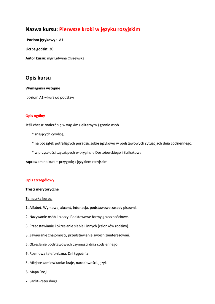Nazwa kursu: Pierwsze kroki w języku rosyjskim Poziom językowy : A1 Liczba godzin: 30 Autor kursu: mgr Lidwina Olszewska Opis kursu Wymagania wstępne poziom A1 – kurs od podstaw Opis ogólny Jeśli chcesz znaleźć się w wąskim ( elitarnym ) gronie osób * znających cyrylicę, * na początek potrafiących poradzić sobie językowo w podstawowych sytuacjach dnia codziennego, * w przyszłości czytających w oryginale Dostojewskiego i Bułhakowa zapraszam na kurs – przygodę z językiem rosyjskim Opis szczegółowy Treści merytoryczne Tematyka kursu: 1. Alfabet. Wymowa, akcent, intonacja, podstawowe zasady pisowni. 2. Nazywanie osób i rzeczy. Podstawowe formy grzecznościowe. 3. Przedstawianie i określanie siebie i innych (członków rodziny). 3. Zawieranie znajomości, przedstawianie swoich zainteresowań. 5. Określanie podstawowych czynności dnia codziennego. 6. Rozmowa telefoniczna. Dni tygodnia 5. Miejsce zamieszkania: kraje, narodowości, języki. 6. Mapa Rosji. 7. Sankt-Petersburg Materiał gramatyczny Właściwy dla treści realizowanego kursu. Wymagania oceny Słuchacz zakończy kurs z wynikiem pozytywnym jeśli będzie regularnie uczestniczył w zajęciach(przynajmniej 50 % obecności) , będzie aktywny na zajęciach, przygotowany do zajęć (zadania domowe) oraz zaliczy końcowy test pisemny. Literatura Kurs oparty o podręcznik podstawowy "Жили-были.28 уроков русского языка", Л.В. Миллер, Л.В. Политова, Санкт-Петербург "Златоуст" oraz o dodatkowe materiały autorskie Literatura uzupełniająca: * "Грамматика без проблем", D. Dziewanowska, WSiP * słowniki rosyjsko-polskie i polsko-rosyjskie Cel ogólny kursu Ogólnym celem kursu jest zapoznanie studentów z alfabetem rosyjskim, podstawami fonetyki oraz wykształcenie elementarnej kompetencji językowej umożliwiającej rozumienie i samodzielne formułowanie prostych wypowiedzi w prostych sytuacjach komunikacyjnych Oczekiwane efekty kształcenia Po zakończeniu kursu z wynikiem pozytywnym słuchacz powinien: * znać rosyjski alfabet, podstawowe wiadomości z zakresu wymowy, akcentu, intonacji, zasad pisowni; * znać podstawowe zwroty grzecznościowe dotyczące powitania, pożegnania, prośby, podziękowania, przeprosin, przedstawianie się); * umieć zapytać o przedmiot, osobę; * umieć krótko opowiedzieć, czym się interesuje on i inni; * przedstawić członków rodziny; * nazywać narodowości i języki; * poznać zwroty stosowane w rozmowach telefonicznych; * poznać nazwy dni tygodnia; * mówić o planach i czynnościach w czasie wolnym