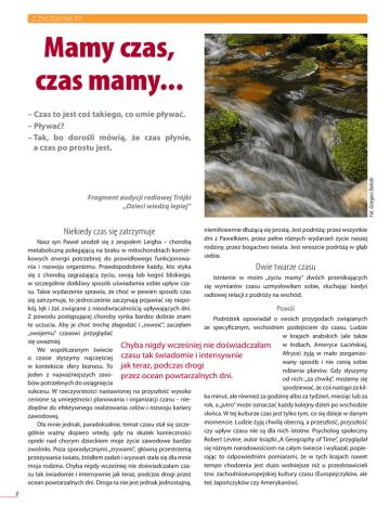 BIBLIOTEKA Z ŻYCIEM NAFUNDACJI TY HOSPICYJNEJ Mamy czas, czas mamy... Fot. Grzegorz Dolecki – Czas to jest coś takiego, co umie pływać. – Pływać? – Tak, bo dorośli mówią, że czas płynie, a czas po prostu jest. Fragment audycji radiowej Trójki „Dzieci wiedzą lepiej” Niekiedy czas się zatrzymuje niemiłosiernie dłużącą się prostą. Jest podróżą: przez wszystkie dni z Pawełkiem, przez pełne różnych wydarzeń życie naszej rodziny, przez bogactwo świata. Jest wreszcie podróżą w głąb siebie. Nasz syn Paweł urodził się z zespołem Leigha – chorobą metaboliczną polegającą na braku w mitochondriach komórkowych energii potrzebnej do prawidłowego funkcjonowania i rozwoju organizmu. Prawdopodobnie każdy, kto styka Dwie twarze czasu się z chorobą zagrażającą życiu, swoją lub kogoś bliskiego, Istnienie w moim „życiu mamy” dwóch przenikających w szczególnie dotkliwy sposób uświadamia sobie upływ czasię wymiarów czasu uzmysłowiłam sobie, słuchając kiedyś su. Takie wydarzenie sprawia, że choć w pewien sposób czas radiowej relacji z podróży na wschód. się zatrzymuje, to jednocześnie zaczynają pojawiać się niepokój, lęk i żal, związane z nieodwracalnością upływających dni. Powoli Z powodu postępującej choroby synka bardzo dobrze znam Podróżnik opowiadał o swoich przygodach związanych te uczucia. Aby je choć trochę złagodzić i „oswoić”, zaczęłam ze specyficznym, wschodnim podejściem do czasu. Ludzie „swojemu” czasowi przyglądać w krajach arabskich (ale także się uważniej. Chyba nigdy wcześniej nie doświadczałam w Indiach, Ameryce Łacińskiej, We współczesnym świecie Afryce) żyją w mało zorganizoo czasie słyszymy najczęściej czasu tak świadomie i intensywnie wany sposób i nie cenią sobie w kontekście sfery biznesu. To jak teraz, podczas drogi robienia planów. Gdy słyszymy jeden z najważniejszych zaso- przez ocean powtarzalnych dni. od nich: „za chwilę”, możemy się bów potrzebnych do osiągnięcia spodziewać, że coś nastąpi za kilsukcesu. W rzeczywistości nastawionej na przyszłość wysoko ka minut, ale również za godzinę albo za tydzień, miesiąc lub za cenione są umiejętności planowania i organizacji czasu – nierok, a „jutro” może oznaczać każdy kolejny dzień po wschodzie zbędne do efektywnego realizowania celów i rozwoju kariery słońca. W tej kulturze czas jest tylko tym, co się dzieje w danym zawodowej. momencie. Ludzie żyją chwilą obecną, a przeszłość, przyszłość Dla mnie jednak, paradoksalnie, temat czasu stał się szczeczy upływ czasu nie są dla nich istotne. Psycholog społeczny gólnie ważny dopiero wtedy, gdy na skutek konieczności Robert Levine, autor książki „A Geography of Time”, przyglądał opieki nad chorym dzieckiem moje życie zawodowe bardzo się różnym narodowościom na całym świecie i wykazał, popiezwolniło. Poza sporadycznymi „zrywami”, główną przestrzenią rając to odpowiednimi pomiarami, że w tych krajach nawet przeżywania świata, źródłem zadań i wyzwań stała się dla mnie tempo chodzenia jest dużo wolniejsze niż u przedstawicieli moja rodzina. Chyba nigdy wcześniej nie doświadczałam czatzw. zachodnioeuropejskiej kultury czasu (Europejczyków, ale su tak świadomie i intensywnie jak teraz, podczas drogi przez ocean powtarzalnych dni. Droga ta nie jest jednak jednostajną, też Japończyków czy Amerykanów). 2 BIBLIOTEKA FUNDACJI Z ŻYCIEM HOSPICYJNEJ NA TY w czasie, „in time”, przeciwstawiając im tych, którzy przez czas pędzą – „through time”. Zatem tempo życia jest nie tylko kwestią kulturową, ale także indywidualną. Co więcej, w życiu każdego z nas obecne jest i szybkie, i wolne tempo. Różnimy się tylko rozłożeniem proporcji. Szybko, sprawnie, zgodnie z planem Fot. Anna Kulka-Dolecka Tam (i tutaj, bo dotyczy to również naszego kraju) dominuje szybkie tempo życia. Czas postrzegany jest linearnie – jako linia ciągła, podzielona na krótsze odcinki: dni, godziny, minuty. Czas to pieniądz, zatem liczy się wydajność i szybkość. Jest czas, ale już po chwili: tik, tak, tik, tak – mija on bezpowrotnie. Dwa wymiary czasu mamy Pragniemy go ujarzmić, więc wyznaczamy sobie kolejne zadaA teraz, na kilka minut, które wystarczą do przeczytania nia, robimy kilka rzeczy naraz, coraz bardziej przyspieszając. tego tekstu, zapraszam do mojego czasu. Nawet w języku funkcjonuje wiele określeń, które wprost sugerują, że to człowiek panuje nad czasem. Czas można zyskiwać, Mama europejska i biznesowa – mama w pędzie oszczędzać, trwonić, marnotrawić, planować, organizować, Kiedyś pomyślałam, że chociaż przez zrządzenie losu żyję mnożyć, pożytkować. Większość ludzi w naszej kulturze żyje trochę na uboczu współczesnego, pędzącego, biznesowego w poczuciu, że czas płynie za świata, to sposobem codzienszybko, że jest go za mało, wciąż nego funkcjonowania całkiem Jestem coraz lepsza w robieniu go na coś nie starcza. On płynie, nieźle wpisuję się w jego konkilku rzeczy naraz i doprowadzaniu a my za nim pędzimy. Oszczęwencję. Mój czas jest świetnie każdej z nich do końca. dzanie czasu polega na wtłaczazorganizowany – może lepiej niż niu w dzień coraz większej liczby Niczym profesjonalna asystentka prezesa u niejednego przedstawiciela zadań. Takie podejście wiąże się handlowego. Dotyczy to zresztą Pawła dbam o to, aby wszystko chodziło z życiem według zegara, kalenrównież czasu mojego wspólnidarza, tworzeniem planów, harjak w dobrze naoliwionej maszynie. ka – pozostając przy terminomonogramów, list zadań. logii biznesowej, a w prostych Owe dwie kulturowe koncepcje czasu to oczywiście duże słowach – kochanego towarzysza życia, męża Grzesia. Doprauproszczenie. Wszędzie są ludzie, którzy żyją powoli, delektucowany w szczegółach porządek dnia to k