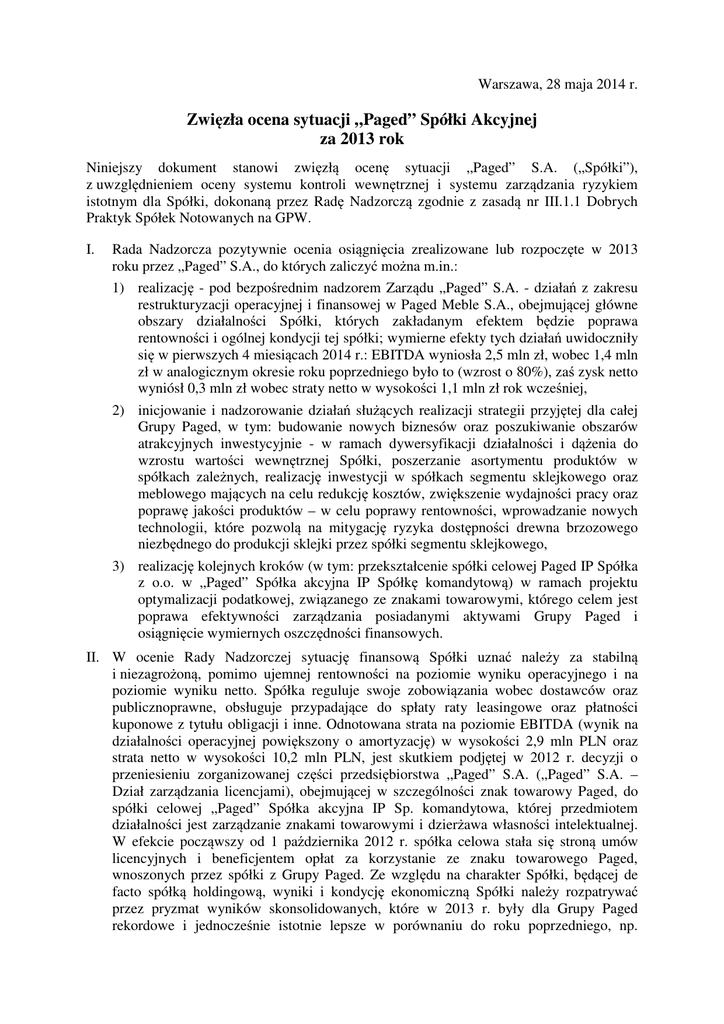 Warszawa, 28 maja 2014 r. Zwięzła ocena sytuacji „Paged” Spółki Akcyjnej za 2013 rok Niniejszy dokument stanowi zwięzłą ocenę sytuacji „Paged” S.A. („Spółki”), z uwzględnieniem oceny systemu kontroli wewnętrznej i systemu zarządzania ryzykiem istotnym dla Spółki, dokonaną przez Radę Nadzorczą zgodnie z zasadą nr III.1.1 Dobrych Praktyk Spółek Notowanych na GPW. I. Rada Nadzorcza pozytywnie ocenia osiągnięcia zrealizowane lub rozpoczęte w 2013 roku przez „Paged” S.A., do których zaliczyć można m.in.: 1) realizację - pod bezpośrednim nadzorem Zarządu „Paged” S.A. - działań z zakresu restrukturyzacji operacyjnej i finansowej w Paged Meble S.A., obejmującej główne obszary działalności Spółki, których zakładanym efektem będzie poprawa rentowności i ogólnej kondycji tej spółki; wymierne efekty tych działań uwidoczniły się w pierwszych 4 miesiącach 2014 r.: EBITDA wyniosła 2,5 mln zł, wobec 1,4 mln zł w analogicznym okresie roku poprzedniego było to (wzrost o 80%), zaś zysk netto wyniósł 0,3 mln zł wobec straty netto w wysokości 1,1 mln zł rok wcześniej, 2) inicjowanie i nadzorowanie działań służących realizacji strategii przyjętej dla całej Grupy Paged, w tym: budowanie nowych biznesów oraz poszukiwanie obszarów atrakcyjnych inwestycyjnie - w ramach dywersyfikacji działalności i dążenia do wzrostu wartości wewnętrznej Spółki, poszerzanie asortymentu produktów w spółkach zależnych, realizację inwestycji w spółkach segmentu sklejkowego oraz meblowego mających na celu redukcję kosztów, zwiększenie wydajności pracy oraz poprawę jakości produktów – w celu poprawy rentowności, wprowadzanie nowych technologii, które pozwolą na mitygację ryzyka dostępności drewna brzozowego niezbędnego do produkcji sklejki przez spółki segmentu sklejkowego, 3) realizację kolejnych kroków (w tym: przekształcenie spółki celowej Paged IP Spółka z o.o. w „Paged” Spółka akcyjna IP Spółkę komandytową) w ramach projektu optymalizacji podatkowej, związanego ze znakami towarowymi, którego celem jest poprawa efektywności zarządzania posiadanymi aktywami Grupy Paged i osiągnięcie wymiernych oszczędności finansowych. II. W ocenie Rady Nadzorczej sytuację finansową Spółki uznać należy za stabilną i niezagrożoną, pomimo ujemnej rentowności na poziomie wyniku operacyjnego i na poziomie wyniku netto. Spółka reguluje swoje zobowiązania wobec dostawców oraz publicznoprawne, obsługuje przypadające do spłaty raty leasingowe oraz płatności kuponowe z tytułu obligacji i inne. Odnotowana strata na poziomie EBITDA (wynik na działalności operacyjnej powiększony o amortyzację) w wysokości 2,9 mln PLN oraz strata netto w wysokości 10,2 mln PLN, jest skutkiem podjętej w 2012 r. decyzji o przeniesieniu zorganizowanej części przedsiębiorstwa „Paged” S.A. („Paged” S.A. – Dział zarządzania licencjami), obejmującej w szczególności znak towarowy Paged, do spółki celowej „Paged” Spółka akcyjna IP Sp. komandytowa, której przedmiotem działalności jest zarządzanie znakami towarowymi i dzierżawa własności intelektualnej. W efekcie począwszy od 1 października 2012 r. spółka celowa stała się stroną umów licencyjnych i beneficjentem opłat za korzystanie ze znaku towarowego Paged, wnoszonych przez spółki z Grupy Paged. Ze względu na charakter Spółki, będącej de facto spółką holdingową, wyniki i kondycję ekonomiczną Spółki należy rozpatrywać przez pryzmat wyników skonsolidowanych, które w 2013 r. były dla Grupy Paged rekordowe i jednocześnie istotnie lepsze w porównaniu do roku poprzedniego, np. skonsolidowany zysk na działalności operacyjnej (EBIT) wyniósł 87,4 mln PLN i był wyższy (+43%) niż w 2012 roku. Rada Nadzorcza zwraca jednakże uwagę na potrzebę kontynuacji w Paged Meble S.A. działań restrukturyzacyjnych (w szczególności mających na celu redukcję kosztów i utrzymanie dyscypliny kosztowej) oraz działań służących zwiększeniu przychodów tej spółki, co jest warunkiem koniecznym do trwałej poprawy rentowności segmentu meblowego Grupy Paged. III. Rada Nadzorcza stwierdza, że w Spółce dotychczas nie został wprowadzony formalny system kontroli wewnętrznej i system zarządzania ryzykiem istotnym dla Spółki, np. w postaci wyodrębnionych działów lub stanowisk pracy, regulaminów, procedur,. Sytuacja ta wynika przede wszystkim z faktu, że Spółka zatrudnia kilkunastu pracowników i ma charakter spółki holdingowej, zaś działalność operacyjna jest prowadzona w jednostkach zależnych. Brak sformalizowanego systemu kontroli wewnętrznej oraz zarządzania ryzykiem nie oznacza, iż w okresie 2013 r. w Spółce nie były prowadzone działania z zakresu kontroli wewnętrznej oraz zarządzania ryzykiem. Działania takie były prowadzone, gdyż wynikały z zakresu kompetencji i odpowiedzialności poszczególnych organów, jednostek organizacyjnych i poszczególnych pracowników Spółki. Czynności kontrolne w szczególności były wykonywane – w oparciu o istniejące procedury - w należących do Oddziału składach handlowych prowadzonych przez zewnętrznych agentów, co zapewniało właściwy nadzór nad majątkiem trwałym i obrotowym Spółki. Ryzyka istotne dla Spółki są identyfikowane przez Zarząd Spółki, po czym Zarząd uzgadnia zasady zarządzania każdym z rodzajów ryzyka. Zdaniem Zarządu Spółki, w 2013 r. nie pojawiły się nowe ryzyka istotne dla Spółki w stosunku do zidentyfikowanych w latach poprzednich. W ramach nałożonych przepisami prawa obowiązków Rada Nadzorcza prowadziła bieżący monitoring zarządzania ryzykiem występującym w Spółce, analizując pod tym kątem okresowe relacje Zarządu Spółki, prezentujące wyniki finansowe oraz sytuację w zakresie produkcji i sprzedaży, jak również najważniejsze zdarzenia w Spółce oraz w spółkach z Grup