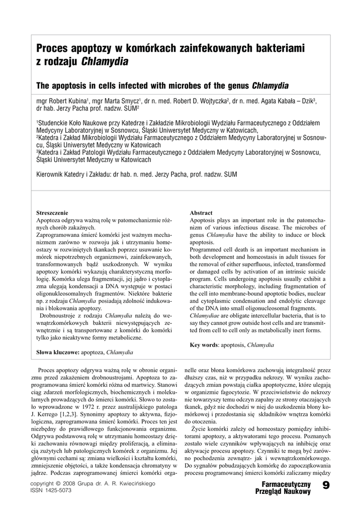 0ROCESAPOPTOZYWKOMÌRKACHZAINFEKOWANYCHBAKTERIAMI ZRODZAJU#HLAMYDIA 4HEAPOPTOSISINCELLSINFECTEDWITHMICROBESOFTHEGENUS#HLAMYDIA MGR2OBERT+UBINAMGR-ARTA3MYCZDRNMED2OBERT$7OJTYCZKADRNMED!GATA+ABAAp$ZIK DRHAB*ERZY0ACHAPROFNADZW35- 3TUDENCKIE+OO.AUKOWEPRZY+ATEDRZEI:AKADZIE-IKROBIOLOGII7YDZIAU&ARMACEUTYCZNEGOZ/DDZIAEM -EDYCYNY,ABORATORYJNEJW3OSNOWCUgLSKI5NIWERSYTET-EDYCZNYW+ATOWICACH +ATEDRAI:AKAD-IKROBIOLOGII7YDZIAU&ARMACEUTYCZNEGOZ/DDZIAEM-EDYCYNY,ABORATORYJNEJW3OSNOW CUgLSKI5NIWERSYTET-EDYCZNYW+ATOWICACH +ATEDRAI:AKAD0ATOLOGII7YDZIAU&ARMACEUTYCZNEGOZ/DDZIAEM-EDYCYNY,ABORATORYJNEJW3OSNOWCU gLSKI5NIWERSYTET-EDYCZNYW+ATOWICACH +IEROWNIK+ATEDRYI:AKADUDRHABNMED*ERZY0ACHAPROFNADZW35- Streszczenie Apoptoza odgrywa ważną rolę w patomechanizmie różnych chorób zakaźnych. Zaprogramowana śmierć komórki jest ważnym mechanizmem zarówno w rozwoju jak i utrzymaniu homeostazy w rozwiniętych tkankach poprzez usuwanie komórek niepotrzebnych organizmowi, zainfekowanych, transformowanych bądź uszkodzonych. W wyniku apoptozy komórki wykazują charakterystyczną morfologię. Komórka ulega fragmentacji, jej jądro i cytoplazma ulegają kondensacji a DNA występuje w postaci oligonukleosomalnych fragmentów. Niektóre bakterie np. z rodzaju Chlamydia posiadają zdolność indukowania i blokowania apoptozy. Drobnoustroje z rodzaju Chlamydia należą do wewnątrzkomórkowych bakterii niewystępujących zewnętrznie i są transportowane z komórki do komórki tylko jako nieaktywne formy metaboliczne. Abstract Apoptosis plays an important role in the patomechanizm of various infectious disease. The microbes of genus Chlamydia have the ability to induce or block apoptosis. Programmed cell death is an important mechanism in both development and homeostasis in adult tissues for the removal of either superfluous, infected, transformed or damaged cells by activation of an intrinsic suicide program. Cells undergoing apoptosis usually exhibit a characteristic morphology, including fragmentation of the cell into membrane-bound apoptotic bodies, nuclear and cytoplasmic condensation and endolytic cleavage of the DNA into small oligonucleosomal fragments. Chlamydiae are obligate intercellular bacteria, that is to say they cannot grow outside host cells and are transmitted from cell to cell only as metabolically inert forms. Key words: apoptosis, Chlamydia Słowa kluczowe: apoptoza, Chlamydia Proces apoptozy odgrywa ważną rolę w obronie organizmu przed zakażeniem drobnoustrojami. Apoptoza to zaprogramowana śmierć komórki różna od martwicy. Stanowi ciąg zdarzeń morfologicznych, biochemicznych i molekularnych prowadzących do śmierci komórki. Słowo to zostało wprowadzone w 1972 r. przez australijskiego patologa J. Kerrego [1,2,3]. Synonimy apoptozy to aktywna, fizjologiczna, zaprogramowana śmierć komórki. Proces ten jest niezbędny do prawidłowego funkcjonowania organizmu. Odgrywa podstawową rolę w utrzymaniu homeostazy dzięki zachowaniu równowagi między proliferacją, a eliminacją zużytych lub patologicznych komórek z organizmu. Jej głównymi cechami są: zmiana wielkości i kształtu komórki, zmniejszenie objętości, a także kondensacja chromatyny w jądrze. Podczas zaprogramowanej śmierci komórki orgaCOPYRIGHT'RUPADR!2+WIECIÊSKIEGO )33. nelle oraz błona komórkowa zachowują integralność przez dłuższy czas, niż w przypadku nekrozy. W wyniku zachodzących zmian powstają ciałka apoptotyczne, które ulegają w organizmie fagocytozie. W przeciwieństwie do nekrozy nie towarzyszy temu odczyn zapalny ze strony otaczających tkanek, gdyż nie dochodzi w niej do uszkodzenia błony komórkowej i przedostania się składników wnętrza komórki do otoczenia. Życie komórki zależy od homeostazy pomiędzy inhibitorami apoptozy, a aktywatorami tego procesu. Poznanych zostało wiele czynników wpływających na inhibicję oraz aktywacje procesu apoptozy. Czynniki te mogą być zarówno pochodzenia zewnątrz- jak i wewnątrzkomórkowego. Do sygnałów pobudzających komórkę do zapoczątkowania procesu programowanej śmierci komórki zaliczamy między &ARMACEUTYCZNY 0RZEGLD.AUKOWY kU¤°°U innymi indukcję białka p53, oraz białek z rodziny Bcl-2 [4,5]. Wiadomo jednak, iż bakterie, wykształciły wiele mechanizmów prowadzących do zahamowania programowanej śmierci komórki. Apoptoza może przebiegać jedną z dwóch dróg: zewnątrzpochodną, do której zaliczana jest ścieżka receptorowa oraz szlak zależny od perforyn i granzymów, a także wewnątrzpochodną, zależną od mitochondrium lub siateczki śródplazmatycznej. Niezależnie jednak od źródła sygnału w wyniku inicjacji następuje aktywacja enzymów proteolitycznych – kaspaz. Są to enzymy z grupy proteaz cysteinowych rozszczepiających polipeptydy po reszcie kwasu aspargninowego. Syntetyzowane są w komórkach jako prokaspazy. Ze względu na funkcje w procesie apoptozy możemy wyróżnić kaspazy inicjujące kaspaza-2,8,9,10,12 , oraz kaspazy efektorowe - kaspaza 3,6,7 [4,5]. Szlak receptorowy zostaje zapoczątkowany na skutek związania liganda z receptorem śmierci na powierzchni komórki, należącym do nadrodziny receptorów TNF [6]. Podstawowym etapem przekazania sygnału jest formowanie kompleksu DISC w przypadku drogi zewnątrzpochodnej oraz apoptosomu w przypadku drogi wewnątrzpochodnej. Do kompleksów tych zostają przyłączone i aktywowane w następnej kolejności kaspazy inicjujące. W wyniku tej reakcji następuje aktywacja kaspaz efektortowych odpowiedzialnych za bezpośrednią destrukcje komórki. Ogniwem łączącym oba szlaki jest białko Bid należące do rodziny białek bcl-2. Do rodziny tej należą białka proapoptotyczne (podrodzina BH3 oraz Bax) oraz białka antyapoptotyczne (Bcl-2, Bcl-x). Zlokalizowane są one w obrębie błony mitochondrialnej. Ich zasadniczą funkcją jest regulacja przepuszczalności błony. Do białek zwiększających przepuszczalność należą proteiny z podrodzi