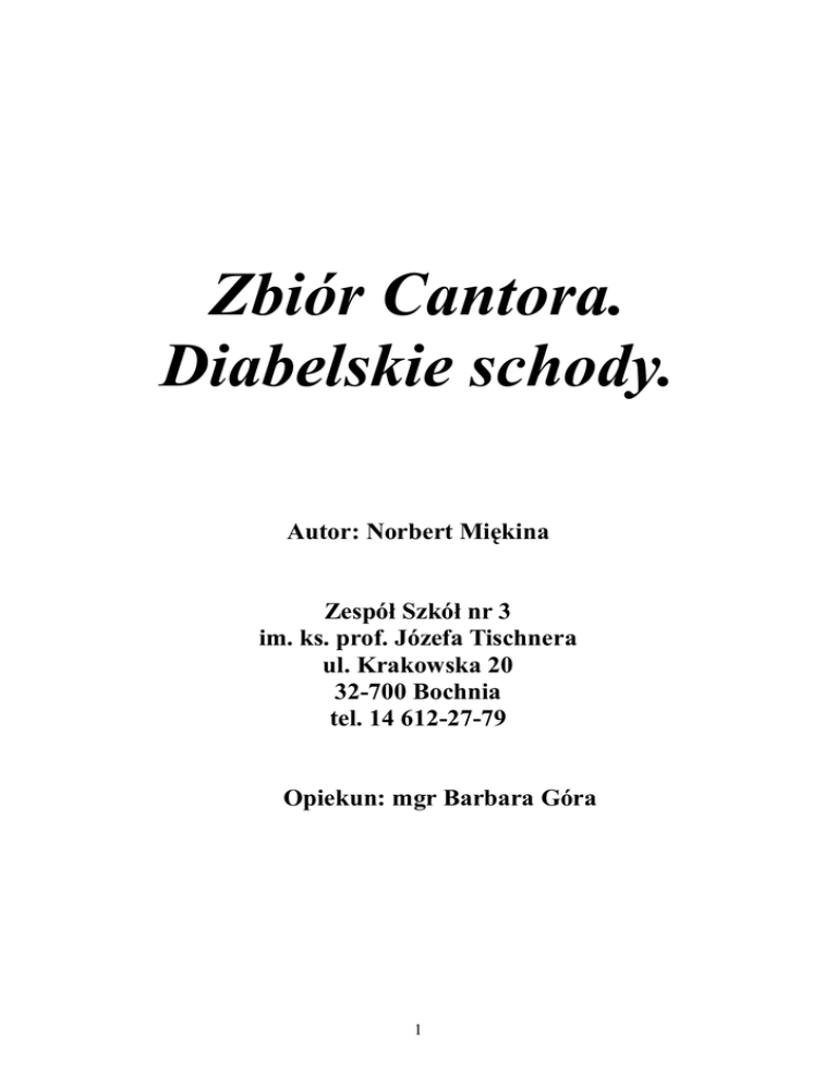 Zbiór Cantora. Diabelskie schody. Autor: Norbert Miękina Zespół Szkół nr 3 im. ks. prof. Józefa Tischnera ul. Krakowska 20 32-700 Bochnia tel. 14 612-27-79 Opiekun: mgr Barbara Góra 1 „W matematyce sztuka stawiania problemów jest ważniejsza od sztuki ich rozwiązywania" Georg Cantor 2 Spis treści Wstęp……………………………………………………………..4 Georg Cantor……………………………………………............. 5 Fraktale........................……………………………………….......6 Zbiór Cantora...................................…………………………..... 7 Konstrukcja zbioru Cantora.......……………………………….....8 Diabelskie schody......……………………………………….…....9 Pole powierzchni diabelskich schodów……………………….....11 Samoafiniczność diabelskich schodów.......……………………. 12 Bibliografia………………………………………………….…...14 3 Wstęp Jestem uczniem pierwszej klasy technikum ekonomicznego w Zespole Szkół nr 3 im. ks. prof. Józefa Tischnera w Bochni. Praca niniejsza dotyczy bardzo ciekawego „tworu matematycznego” pełniącego ważną rolę w wielu dziedzinach matematyki, a mianowicie zbioru Cantora i diabelskich schodów. Przedstawiłem w niej konstrukcję zbioru Cantora i wykazałem, że zbiór ten jest samopodobny. W dalszej części pracy pokazałem konstrukcję diabelskich schodów, które są ściśle związane ze zbiorem Cantora. Udowodniłem w sposób graficzny i algebraiczny, że pole powierzchni diabelskich schodów jest równe 1/2. Wykazałem także, że schody nie są samopodobne i są samoafiniczne. Wykonałem stronę internetową przedstawiajacą zbiór Cantora oraz diabelskie schody. Przedstawione w niej animacje pomogą w lepszym zrozumieniu omawianych w niej tematów. Stronę internetową można zobaczyć na przesłanych płytach CD. 4 Georg Cantor Georg Cantor (1845-1918) niemiecki matematyk, profesor uniwersytetu w Halle. Stworzył teorię mnogości, którą przedstawił w książce „Podstawy ogólnej teorii mnogości”. Pracował także nad zagadnieniem liczb rzeczywistych i w 1874 r. dowiódł że zbiór taki jest nieprzeliczalny. W 1878 sformułował pojęcie mocy zbioru, aksjomat ciągłości i inne. Śmiałe idee Cantora zostały dopiero przyjęte po pewnym czasie przez ogół matematyków, dziś jednak są podstawowym fundamentem matematyki. 5 Fraktale Po raz pierwszy pojęcie fraktali zostało wprowadzone do matematyki za sprawą francuskiego matematyka i informatyka polskiego pochodzenia Benoita Mandelbrota w latach 70-tych XX wieku. Słowo fraktal (ang. fractal) pochodzi z łaciny od słowa fractus złamany. Nie łatwo jest popularnym językiem określić pojęcie fraktalu i ciągle jeszcze nie istnieje jego ścisła definicja. W uproszczeniu można powiedzieć, że fraktale są figurami, w których część figury jest podobna do całości. Moglibyśmy również podać przybliżoną inną definicję, że fraktal to obiekt samopodobny, o wymiarze ułamkowym lub bardziej poetycko słowami Jamesa Gleicka: Fraktal jest sposobem widzenia nieskończoności okiem duszy. Przykłady fraktali 6 Zbiór Cantora Zbiór Cantora to klasyczny fraktal mimo, że nie jest specjalnie pociągający dla oka. Podstawowy zbiór Cantora jest to nieskończony zbiór punktów odcinka jednostkowego [0,1]. Oznacza to, że możemy interpretować go jako zbiór pewnych liczb, np. 0,1, 1/3, 2/3, 1/9, 2/9, 7/9, 8/9, 1/27, 2/27, … Jeśli chcielibyśmy zaznaczyć te, jak również pozostałe punkty tego zbioru niewiele byśmy zobaczyli. Otóż zamiast punktów, rysujmy pionowe odcinki o jednakowej długości, które zaczynać się będą we wszystkich punktach zbioru Cantora. Pozwoli to ujrzeć trochę lepiej rozkład tych punktów na odcinku. Poniższy rysunek może dać nam pewne wyobrażenie o zbiorze Cantora. 7 Konstrukcja zbioru Cantora Zaczynamy od przedziału [0,1]. Następnie wyrzucamy otwarty przedział (1/3, 2/3) tzn. usuwamy środkową trzecią część przedziału [0,1] bez liczb1/3 i 2/3. Pozostaną dwa przedziały: [0, 1/3] i [2/3, 1], o długościach 1/3 każdy i kończy to podstawowy krok konstrukcji. Następnie powtarzamy krok konstrukcji w ten sposób, że z przedziałów [0, 1/3] i [2/3, 1] usuwamy środkowe części trzecie, otrzymamy więc cztery przedziały o długości 1/9 każdy. Postępujemy tak dalej. Innymi słowy jest to ciąg domkniętych przedziałów – jeden w kroku zerowym, dwa w pierwszym, cztery w drugim, osiem w trzecim itd. (tzn. 2n przedziałów o długości 1/3n każdy w n-tym kroku). Na rysunku przedstawiona jest graficznie ta konstrukcja. Każdy odcinek, który powstał podczas geometrycznej konstrukcji zbioru Cantora, zawiera cały zbiór Cantora pomniejszony w skali 1/3 k, dla odpowiedniego k. Możemy zatem rozważyć zbiór Cantora jako rodziny dowolnie małych części z których każda jest pomniejszona całym zbiorem.Tą właśnie własność zbioru Cantora określamy jako samopodobieństwo. 8 Diabelskie schody Diabelskie schody to fascynujący fraktal, będący krzywą fraktalną. Są ściśle związane ze zbiorem Cantora i jego konstrukcją. Zaczynamy od kwadratu o boku długości 1. Następnie zaczynamy konstruować zbiór Cantora na dolnym jego brzegu (tzn. kolejno usuwamy środkowe części trzecie, tak jak przedtem). Nad każdą usuwaną środkową częścią trzecią długości 1/3k ustawiamy prostokąt o podstawie 1/3k i odpowiedniej wysokości. Kolumnowa konstrukcja diabelskich schodów W pierwszym kroku ponad środkową częścią stawiamy prostokąt o podstawie będącej odcinkiem [1/3, 2/3] o wysokości 1/2. W następnym kroku wznosimy dwie kolumny, jedną o wysokości 1/4 nad odcinkiem [1/9, 2/9], a drugą o wysokości 3/4 nad odcinkiem [7/9, 8/9]. W trzecim kroku stawiamy cztery prostokąty o k-1 wysokościach 1/8, 3/8, 5/8, 7/8, a w k- tym kr