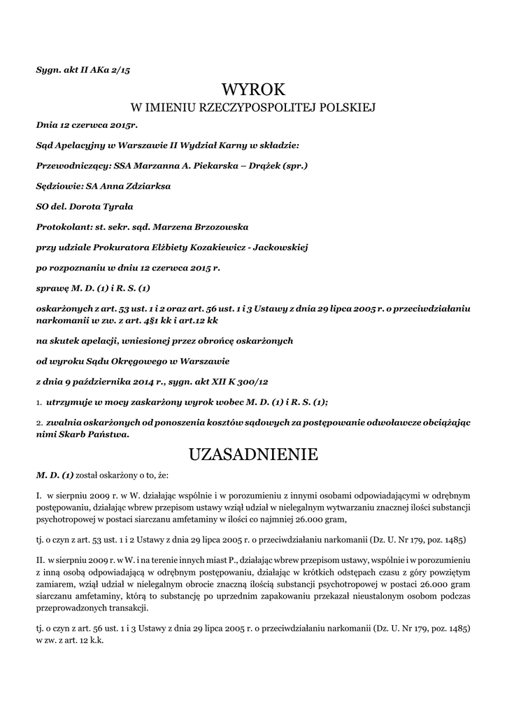 Sygn. akt II AKa 2/15 WYROK W IMIENIU RZECZYPOSPOLITEJ POLSKIEJ Dnia 12 czerwca 2015r. Sąd Apelacyjny w Warszawie II Wydział Karny w składzie: Przewodniczący: SSA Marzanna A. Piekarska – Drążek (spr.) Sędziowie: SA Anna Zdziarksa SO del. Dorota Tyrała Protokolant: st. sekr. sąd. Marzena Brzozowska przy udziale Prokuratora Elżbiety Kozakiewicz - Jackowskiej po rozpoznaniu w dniu 12 czerwca 2015 r. sprawę M. D. (1) i R. S. (1) oskarżonych z art. 53 ust. 1 i 2 oraz art. 56 ust. 1 i 3 Ustawy z dnia 29 lipca 2005 r. o przeciwdziałaniu narkomanii w zw. z art. 4§1 kk i art.12 kk na skutek apelacji, wniesionej przez obrońcę oskarżonych od wyroku Sądu Okręgowego w Warszawie z dnia 9 października 2014 r., sygn. akt XII K 300/12 1. utrzymuje w mocy zaskarżony wyrok wobec M. D. (1) i R. S. (1); 2. zwalnia oskarżonych od ponoszenia kosztów sądowych za postępowanie odwoławcze obciążając nimi Skarb Państwa. UZASADNIENIE M. D. (1) został oskarżony o to, że: I. w sierpniu 2009 r. w W. działając wspólnie i w porozumieniu z innymi osobami odpowiadającymi w odrębnym postępowaniu, działając wbrew przepisom ustawy wziął udział w nielegalnym wytwarzaniu znacznej ilości substancji psychotropowej w postaci siarczanu amfetaminy w ilości co najmniej 26.000 gram, tj. o czyn z art. 53 ust. 1 i 2 Ustawy z dnia 29 lipca 2005 r. o przeciwdziałaniu narkomanii (Dz. U. Nr 179, poz. 1485) II. w sierpniu 2009 r. w W. i na terenie innych miast P., działając wbrew przepisom ustawy, wspólnie i w porozumieniu z inną osobą odpowiadającą w odrębnym postępowaniu, działając w krótkich odstępach czasu z góry powziętym zamiarem, wziął udział w nielegalnym obrocie znaczną ilością substancji psychotropowej w postaci 26.000 gram siarczanu amfetaminy, którą to substancję po uprzednim zapakowaniu przekazał nieustalonym osobom podczas przeprowadzonych transakcji. tj. o czyn z art. 56 ust. 1 i 3 Ustawy z dnia 29 lipca 2005 r. o przeciwdziałaniu narkomanii (Dz. U. Nr 179, poz. 1485) w zw. z art. 12 k.k. R. S. (1) został oskarżony o to, że: I. w sierpniu 2009 r. w W. działając wspólnie i w porozumieniu z innymi osobami odpowiadającymi w odrębnym postępowaniu, działając wbrew przepisom ustawy wziął udział w nielegalnym wytwarzaniu znacznej ilości substancji psychotropowej w postaci siarczanu amfetaminy w ilości co najmniej 26.000 gram, tj. o czyn z art. 53 ust. 1 i 2 Ustawy z dnia 29 lipca 2005 r. o przeciwdziałaniu narkomanii (Dz. U. Nr 179, poz. 1485) II. w sierpniu 2009 r. w W. i na terenie innych miast P., działając wbrew przepisom ustawy, wspólnie i w porozumieniu z inną osobą odpowiadającą w odrębnym postępowaniu, działając w krótkich odstępach czasu z góry powziętym zamiarem, wziął udział w nielegalnym obrocie znaczną ilością substancji psychotropowej w postaci 26.000 gram siarczanu amfetaminy, którą to substancję po uprzednim zapakowaniu przekazał nieustalonym osobom podczas przeprowadzonych transakcji, tj. o czyn z art. 56 ust. 1 i 3 Ustawy z dnia 29 lipca 2005 r. o przeciwdziałaniu narkomanii (Dz. U. Nr 179, poz. 1485) w zw. z art. 12 k.k. Sąd Okręgowy, wyrokiem z dnia 9 października 2014 r. w sprawie sygn. akt XII K 300/12, orzekł: I. ustalając, w ramach czynów wskazanych jako pierwsze w obu aktach oskarżenia, że : oskarżeni M. D. (1) i R. S. (1) : w sierpniu 2009r. w W. działając wspólnie i w porozumieniu oraz z inną ustaloną osobą, działając nadto wbrew przepisom ustawy wzięli udział w nielegalnym wytwarzaniu znacznej ilości substancji psychotropowej w postaci siarczanu tj. amfetaminy w ilości co najmniej 26.000 gram, uznał oskarżonych M. D. (1) i R. S. (1) za winnych popełnienia czynu wyczerpującego dyspozycję art. 53 ust. 1 i 2 Ustawy z dnia 29.07.2005r. o przeciwdziałaniu narkomanii (Dz. U. Nr 179, poz. 1485),i za to na podstawie z art. 53 ust. 2 Ustawy z dnia 29.07.2005r. o przeciwdziałaniu narkomanii (Dz. U. Nr 179, poz. 1485) wymierzył oskarżonym: M. D. (1) karę 4 (czterech ) lat pozbawienia wolności i karę 200 (dwustu) stawek dziennych grzywny ustalając wysokość jednej stawki na 100 (sto) złotych oraz R. S. (1) karę 4 (czterech) lat pozbawienia wolności i karę 200 (dwustu ) stawek dziennych grzywny ustalając wysokość jednej stawki na 100 (sto) złotych; II. ustalając, w ramach czynów wskazanych jako drugie w obu aktach oskarżenia, że : oskarżeni M. D. (1) i R. S. (1) : w sierpniu 2009r. w nieustalonych miejscach na terenie Rzeczypospolitej Polskiej, działając wbrew przepisom ustawy, wspólnie i w porozumieniu, działając nadto w krótkich odstępach czasu z góry powziętym zamiarem, wzięli udział w nielegalnym obrocie znaczną ilością substancji psychotropowej w postaci 26.000 gram siarczanu amfetaminy, którą to substancję po uprzednim zapakowaniu przekazali nieustalonym osobom podczas przeprowadzonych transakcji, przy zastosowaniu art. 4 § 1 k.k. , uznał oskarżonych M. D. (1) i R. S. (1) za winnych popełnienia czynu wyczerpującego dyspozycję art. 56 ust. 1 i 3 Ustawy z dnia 29 lipca 2005r. o przeciwdziałaniu narkomanii (Dz. U. Nr 179, poz. 1485) w brzmieniu obowiązującym do dnia 09 grudnia 2011 r. w zw. z art. 12 k.k. i za to na podstawie z art. 56 ust. 3 Ustawy z dnia 29 lipca 2005 r. o przeciwdziałaniu narkomanii (Dz. U. Nr 179, poz. 1485) w brzmieniu obowiązującym do dnia 09 grudnia 2011 r., wymierzył oskarżonym: M. D. (1) karę 3 (trzech) lat pozbawienia wolności i karę 200 (dwustu) stawek dziennych grzywny ustalając wysokość jednej stawki na 100 (sto) złotych oraz R. S. (1) karę 3 (trzech) lat pozbawienia wolności i karę 200 (dwustu ) stawek dziennych grzywny ustalając wysokość jednej stawki na 100 (sto) złotych; III. na podstawie art. 85 k.k. i art. 86 § 1 i 2 k.k. połączył kary jednostkowe pozbawienia wolności i grzywny opisane wyżej w pkt I i II wyroku i wymierzył oskarżonemu M. D. (1) karę łączną 5 (pi