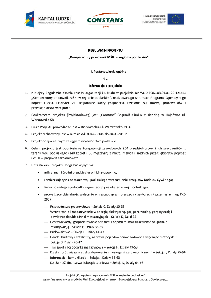 REGULAMIN PROJEKTU „Kompetentny pracownik MŚP w regionie podlaskim” I. Postanowienia ogólne §1 Informacje o projekcie 1. Niniejszy Regulamin określa zasady organizacji i udziału w projekcie Nr WND-POKL.08.01.01-20-124/13 „Kompetentny pracownik MŚP w regionie podlaskim”, realizowanego w ramach Programu Operacyjnego Kapitał Ludzki, Priorytet VIII Regionalne kadry gospodarki, Działanie 8.1 Rozwój pracowników i przedsiębiorstw w regionie. 2. Realizatorem projektu (Projektodawcą) jest „Constans” Bogumił Klimiuk z siedzibą w Hajnówce ul. Warszawska 58. 3. Biuro Projektu prowadzone jest w Białymstoku, ul. Warszawska 79 D. 4. Projekt realizowany jest w okresie od 01.04.2014r. do 30.06.2015r. 5. Projekt obejmuje swym zasięgiem województwo podlaskie. 6. Celem projektu jest podniesienie kompetencji zawodowych 200 przedsiębiorców i ich pracowników z terenu woj. podlaskiego (140 kobiet i 60 mężczyzn) z mikro, małych i średnich przedsiębiorstw poprzez udział w projekcie szkoleniowym. 7. Uczestnikami projektu mogą być wyłącznie: · mikro, mali i średni przedsiębiorcy i ich pracownicy; · zamieszkujący na obszarze woj. podlaskiego w rozumieniu przepisów Kodeksu Cywilnego; · firmy posiadające jednostkę organizacyjną na obszarze woj. podlaskiego; · prowadzące działalność wyłącznie w następujących branżach / sektorach / przemysłach wg PKD 2007: ¾ Przetwórstwo przemysłowe – Sekcja C, Działy 10-33 ¾ Wytwarzanie i zaopatrywanie w energię elektryczną, gaz, parę wodną, gorącą wodę i powietrze do układów klimatyzacyjnych – Sekcja D, Dział 35 ¾ Dostawa wody; gospodarowanie ściekami i odpadami oraz działalność związana z rekultywacją – Sekcja E, Działy 36-39 ¾ Budownictwo – Sekcja F, Działy 41-43 ¾ Handel hurtowy i detaliczny; naprawa pojazdów samochodowych włączając motocykle – Sekcja G, Działy 45-47 ¾ Transport i gospodarka magazynowa – Sekcja H, Działy 49-53 ¾ Działalność związana z zakwaterowaniem i usługami gastronomicznymi – Sekcja I, Działy 55-56 ¾ Informacja i komunikacja – Sekcja J, Działy 58-63 ¾ Działalność finansowa i ubezpieczeniowa – Sekcja K, Działy 64-66 Projekt „Kompetentny pracownik MŚP w regionie podlaskim” współfinansowany ze środków Unii Europejskiej w ramach Europejskiego Funduszu Społecznego. 8. 9. ¾ Działalność profesjonalna, naukowa i techniczna – Sekcja M, Działy 69-75 ¾ Opieka zdrowotna i pomoc społeczna – Sekcja Q, Działy 86-88 ¾ Działalność organizatorów turystyki, pośredników i agentów turystycznych oraz pozostała działalność usługowa w zakresie rezerwacji i działalności z nią związane – Sekcja N, Dział 79 ¾ Pozostała działalność usługowa – Sekcja S, Działy 94-96. Wsparcie nie może być udzielone na projekty dotyczące działalności gospodarczej polegającej na produkcji, przetwarzaniu lub marketingu produktów wymienionych w Załączniku I do Traktatu ustanawiającego Wspólnotę Europejską. Oferowane formy wsparcia w ramach projektu to: · Szkolenia "Akademia Językowa" – (120h/os.) realizowane w dwóch turach x 100 osób przez okres 10 miesięcy każda tura, tj. w okresie: I tura-05-06.2014-04.2014; II tura-11.2014-06.2015; · Szkolenia "Akademia Bezpiecznej Jazdy" - (9h/os.) realizowane w formie 3-godzinnych zajęć grupowych z teorii ratownictwa i udzielania pierwszej pomocy przedmedycznej (2h) i teorii bezpiecznej jazdy, psychologii powstawania wypadków drogowych oraz zarys zagadnień związanych z oszczędną jazdą samochodem zwaną Eco driving (1h) oraz 6-godzinnych zajęć indywidualnych – zajęcia praktyczne doskonalące indywidualne umiejętności kierowcy z bezpiecznej jazdy. 10. Wszystkie informacje, dokumenty i formularze dotyczące realizacji projektu dostępne są na stronie internetowej Projektodawcy http://constans.edu.pl/ oraz w Biurze Projektu. 11. Ogólny nadzór nad realizacją projektu, a także rozstrzyganie spraw, które nie są uregulowane w niniejszym Regulaminie należy do kompetencji Koordynatora Projektu. §2 Definicje Projekt – przedsięwzięcie realizowane w ramach Działania 8.1 „Kompetentny pracownik MŚP w regionie podlaskim”, Poddziałania 8.1.1 „Wspieranie rozwoju kwalifikacji zawodowych i doradztwo dla przedsiębiorstw” Programu Operacyjnego Kapitał Ludzki, wyłoniony w drodze konkursu zamkniętego nr 2/POKL/8.1.1/2/2013 w oparciu o złożony wniosek o dofinansowanie realizacji projektu w Wojewódzkim Urzędzie Pracy w Białymstoku. Projektodawca – podmiot realizujący projekt „Kompetentny pracownik MŚP w regionie podlaskim”, który na podstawie umowy o dofinansowanie projektu Nr UDA-POKL.08.01.01-20-124/13 otrzymał zgodę na jego realizację. Uczestnik – osoba zakwalifikowana do udziału w projekcie (mikro, mały lub średni przedsiębiorca bądź jego pracownik delegowany do udziału w projekcie); przez pojęcie Uczestnik rozumie się zarówno kobietę jak i mężczyznę. Beneficjent Pomocy – podmiot ubiegający się o udzielenie pomocy de minimis, który pozytywnie przeszedł ocenę kwalifikowania się do udzielenia pomocy. Pomoc de minimis – pomoc publiczna udzielona w oparciu o: 1) Rozporządzenie Komisji (WE) Nr 800/2008 z dnia 6 sierpnia 2008 r. uznające niektóre rodzaje pomocy za zgodne ze wspólnym rynkiem w zastosowaniu art. 87 i 88 Traktatu (ogólne rozporządzenie o wyłączeniach blokowych) (Dz. U. UE L 214 z 09.08.2008, s. 3) 2) Rozporządzenie Komisji (UE) nr 1224/2013 z dnia 29 listopada 2013 r. zmieniające rozporządzenie (WE) nr 800/2008 w odniesieniu do okresu jego stosowania (Dz. Urz. UE L 320 z 30.11.2013, s. 22) Projekt „Kompetentny pracownik MŚP w regionie podlaskim” współfinansowany ze środków Unii Europejskiej w ramach Europejskiego Funduszu Społecznego. 3) Rozporządzenie Komisji (WE) Nr 1998/2006 z dnia 15 grudnia 2006 r. w sprawie stosowania art. 87 i 88 Traktatu WE do pomocy de minimis (Dz. U. UE L