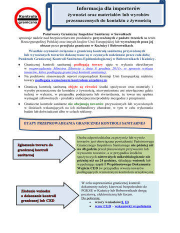 Informacja dla importerów żywności oraz materiałów lub wyrobów przeznaczonych do kontaktu z żywnością Państwowy Graniczny Inspektor Sanitarny w Suwałkach sprawuje nadzór nad bezpieczeństwem produktów przywożonych z państw trzecich na teren Rzeczypospolitej Polskiej oraz innych krajów Unii Europejskiej lub wywożonych poza jej obszar przez przejścia graniczne w Kuźnicy i Bobrownikach. Wszelkie czynności związane z graniczną kontrolą sanitarną przywożonych lub wywożonych towarów dokonywane są w czynnych codziennie przez cała dobę Punktach Granicznej Kontroli Sanitarno-Epidemiologicznej w Bobrownikach i Kuźnicy. Granicznej kontroli sanitarnej podlegają towary ujęte w wykazie określonym w rozporządzeniu Ministra Zdrowia z dnia 8 grudnia 2011r. w sprawie wykazu towarów, które podlegają granicznej kontroli sanitarnej. Na podstawie stosowanych wprost rozporządzeń Komisji Unii Europejskiej niektóre towary podlegają wzmożonym kontrolom urzędowym. Graniczą kontrolą sanitarną objęte są również środki spożywcze oraz materiały i wyroby przeznaczone do kontaktu z żywnością, niewymienione ani niewłączone gdzie indziej w wykazie, w przypadku podejrzenia lub stwierdzenia, że towar nie spełnia wymagań zdrowotnych - produkty niebezpieczne/produkty niezgodne z przepisami. Graniczne kontrole sanitarne nie obejmują towarów przywożonych lub wywożonych w ilościach wskazujących na ich niehandlowy charakter, w tym w celu wykonania badań lub doświadczeń albo w celach reklamy. Osoba odpowiedzialna za przywóz lub wywóz towarów jest obowiązana powiadomić Państwowego Granicznego Inspektora Sanitarnego nie później niż na 48 godzin przed planowanym przywozem lub wywozem towarów, a w przypadku środków spożywczych nietrwałych mikrobiologicznie nie później niż na 24 godziny, składając wniosek lub wypełniając część I Wspólnotowego Dokumentu Wejścia CED (w przypadku wwozu towarów podlegających wzmożonym kontrolom urzędowym). W celu usprawnienia granicznej kontroli dokumenty należy kierować bezpośrednio do PGKSE w Kuźnicy lub Bobrownikach drogą pocztową, elektroniczną lub faxem. Do pobrania: wzory wniosków(I, II) wzór CED – wskazówki wypełniania Do każdej przesyłki należy dołączyć niezbędną dokumentację: umożliwiającą identyfikację towaru (np. karnet TIR, CMR, faktury, specyfikacje) deklaracje i świadectwa potwierdzające, że towar spełnia wymagania zdrowotne ustanowione przepisami prawa żywnościowego. W uzasadnionych przypadkach deklaracje winne być poparte wynikami badań w zakresie: zanieczyszczeń chemicznych, mikrobiologicznych i innych skażeń promieniotwórczych genetycznej modyfikacji. Dokumentacja winna być przedkładana w języku polskim lub w innym języku urzędowym Unii Europejskiej. Jeżeli ze względu na bezpieczeństwo żywności okaże się to niezbędne, państwowy graniczny inspektor sanitarny może zażądać uwierzytelnionego tłumaczenia dokumentacji przedłożonej w innym języku Unii Europejskiej. W trakcie granicznej kontroli sanitarnej na granicy Państwa dokonuje się: przeglądu i oceny dokumentacji oceny warunków transportu oględzin przesyłki oraz oceny zgodności z wymaganiami prawa żywnościowego. W ramach granicznej kontroli może zachodzić konieczność pobrania próbek do badań laboratoryjnych w przypadku: realizacji rozporządzeń Komisji Europejskiej o specjalnych warunkach importu uzasadnionego podejrzenia, co do jakości zdrowotnej przewożonych produktów realizacji planu próbkobrania innych doraźnych wskazań GIS. Graniczna kontrola sanitarna zakończona jest wydaniem odpowiedniego świadectwa: potwierdzającego spełnienie wymagań zdrowotnych oraz dopuszczającego produkt do obrotu w Unii Europejskiej lub stwierdzającego, że produkt nie spełnia wymagań prawa żywnościowego i nie wyraża się zgody na przywóz. W przypadku towarów podlegających szczególnym warunkom wwozu, graniczna kontrola sanitarna zakończona jest wypełnieniem odpowiedniej części Wspólnotowego Dokumentu Wejścia (CED) będącego potwierdzeniem, iż przesyłka jest: zatwierdzona i dopuszczona do swobodnego obrotu - kontrola zadawalająca lub niezatwierdzona – kontrola niezadawalająca Każdy produkt odrzucony na granicy zgłaszany jest do systemu Wczesnego Ostrzegania o Niebezpiecznej Żywności i Paszach – RASFF W szczególnie uzasadnionych przypadkach, Państwowy Graniczny Inspektor Sanitarny może wyrazić zgodę na przeprowadzenie granicznej kontroli sanitarnej przez państwowego powiatowego inspektora sanitarnego właściwego ze względu na siedzibę odbiorcy lub miejsce złożenia towaru, o czym zawiadamia właściwy organ celny. Za czynności związane z przeprowadzaniem granicznej kontroli sanitarnej pobierane są opłaty w formie decyzji. Opłatę można uiścić w oddziale banku lub dokonując przelewu na konto: nr 03 10101049 006031223 1000000. Projekt i opracowanie: Graniczna Stacja Sanitarno-Epidemiologiczna w Suwałkach