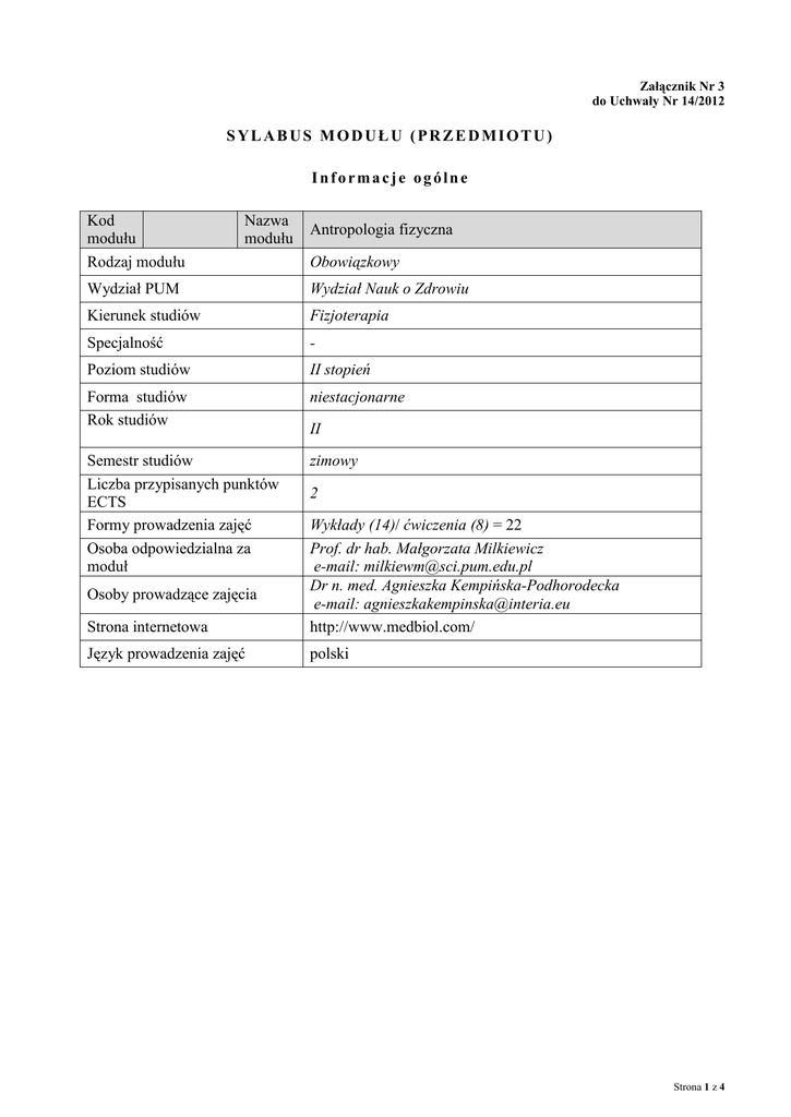 Załącznik Nr 3 do Uchwały Nr 14/2012 SYLABUS MODUŁU (PRZEDMIOTU) Informacje ogólne Kod modułu Rodzaj modułu Nazwa modułu Antropologia fizyczna Obowiązkowy Wydział PUM Wydział Nauk o Zdrowiu Kierunek studiów Fizjoterapia Specjalność - Poziom studiów II stopień Forma studiów Rok studiów niestacjonarne Semestr studiów Liczba przypisanych punktów ECTS Formy prowadzenia zajęć Osoba odpowiedzialna za moduł zimowy II 2 Strona internetowa Wykłady (14)/ ćwiczenia (8) = 22 Prof. dr hab. Małgorzata Milkiewicz e-mail: [email protected] Dr n. med. Agnieszka Kempińska-Podhorodecka e-mail: [email protected] http://www.medbiol.com/ Język prowadzenia zajęć polski Osoby prowadzące zajęcia Strona 1 z 4 Informacje szczegółowe Cele modułu Wiedzy Wymagania wstępne w zakresie Umiejętności Kompetencji społecznych Celem przedmiotu jest zapoznanie z genetycznymi i środowiskowymi uwarunkowaniami rozwoju, z mechanizmami kształtowania się cech fenotypowych w ontogenezie, z metodami kontroli przebiegu rozwoju ze szczególnym uwzględnieniem problematyki okresu rozwoju progresywnego. Student powinien posiadać podstawowe wiadomości z zakresu anatomii człowieka, biologii i genetyki. - Opis efektów kształcenia dla modułu (przedmiotu) numer Student, który zaliczył moduł efektu (przedmiot) kształcenia wie/umie/potrafi: Student posługuje się podstawowymi pojęciami podstawowymi pojęciami zakresu antropologii. Student umie dobrać pomiary i metody do zrealizowania W02 zaplanowanych problemów badawczych. Student wie jaki interpretować wyniki badań. Student potrafi prawidłowo U05 organizować i przeprowadzać badania antropometryczne. SYMBOL (odniesienie do) EKK K_W02 Sposób weryfikacji efektów kształcenia (forma zaliczeń) T K_U03 K_U04 S, P K_K02 K_K03 K02 D K_K04 K_K05 K_K09 Macierz efektów kształcenia dla modułu (przedmiotu) w odniesieniu do form zajęć Student potrafi zastosować poznaną wiedzę w swojej praktyce zawodowej. W02 K_W01, K_W11, K_W24 U05 K_U01,K_U03,K_U04, K_U05 K02 K_K01, K_U05 K_K04 Treść modułu (przedmiotu) kształcenia Symbol Opis treści kształcenia treści X inne ... Zajęcia praktyczne Ćwiczenia Ćw. projektowe Ćwiczenia kliniczne Ćw. laborat. Symbol modułu lub Student, który zaliczył moduł (przedmiot) wie/umie/potrafi: Zajęcia seminaryjne numer efektu kształcenia Wykład Forma zajęć dydaktycznych X X X Odniesienie do efektów kształcenia dla modułu Strona 2 z 4 kształcenia TK01 TK02 TK03 TK04 TK05 TK06 TK07 TK08 TK09 TK10 TK11 TK12 TK13 TK14 TK15 TK16 Wprowadzenie do zagadnień z antropologii. Przedmiot definicje. Rys historyczny. Antropogeneza - teorie i kierunki badań. Człowiek i zmiany w jego odżywianiu (dieta człowieka od neolitu do współczesności). Koncepcje rasy a antropologia. Mechanizmy rasogenezy. Zróżnicowanie etniczne ludności świata i Polski. Zjawiska rozwoju biologicznego człowieka. Etapy rozwoju osobniczego człowieka. Rozwój cech morfologicznych i proporcji ciała. Norma rozwojowa – teoretyczne i praktyczne aspekty oceny rozwoju biologicznego człowieka. Ewolucja badań nad człowiekiem (od odrodzenia do czasów współczesnych). Nowe kierunki badań antropologicznych(DNA, EMN). Ewolucja genomu człowieka. Autekologia i synekologia człowieka a antropologia. Ekologia środowiska pracy. Antropologia a ergonomia. Genetyka populacyjna człowieka. Ilościowy opis stanu i dynamik populacji ludzkiej. Zróżnicowanie fizjologiczne i biochemiczne człowieka. Genetyk a behawioralna. Determinanta środowiskowa i genetyczna zachowań człowieka. Biologiczne, socjobiologiczne i socjologiczne teorie genezy problemów społecznych. Agresja wewnątrzgatunkowa. Model i rzeczywistość życia rodzinnego. Starzenie się organizmów jako suma różnych procesów. Koncepcje dotyczące długości życia ludzkiego. Punkty antropometryczne. Pomiary antropometryczne. Podstawowe wskaźniki somatyczne. Antroposkopia (cefaloskopia i somatoskopia). Zmiany proporcji ciała w ontogenezie. Wskaźniki antropologiczne. Ocena budowy ciała. Typologie somatyczne. Metoda wskaźników przyrodniczych Perkala. Oszacowywanie składników tkankowych z gęstości i z pomiarów somatycznych. Metoda BIA. Czynniki rozwoju człowieka. Środowiskowe uwarunkowania rozwoju. Trend sekularny i akceleracja, z uwzględnieniem aspektów zdrowotnych. Rozwiązywanie zadań. Kryteria i metody oceny wieku rozwojowego. Metoda tablic Pirqueta. Metoda siatek M1_W02; M1_W02; M1_W02; M1_W02; M1_W02; M1_W02; M1_W02; M1_W02; M1_W02; M1_W02;M1_U05 M1_K02 M1_W02;M1_U05 M1_K02 M1_W02;M1_U05 M1_K02 M1_W02;M1_U05 M1_K02 M1_W02;M1_U05 M1_K02 M1_W02;M1_U05 M1_K02 M1_W02;M1_U05 M1_K02 Strona 3 z 4 centylowych.Metoda graficzna.Metoda morfograficzna. Wskaźnik stanu dojrzałości biologicznej WSDB. Piśmiennictwo i pomoce naukowe 1. Malinowski A., Strzałko J. (1989): Antropologia, Warszawa-Poznań, PWN. 2. Malinowski A., Bożiłow W. (1997): Podstawy antropometrii, Warszawa-Łódź, WydawnictwoNaukowe PWN. 3. Malinowski A., 1999, Wstęp do antropologii i ekologii człowieka, Wyd. Uniwersytetu Łódzkiego, Łódź. Literatura uzupełniająca: 1. Malinowski A., Wolański N. (1988) Metody badań w biologii człowieka. Wybór metod antropologicznych, PWN, Warszawa 2. Wolański N. (1981) Czynniki rozwoju biologicznego człowieka, PWN, Warszawa. 3. Iwanek B., Rogowska E. (2002) Antropologia. Materiały do ćwiczeń, Gdańsk: WydawnictwoAWFiS. 4. Łaska-Mierzejewska T. (1999) Rozwój osobniczy człowieka (ontogeneza) [w:] Antropologia J. Charzewski (red.), Wyd. AWF, Warszawa, 101-180 5. Malinowski A. (1987) Norma biologiczna a rozwój somatyczny człowieka, Warszawa, IWZZ. Nakład pracy studenta (bilans punktów ECTS) Obciążenie studenta [h] Forma nakładu pracy studenta (udział w zajęciach, aktywność, przygotowanie sprawozdania, itp.) Nauczyciel Godziny kontaktowe z nauczycielem 2 Przygotowanie do ćwiczeń 20 Czytanie wskazanej literatury Napisanie raportu z 