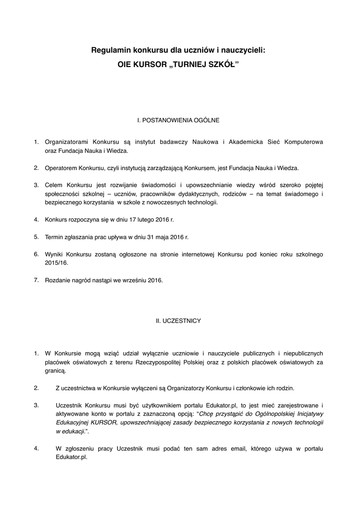 Regulamin konkursu dla uczniów i nauczycieli: OIE KURSOR „TURNIEJ SZKÓŁ” I. POSTANOWIENIA OGÓLNE 1. Organizatorami Konkursu są instytut badawczy Naukowa i Akademicka Sieć Komputerowa oraz Fundacja Nauka i Wiedza. 2. Operatorem Konkursu, czyli instytucją zarządzającą Konkursem, jest Fundacja Nauka i Wiedza. 3. Celem Konkursu jest rozwijanie świadomości i upowszechnianie wiedzy wśród szeroko pojętej społeczności szkolnej – uczniów, pracowników dydaktycznych, rodziców – na temat świadomego i bezpiecznego korzystania w szkole z nowoczesnych technologii. 4. Konkurs rozpoczyna się w dniu 17 lutego 2016 r. 5. Termin zgłaszania prac upływa w dniu 31 maja 2016 r. 6. Wyniki Konkursu zostaną ogłoszone na stronie internetowej Konkursu pod koniec roku szkolnego 2015/16. 7. Rozdanie nagród nastąpi we wrześniu 2016. II. UCZESTNICY 1. W Konkursie mogą wziąć udział wyłącznie uczniowie i nauczyciele publicznych i niepublicznych placówek oświatowych z terenu Rzeczypospolitej Polskiej oraz z polskich placówek oświatowych za granicą. 2. Z uczestnictwa w Konkursie wyłączeni są Organizatorzy Konkursu i członkowie ich rodzin. 3. Uczestnik Konkursu musi być użytkownikiem portalu Edukator.pl, to jest mieć zarejestrowane i aktywowane konto w portalu z zaznaczoną opcją: “Chcę przystąpić do Ogólnopolskiej Inicjatywy Edukacyjnej KURSOR, upowszechniającej zasady bezpiecznego korzystania z nowych technologii w edukacji.”. 4. W zgłoszeniu pracy Uczestnik musi podać ten sam adres email, którego używa w portalu Edukator.pl. III. ZASADY KONKURSU 1. Konkurs jest przeznaczony dla uczniów i nauczycieli trzech (3) poziomów placówek oświatowych: 1.1. szkoły podstawowej, 1.2. gimnazjum, 1.3. szkoły ponadgimnazjalnej. 2. Konkurs składa się z dwóch (2) etapów: (i) eliminacji i (ii) finału. 3. W celu wzięcia udziału w konkursie niezbędna jest rejestracja szkoły w portalu Edukator.pl (formularz zgłoszeniowy znajduje się pod adresem: http://media.edukator.pl/Rejestracja,10274.html). Rejestracji dokonuje nauczyciel danej szkoły, który staje się Koordynatorem projektu OIE KURSOR w tej szkole. Nauczyciel może być Koordynatorem w więcej niż jednej szkole. 4. W eliminacjach biorą udział uczniowie danej szkoły wybrani przez Koordynatora. 5. Eliminacje są indywidualne, a ich przeprowadzeniem zajmuje się Koordynator. Celem eliminacji jest wyłonienie reprezentacji szkolnej, która weźmie udział w rozgrywkach finałowych. 6. Eliminacje są przeprowadzane w oparciu o test internetowy przygotowany przez Organizatorów i zamieszczony na stronie internetowej konkursu w portalu Edukator.pl. 7. Eliminacje polegają na: a) zapoznaniu się z materiałami OIE KURSOR, dostępnymi na stronie http://www.edukator.pl/ index.php/main/index/page/10241, b) zalogowaniu się do portalu Edukator, c) przejściu do Konkursu „Turniej szkół” i wybraniu własnej szkoły, d) udzieleniu odpowiedzi na losowo wygenerowany zestaw pytań, dotyczących bezpieczeństwa w Internecie i posługiwania się nowoczesnymi technologiami. Każdy z uczestników może podejść do wypełnienia testu trzy (3) razy. 8. Do finału przechodzą maksymalnie trzy (3) reprezentacje z danej szkoły, złożone maksymalnie z trzech (3) uczniów, którzy uzyskają najwyższą liczbę punktów. Reprezentacji lub reprezentacjom przewodzi Koordynator. 9. Po przeprowadzeniu eliminacji Koordynator powinien przesłać do Organizatorów listę reprezentantów z danej szkoły poprzez formularz zgłoszeniowy reprezentacji szkolnej, dostępny na stronie internetowej Konkursu. Lista powinna zawierać adresy email uczniów, pod jakimi są oni zarejestrowani w portalu Edukator.pl 10. Operator Konkursu udostępni Koordynatorowi w jego koncie w portalu Edukator.pl bieżący ranking jego uczniów, biorących udział w eliminacjach, obejmujący wyniki lub postępy każdego z nich. 11. W przypadku uzyskania takiej samej liczby punktów przez większą liczbę Uczestników, niż przewiduje to Regulamin do składu reprezentacji, Koordynator organizuje dogrywkę lub dokonuje samodzielnego wyboru spomiędzy tych Uczestników. 12. Rozgrywka finałowa polega na wykonaniu pracy — sporządzeniu projektu scenariusza: a) krótkiego filmu animowanego (o długości do 90 sekund) lub b) krótkiego spotu społecznościowego (o długości do 45 sekund) o charakterze edukacyjnym, informacyjnym lub reklamowym, obejmującym zasady bezpiecznego korzystania z Internetu lub nowoczesnych technologii. 13. Do Konkursu należy zgłaszać wyłącznie nowe prace lub takie, które nie zostały nagrodzone w innych konkursach. 14. Dopuszczalna forma pracy to: tekst lub prezentacja. 15. Dopuszczalny format załączonego pliku to taki, który jest obsługiwany przez najpopularniejsze aplikacje służące do jego utworzenia lub odczytania (np. z pakietów MS Office, OpenOffice, iWork, Acrobat PDF Reader). 16. Przystąpienie Uczestnika do eliminacji oznacza akceptację warunków Regulaminu Konkursu. IV. NADSYŁANIE PRAC 1. Zgłoszenia prac należy przesyłać poprzez wypełnienie formularza zgłoszeniowego na stronie KONKURSY projektu OIE KURSOR (http://www.edukator.pl/Konkurs,10485.html). 2. Prace mogą być zredagowane wyłącznie w języku polskim. 3. Zgłoszenia pracy dokonuje Koordynator. W zgłoszeniu należy podać imię i nazwisko oraz adres email Koordynatora, a także nazwę i miejsce placówki oświatowej, w której jest zatrudniony. 4. Praca powinna zostać załączona do zgłoszenia. 5. Każdy Koordynator może przesłać maksymalnie 1 (jedną) pracę autorstwa każdej reprezentacji danej szkoły. V. KOMISJA 1. Organizatorzy Konkursu powołają Komisję oceniającą nadesłane prace, wyłaniającą laureatów Konkursu oraz przyznającą nagrody za prace najciekawsze i najbardziej oryginalne. W skład Komisji wejdą przedstawiciele Organizatorów. 2. Podstawą decyzji Komisji są oceny poszczególnych jej członków, biorące pod