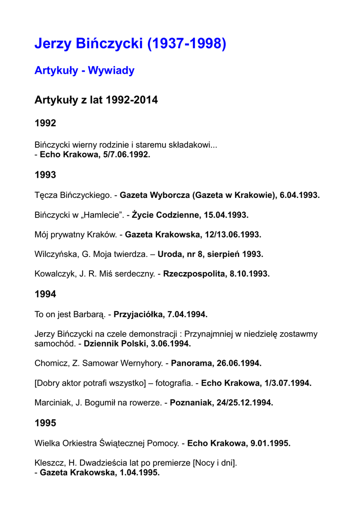 Jerzy Bińczycki (1937-1998) Artykuły - Wywiady Artykuły z lat 1992-2014 1992 Bińczycki wierny rodzinie i staremu składakowi... - Echo Krakowa, 5/7.06.1992. 1993 Tęcza Bińczyckiego. - Gazeta Wyborcza (Gazeta w Krakowie), 6.04.1993. Bińczycki w „Hamlecie”. - Życie Codzienne, 15.04.1993. Mój prywatny Kraków. - Gazeta Krakowska, 12/13.06.1993. Wilczyńska, G. Moja twierdza. – Uroda, nr 8, sierpień 1993. Kowalczyk, J. R. Miś serdeczny. - Rzeczpospolita, 8.10.1993. 1994 To on jest Barbarą. - Przyjaciółka, 7.04.1994. Jerzy Bińczycki na czele demonstracji : Przynajmniej w niedzielę zostawmy samochód. - Dziennik Polski, 3.06.1994. Chomicz, Z. Samowar Wernyhory. - Panorama, 26.06.1994. [Dobry aktor potrafi wszystko] – fotografia. - Echo Krakowa, 1/3.07.1994. Marciniak, J. Bogumił na rowerze. - Poznaniak, 24/25.12.1994. 1995 Wielka Orkiestra Świątecznej Pomocy. - Echo Krakowa, 9.01.1995. Kleszcz, H. Dwadzieścia lat po premierze [Nocy i dni]. - Gazeta Krakowska, 1.04.1995. Jerzy Bińczycki. - Echo Krakowa, 18.07.1995. Ziemianin, M. Wakacje Jerzego Bińczyckiego, czyli co to jest akcja „nic”. - Gazeta Krakowska, 30.08.1995. Człowiek z ekranu. - Trybuna, 2/3.09.1995. Zdanowska, J. Moje role to tylko gra. - Przyjaciółka, 12.12.1995. 1996 10 pytań do dwojga. [fotografia]. - Zwierciadło nr 7, lipiec 1996. Krawat pana Jurka. - Panorama, 1.09.1996. 1997 Szulc, A. Aktor – opoka. - Gazeta Krakowska, 28.03.1997. Budzińska, A. Czy spełni daną rodzinie obietnicę? - Życie na gorąco, 21.08.1997. Biedrzycka, A. Jerzy Bińczycki: Aktor, ogrodnik, cyklista. - Kurier Polski, 3/5.10.1997. 1998 Bińczycki z kluczami : Dyrektorskie roszady w Starym Teatrze. [niedokończony]. - Gazeta Krakowska, 1.07.1998. Oczekiwana zmiana miejsc : Jerzy Bińczycki dyrektorem Starego Teatru. - Dziennik Polski, 1.07.1998. Paprotka Bińczyckiego : Jesienna wyprzedaż w Ogrodzie Botanicznym. - Gazeta Krakowska, 19/20.09.1998. Jerzy Bińczycki 1937-1998 : Wszystkim bliski ; Zbyt wielki stres ; Do serca w niedzielę ; Był kimś z rodziny : Aktorzy Starego Teatru wstrząśnięci. - Dziennik Polski, 3.10.1998. Zmarł Jerzy Bińczycki. - Rzeczpospolita, 3/4.10.1998. Wrażliwy ogrodnik ; Cieślak, J. Testament dyrektora. - Rzeczpospolita, 3/4.10.1998. Zmarł Jerzy Bińczycki. - Gazeta Wyborcza, 3/4.10.1998. Śmierć aktora : Jerzy Bińczycki opuścił na zawsze swój teatr. - Dziennik Polski, 3/4.10.1998. Biedrzycka, A. Jerzy Bińczycki nie żyje. - Kurier Polski, 5.10.1998. Jurasz, W. Śmierć aktora. - Życie, 5.10.1998. Nekrologi. - Gazeta Wyborcza, 3/4.10.1998. - Gazeta Wyborcza, 5.10.1998. - Dziennik Polski, 5.10.1998. - Gazeta Wyborcza, 6.10.1998. - Dziennik Polski, 6.10.1998. Ostatnia droga Jerzego Bińczyckiego. - Dziennik Polski, 6.10.1998. Nekrologi. - Gazeta Wyborcza, 7.10.1998. - Dziennik Polski, 7.10.1998. - Gazeta Wyborcza, 8.10.1998. - Dziennik Polski, 8.10.1998. Pożegnanie Jerzego Bińczyckiego. - Rzeczpospolita, 9.10.1998. Mikos, M. Pożegnalny walc : Pogrzeb Jerzego Bińczyckiego. - Gazeta Wyborcza, 9.10.1998. Pożegnanie aktora. - Gazeta Krakowska, 9.10.1998. Huzarska-Szumiec, M. Binio, pan Jerzy, Jurek... - Gazeta Krakowska, 9.10.1998. Pożegnanie Jerzego Bińczyckiego. - Dziennik Polski, 9.10.1998. Zostały wspomnienia. Dzisiaj pogrzeb Jerzego Bińczyckiego. - Dziennik Polski, 9.10.1998. Polewka, J. Tydzień – wieczność ; Nowicki, J. Na jakiś czas jeszcze zostaniemy. - Gazeta Wyborcza (Gazeta w Krakowie), 10/11.10.1998. Bliskie spotkania : NCK. Przegląd dorobku Jerzego Bińczyckiego. - Gazeta Wyborcza, 12.10.1998. Hołd dla wielkiego aktora. - Dziennik Polski, 13.10.1998. Noce i dni Bińczyckiego : Nowohuckie Centrum Kultury. - Echo Krakowa, 17-18.10.1998. [250 unikatowych fotografii Jerzego Bińczyckiego...] - Tygodnik AWS, 18.10.1998. 1999 Jerzy Bińczycki: człowiek barwny. - Gazeta Wyborcza, 2/3.10.1999. 2001 Patron z nocy i dni : Witkowice. Uroczystość nadania imienia Jerzego Bińczyckiego SP nr 68. - Gazeta Krakowska, 21/22.04.2001. Dobry duch w promieniach słońca. - Gazeta Krakowska, 3.10.2001. [Przed wejściem do Starego Teatru w Krakowie przyjaciele odsłonili wczoraj tablicę upamiętniającą Jerzego Bińczyckiego...] - Gazeta Krakowska, 3.10.2001. Po prostu aktor. - Express Inowrocławski, 3.10.2001. Dobry duch teatru. - Dziennik Polski, 3.10.2001. 2005 Teatr i ogród : Rozmowa z Elżbietą Bińczycką. - Gazeta Wyborcza, 31.03.2005. 2007 Elżbieta Bińczycka : Kto jest Kim w Krakowie. - Dziennik Polski, 27.05.2007. 2009 Janiszewska, K. Jerzy, ma w sobie coś dostojnego. - Gazeta Krakowska, 22.04.2009. 2010 Weryńska, J. Uczniowie i przyjaciele pamiętają o Bińczyckim. - Gazeta Krakowska, 21.04.2010. 2014 Janiszewska, K. Bińczycki. Nie był amantem. Miał w sobie aktorską głębię. - Gazeta Krakowska, 30.04/1.05.20 Wywiady z lat 1984-1998 1984 Ludzimierska-Żyła, J. Chętnie przyjmuję role, które zaskakują. - Dziennik Polski, 2.02.1984. Stankiewiczówna, T. L. Przeskoczyć siebie. - Sztandar Młodych, 10/12.08.1984. 1985 Klemiato, W. W teatrze jestem wolnym człowiekiem - Gazeta Krakowska, 31.12.1985/1.01.1986. 1989 Biełous, U. Jestem ze stada. - Kultura, 8.03.1989. 1992 Kowalczyk, J. R. Obsadzano mnie kontrastowo. - Rzeczpospolita, 11/12.04.1992. 1993 Modrzejewska, E. Z Jerzym Bińczyckim pogwarki w ogrodzie. - Super Express, 2-4.07.1993. Bez dramatu niespełnienia : Mój pierwszy raz: Jerzy Bińczycki. - Dziennik Polski, 18/19.12.1993. 1995 Budzińska, A. Miłość nadaje sens życiu. - Echo Krakowa, 13/15.01.1995. Kasprzyk, M. Doskonalenie charakteru i ciała. - Echo Krakowa, 20/22.01.1995. Toporek, M. Oczekiwanie ożywczych zaskoczeń. - Trybuna, 4/5.02.1995. Sondej, M. Po prostu zawód. - Gazeta Wyborcza (Gazeta Łódzka), 5.05.1995. Morytko, W. Bogumił Niechcic też jeździ na rowerze. - Przegląd Sportowy, 12/14.05.1995. Karolak, H. 10 pytań do dwojga. - Zwierciadło, nr 11, listopad 1995. Malatyńska-Stankiewicz, A. Grunt to rodzinka.