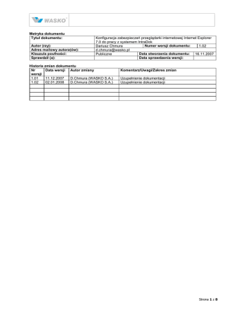 Metryka dokumentu Tytuł dokumentu: Autor (rzy): Adres mailowy autora(ów): Klauzula poufności: Sprawdził (a): Konfiguracja zabezpieczeń przeglądarki internetowej Internet Explorer 7.0 do pracy z systemem IntraDok Numer wersji dokumentu: Dariusz Chmura 1.02 [email protected] Data stworzenia dokumentu: 16.11.2007 Publiczne Data sprawdzenia wersji: Historia zmian dokumentu Nr Data wersji Autor zmiany wersji 1.01 11.12.2007 D.Chmura (WASKO S.A.) 1.02 02.01.2008 D.Chmura (WASKO S.A.) Komentarz/Uwagi/Zakres zmian Uzupełnienie dokumentacji Uzupełnienie dokumentacji Strona 1 z 8 Konfiguracja zabezpieczeń przeglądarki internetowej Internet Explorer 7.0 do pracy z systemem IntraDok. W celu poprawnego działania Elektronicznego Systemu Obiegu Dokumentów IntraDok należy dodać adres systemu do strefy zaufanych witryn oraz zmienić poziom zabezpieczeń dla tej strefy. W tym celu w menu przeglądarki wybierz opcję Narzędzia, następnie Opcje internetowe. W uruchomionym okienku przejdź do zakładki Zabezpieczenia i wybierz Zaufane witryny. Następnie wybierz przycisk Witryny. W polu Dodaj tę witrynę sieci Web do strefy wpisz adres systemu np. http://intradok/ Strona 2 z 8 Strona 3 z 8 Uwaga: Jeżeli nie używasz szyfrowanej wersji protokołu HTTP, czyli adres systemu nie ma przedrostka https:// (HyperText Transfer Protocol Secure) należy odznaczyć checkbox Żądaj weryfikacji serwera (https:) dla każdej witryny w tej strefie. Po dodaniu adresu systemu IntraDok do strefy zaufanych witryn zamknij okienko zatwierdzając wprowadzone zmiany przyciskiem Zamknij. Następnie w okienku Opcje internetowe musisz zmienić ustawienia Poziomu zabezpieczeń dla tej strefy, co można zrobić wybierając przycisk Poziom niestandardowy. W uruchomionym oknie Ustawienia zabezpieczeń zmień ustawienia dla następujących opcji: Strona 4 z 8 W sekcji Formanty ActiveX i dodatki plug-in: Automatyczne monitowanie dla formantów - Włącz Inicjowanie i wykonywanie skryptów formantów ActiveX nie zaznaczonych jako bezpieczne Włącz Pobieranie niepodpisanych formantów ActiveX - Włącz Pobieranie podpisanych formantów ActiveX - Włącz Uruchamianie formantów ActiveX i dodatków plug-in - Włącz Wykonywanie skryptów formantów ActiveX zaznaczonych jako bezpieczne do wykonania – Włącz Zachowania elementów binarnych i skryptów – Włącz Strona 5 z 8 Zezwalaj na uruchamianie poprzednio nieużywanych formantów ActiveX bez monitowania – Włącz W sekcji Pobieranie: Automatyczne monitowanie dla pobrań plików - Włącz W sekcji Różne: Wyświetl zawartość mieszaną - Włącz W sekcji Uwierzytelnianie użytkownika: Dla logowania zintegrowanego z domeną Active Directory należy ustawić Logowanie – Zaloguj automatycznie z bieżącą nazwą użytkownika i hasłem. Wprowadzone zmiany zatwierdź przyciskiem OK i potwierdź chęć zmiany ustawień zabezpieczeń dla tej strefy. W celu odblokowania okienek pop’up dla witryny z systemem IntraDok należy w okienku Opcje internetowe przejść do zakładki Prywatność i w sekcji Blokowanie wyskakujących okienek wybrać przycisk Ustawienia. Strona 6 z 8 Następnie w oknie Ustawienia blokowania wyskakujących okienek w polu Adres systemu sieci Web, która ma być dozwolona wpisujemy adres systemu IntraDok. Strona 7 z 8 Następnie wybieramy przycisk Dodaj i zatwierdzamy zmiany przyciskiem Zamknij. Wszystkie zmiany zatwierdzamy przez wybranie przycisku Zamknij w okienku Opcje internetowe przyciskiem OK. W efekcie tych działań w dolnym, prawym rogu przeglądarki internetowej powinna pojawić się odpowiednia, zielona ikonka symbolizująca dodanie adresu systemu IntraDok do strefy Zaufanych witryn. Uwaga: w celu poprawnego skonfigurowania przeglądarki należy zwrócić uwagę na ustawienia zainstalowanych dodatków do przeglądarki, które mogą wpłynąć na zachowanie Internet Explorera np. oprogramowania GoogleToolbar, Yahoo Desktop Search, AOL Toolbar itp. Strona 8 z 8