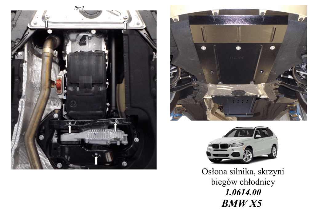 Rys.2 Osłona silnika, skrzyni biegów chłodnicy 1.0614.00 BMW X5 Montaż osłony Osłona 1.0614.00 Stosowanie: BMW Kompletność: L.p. X5(F15) 3.0D, 3.5i , A, 2015- Nazwa Oznaczenie Liczba Uwagi 1 Płyta 1.0614.00.6.003.686 1 2 Płyta Belka Śruba Śruba Śruba Śruba Śruba Podkładka Podkładka Podkładka Listwa Listwa Listwa Grower Grower Nakrętka Amortyzator 30 1.0614.00.6.003.687 1 1.0614.00.6.004.318 6х18 8х25 8х35 10х25 10х35 А6 А8 А10 СТП.8.006.022 СТП.8.006.024 СТП.6.006.016СБ. 8 10 Nitowana М8 1 4 5 3 2 3 4 8 9 2 2 2 8 3 3 3 3 4 6 7 8 9 10 11 12 13 14 15 16 17 18 19 Schemat montażu osłony. 1 Rys.1 2 9 12 15 17 8 12 15 17 6 11 12 13 16 4 10 7 11 16 18 6 11 16 18 1. Zdemontować obecną osłonę plastikową. 2. Wprowadzić listwy 13,14, do otworów ramy podsilnikowej i włożyć śruby 6,8 rys.1. 3. Zmontować belkę 3 do listwy 15 śrubami 9. 4. Rozwiercić otwory w belce skrzyni biegów do F11, i rozklepać w nich nakrętki nitowane 18. 5. Zmontować płytę 2. 6. Zmontować obecną osłonę plastikową chłodnicy, za pomocy otwornicy koronkowej wywiercić otwory pod belką 2.. 7. Zmontować płytę 1. 8. Dokręcić wszystkie miejsca mocowania.
