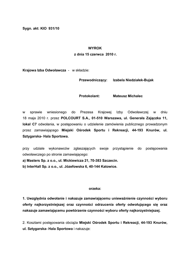 Sygn. akt: KIO 931/10 WYROK z dnia 15 czerwca 2010 r. Krajowa Izba Odwoławcza - w składzie: w sprawie wniesionego do Przewodniczący: Izabela Niedziałek-Bujak Protokolant: Mateusz Michalec Prezesa Krajowej Izby Odwoławczej w dniu 18 maja 2010 r. przez POLCOURT S.A., 01-510 Warszawa, ul. Generała Zajączka 11, lokal C7 odwołania, w postępowaniu o udzielenie zamówienia publicznego prowadzonym przez zamawiającego Miejski Ośrodek Sportu i Rekreacji, 44-193 Knurów, ul. Sztygarska- Hala Sportowa. przy udziale wykonawców zgłaszających swoje przystąpienie do postępowania odwoławczego po stronie zamawiającego: a) Masters Sp. z o.o., ul. Mickiewicza 21, 70-383 Szczecin. b) InterHall Sp. z o.o., ul. Józefowska 6, 40-144 Katowice. orzeka: 1. Uwzględnia odwołanie i nakazuje zamawiającemu uniewaŜnienie czynności wyboru oferty najkorzystniejszej oraz czynności odrzucenia oferty odwołującego się oraz nakazuje zamawiającemu powtórzenie czynności wyboru oferty najkorzystniejszej. 2. Kosztami postępowania obciąŜa Miejski Ośrodek Sportu i Rekreacji, 44-193 Knurów, ul. Sztygarska- Hala Sportowa i nakazuje: 1) zaliczyć na rzecz Urzędu Zamówień Publicznych wpis w wysokości 10.000 zł 00 gr (słownie: dziesięć tysięcy złotych, zero groszy) uiszczony przez POLCOURT S.A., 01-510 Warszawa, ul. Generała Zajączka 11, lokal C7, tytułem kosztów postępowania odwoławczego, 2) zasądza od Miejskiego Ośrodka Sportu i Rekreacji, 44-193 Knurów, ul. Sztygarska- Hala Sportowa na rzecz POLCOURT S.A., 01-510 Warszawa, ul. Generała Zajączka 11, lokal C7 kwotę 13.600 zł 00 gr (słownie trzynaście tysięcy sześćset złotych, zero groszy) stanowiącej koszty strony poniesione z tytułu wpisu od odwołania oraz wynagrodzenia pełnomocnika. 3. Stosownie do art. 194 i 195 ustawy z dnia 29 stycznia 2004 r. - Prawo zamówień publicznych (Dz. U. z 2007 r. Nr 223, poz. 1655 ze zm.) na niniejszy wyrok - w terminie 7 dni od dnia jego doręczenia - przysługuje skarga za pośrednictwem Prezesa Krajowej Izby Odwoławczej do Sądu Okręgowego w Gliwicach. Przewodniczący: ……………………………… 2 Sygn. akt: KIO 931/10 Uzasadnienie W postępowaniu prowadzonym przez zamawiającego – Miejski Ośrodek Sportu i Rekreacji w Knurowie w trybie przetargu nieograniczonego na wykonanie inwestycji „Budowa boiska piłkarskiego przy MSP nr 9 i MG nr 3 w Knurowie”, ogłoszonym w Biuletynie Zamówień Publicznych w dniu 1 kwietnia 2010 r., poz. 74435-2010, wobec czynności odrzucenia oferty złoŜonej przez Polcourt S.A., wykonawca ten w dniu 18 maja 2010 r. wniósł odwołanie do Prezesa Krajowej Izby Odwoławczej. Kopia odwołania została przekazana zamawiającemu w dniu 18 maja 2010 r. O czynności zamawiającego odwołujący został powiadomiony w dniu 13 maja 2010 r. na podstawie informacji o wyborze oferty najkorzystniejszej złoŜonej przez InterHall Sp. z o.o. oraz o odrzuceniu oferty odwołującego się na podstawie art. 89 ust. 1 pkt 2 ustawy PrZamPubl. W odwołaniu odwołujący wskazał na naruszenie przez zamawiającego przepisów art. 7 ust. 1 i 3, art. 89 ust. 1 pkt 2 ustawy PrZamPubl, do których miało dojść na skutek bezprawnego odrzucenia oferty odwołującego się. Odwołujący swój interes we wniesieniu odwołania uzasadniał moŜliwością uzyskania przedmiotowego zamówienia, gdyŜ jego oferta z najniŜszą ceną i spełniająca wszystkie wymagania zamawiającego ma szansę być uznaną za najkorzystniejszą, natomiast w wyniku bezprawnej decyzji zamawiającego odwołujący poniósł szkodę, gdyŜ został pozbawiony moŜliwości realizacji zamówienia publicznego. Odwołujący wskazała, iŜ zaoferowana przez niego nawierzchnia z trawy syntetycznej jest produktem równowaŜnym pod względem określonych przez zamawiającego w dokumentacji projektowej parametrów. Na okoliczność spełniania parametrów wymaganych, odwołujący powołał się na opinię techniczną opracowaną przez rzeczoznawcę budowlanego, z której wynikać ma, Ŝe zaoferowana trawa syntetyczna nadaje się do wbudowania w ramach zamówienia publicznego na budowę boiska piłkarskiego w Knurowie oraz spełnia wszystkie wymagania określone w erracie do projektu budowlanego, poniewaŜ parametry techniczne mieszczą się w zakresie rozbieŜności przewidzianej przez FIFA. Zamawiający bezpodstawnie nie uwzględnił wyjaśnień, iŜ zgodnie z normami FIFA róŜnica między parametrami w laboratorium, a deklaracjami producenta wynosi ± 10%. Zaoferowana przez odwołującego sztuczna trawa SoccerPro Max S 60 moŜe charakteryzować się parametrami zgodnymi z wymaganiami zamawiającego i taka właśnie trawa zostanie wyprodukowana, co potwierdzać ma załączone do odwołania oświadczenie producenta oferowanej nawierzchni. Wykonawca odwołał się do definicji pojęcia „równowaŜny” wskazującego na mający równą 3 wartość, równe znaczenie z czymś i nie oznacza toŜsamości produktów. Dopuszczenie w siwz rozwiązania równowaŜnego nie moŜe oznaczać, Ŝe inne zaproponowane w ramach tej równowaŜności urządzenie ma spełniać wszystkie parametry konkretnego urządzenia, co przeczyłoby istocie przyjętej w Prawie Zamówień Publicznych regulacji i naruszałoby zasadę uczciwej konkurencji i równego traktowania wykonawców. Odwołujący uznał, iŜ obowiązkiem zamawiającego było prowadzenie postępowania wyjaśniającego w taki sposób, aby był w stanie bez Ŝadnych wątpliwości stwierdzić i prawidłowo ocenić złoŜone dokumenty bez szkody dla wykonawcy. Odwołujący wskazał na charakter techniczny i funkcjonalny zaoferowanej nawierzchni, nie odbiegający od opisanej przez zamawiającego nawierzchni, jak równieŜ wskazał uzyskany certyfikat FIFA 2 gwiazdki, oznaczający, Ŝe FIFA dopuściła do stosowania na boiskach zaoferowaną nawierzchnię. Wskazane powyŜej okoliczności wskazywać mają na brak podstaw do odrzucenia oferty firmy Polcourt S.A z uwagi na nie