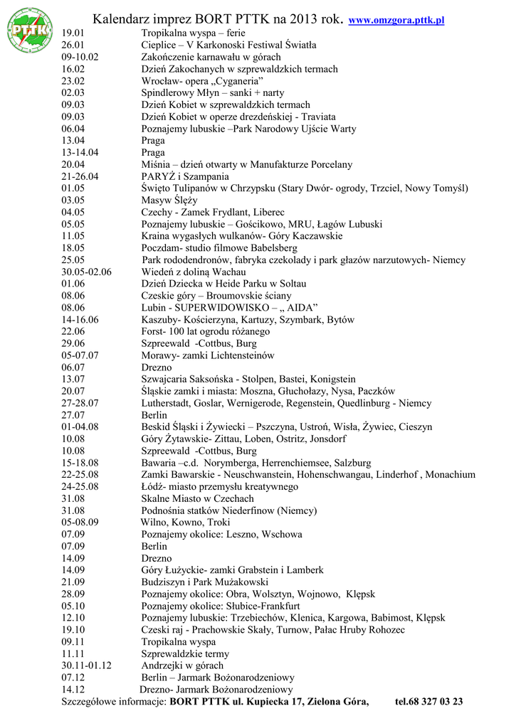 Kalendarz imprez BORT PTTK na 2013 rok. www.omzgora.pttk.pl 19.01 Tropikalna wyspa – ferie 26.01 Cieplice – V Karkonoski Festiwal Światła 09-10.02 Zakończenie karnawału w górach 16.02 Dzień Zakochanych w szprewaldzkich termach 23.02 Wrocław- opera „Cyganeria” 02.03 Spindlerowy Młyn – sanki + narty 09.03 Dzień Kobiet w szprewaldzkich termach 09.03 Dzień Kobiet w operze drezdeńskiej - Traviata 06.04 Poznajemy lubuskie –Park Narodowy Ujście Warty 13.04 Praga 13-14.04 Praga 20.04 Miśnia – dzień otwarty w Manufakturze Porcelany 21-26.04 PARYŻ i Szampania 01.05 Święto Tulipanów w Chrzypsku (Stary Dwór- ogrody, Trzciel, Nowy Tomyśl) 03.05 Masyw Ślęży 04.05 Czechy - Zamek Frydlant, Liberec 05.05 Poznajemy lubuskie – Gościkowo, MRU, Łagów Lubuski 11.05 Kraina wygasłych wulkanów- Góry Kaczawskie 18.05 Poczdam- studio filmowe Babelsberg 25.05 Park rododendronów, fabryka czekolady i park głazów narzutowych- Niemcy 30.05-02.06 Wiedeń z doliną Wachau 01.06 Dzień Dziecka w Heide Parku w Soltau 08.06 Czeskie góry – Broumovskie ściany 08.06 Lubin - SUPERWIDOWISKO – „ AIDA” 14-16.06 Kaszuby- Kościerzyna, Kartuzy, Szymbark, Bytów 22.06 Forst- 100 lat ogrodu różanego 29.06 Szpreewald -Cottbus, Burg 05-07.07 Morawy- zamki Lichtensteinów 06.07 Drezno 13.07 Szwajcaria Saksońska - Stolpen, Bastei, Konigstein 20.07 Śląskie zamki i miasta: Moszna, Głuchołazy, Nysa, Paczków 27-28.07 Lutherstadt, Goslar, Wernigerode, Regenstein, Quedlinburg - Niemcy 27.07 Berlin 01-04.08 Beskid Śląski i Żywiecki – Pszczyna, Ustroń, Wisła, Żywiec, Cieszyn 10.08 Góry Żytawskie- Zittau, Loben, Ostritz, Jonsdorf 10.08 Szpreewald -Cottbus, Burg 15-18.08 Bawaria –c.d. Norymberga, Herrenchiemsee, Salzburg 22-25.08 Zamki Bawarskie - Neuschwanstein, Hohenschwangau, Linderhof , Monachium 24-25.08 Łódź- miasto przemysłu kreatywnego 31.08 Skalne Miasto w Czechach 31.08 Podnośnia statków Niederfinow (Niemcy) 05-08.09 Wilno, Kowno, Troki 07.09 Poznajemy okolice: Leszno, Wschowa 07.09 Berlin 14.09 Drezno 14.09 Góry Łużyckie- zamki Grabstein i Lamberk 21.09 Budziszyn i Park Mużakowski 28.09 Poznajemy okolice: Obra, Wolsztyn, Wojnowo, Klępsk 05.10 Poznajemy okolice: Słubice-Frankfurt 12.10 Poznajemy lubuskie: Trzebiechów, Klenica, Kargowa, Babimost, Klępsk 19.10 Czeski raj - Prachowskie Skały, Turnow, Pałac Hruby Rohozec 09.11 Tropikalna wyspa 11.11 Szprewaldzkie termy 30.11-01.12 Andrzejki w górach 07.12 Berlin – Jarmark Bożonarodzeniowy 14.12 Drezno- Jarmark Bożonarodzeniowy Szczegółowe informacje: BORT PTTK ul. Kupiecka 17, Zielona Góra, tel.68 327 03 23