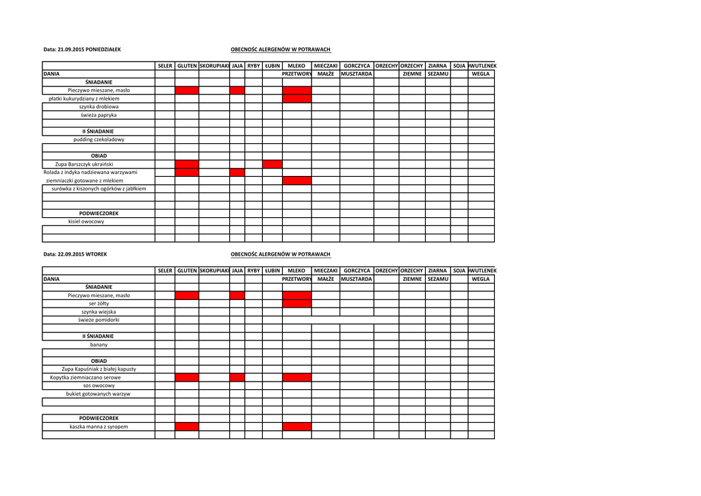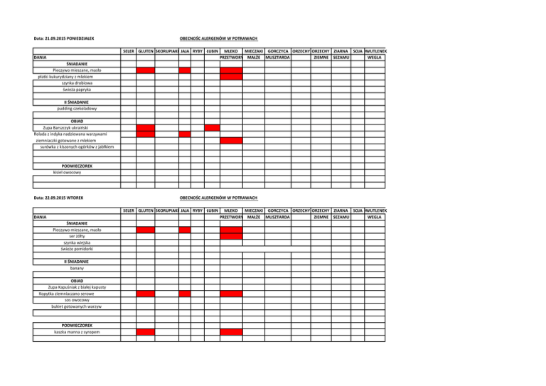 Data: 21.09.2015 PONIEDZIAŁEK OBECNOŚC ALERGENÓW W POTRAWACH SELER GLUTEN SKORUPIAKI JAJA RYBY ŁUBIN DANIA MLEKO MIECZAKI GORCZYCA ORZECHY ORZECHY ZIARNA SOJA DWUTLENEK PRZETWORY MAŁŻE MUSZTARDA ZIEMNE SEZAMU WEGLA ŚNIADANIE Pieczywo mieszane, masło płatki kukurydziany z mlekiem szynka drobiowa świeża papryka II ŚNIADANIE pudding czekoladowy OBIAD Zupa Barszczyk ukraiński Rolada z indyka nadziewana warzywami ziemniaczki gotowane z mlekiem surówka z kiszonych ogórków z jabłkiem PODWIECZOREK kisiel owocowy Data: 22.09.2015 WTOREK OBECNOŚC ALERGENÓW W POTRAWACH SELER GLUTEN SKORUPIAKI JAJA RYBY ŁUBIN DANIA ŚNIADANIE Pieczywo mieszane, masło ser żółty szynka wiejska świeże pomidorki II ŚNIADANIE banany OBIAD Zupa Kapuśniak z białej kapusty Kopytka ziemniaczano serowe sos owocowy bukiet gotowanych warzyw PODWIECZOREK kaszka manna z syropem MLEKO MIECZAKI GORCZYCA ORZECHY ORZECHY ZIARNA SOJA DWUTLENEK PRZETWORY MAŁŻE MUSZTARDA ZIEMNE SEZAMU WEGLA Data: 23.09.2015 ŚRODA OBECNOŚC ALERGENÓW W POTRAWACH SELER GLUTEN SKORUPIAKI JAJA RYBY ŁUBIN DANIA ŚNIADANIE Pieczywo mieszane i masło serek waniliowy szynka wieprzowa rzodkiewki MLEKO MIECZAKI GORCZYCA ORZECHY ORZECHY ZIARNA SOJA DWUTLENEK PRZETWORY MAŁŻE MUSZTARDA ZIEMNE SEZAMU WEGLA II ŚNIADANIE arbuz OBIAD Zupa Rosół z makaronem Udziec z kurczaka ziemniaczki gotowane z mlekiem surówka z białej kapusty z pestkami dyni PODWIECZOREK bułka melczna Data: 24.09.2015 CZWARTEK OBECNOŚC ALERGENÓW W POTRAWACH SELER GLUTEN SKORUPIAKI JAJA RYBY ŁUBIN DANIA ŚNIADANIE Pieczywo mieszane, masło serek biały parówki z ketchupem ogorek zielony II ŚNIADANIE jogurt owocowy OBIAD Zupa krem koperkowy z grzankami Gulasz z szynki wp. jasny sos pieczeniowy pyzy drożdżowe surówka z kapusty pekińskiej PODWIECZOREK sałatka owocowa MLEKO MIECZAKI GORCZYCA ORZECHY ORZECHY ZIARNA SOJA DWUTLENEK PRZETWORY MAŁŻE MUSZTARDA ZIEMNE SEZAMU WEGLA Data: 25.09.2015 PIĄTEK OBECNOŚC ALERGENÓW W POTRAWACH SELER GLUTEN SKORUPIAKI JAJA RYBY ŁUBIN DANIA ŚNIADANIE Pieczywo mieszane, masło pasta z tuńczyka dżem truskawkowy świeże pomidory II ŚNIADANIE jabłka OBIAD Zupa Krupnik z kaszą Kotleciki jajeczne z warzywami ziemniaczki gotowane z mlekiem surówka z marchewki PODWIECZOREK ciasteczka owsiane MLEKO MIECZAKI GORCZYCA ORZECHY ORZECHY ZIARNA SOJA DWUTLENEK PRZETWORY MAŁŻE MUSZTARDA ZIEMNE SEZAMU WEGLA