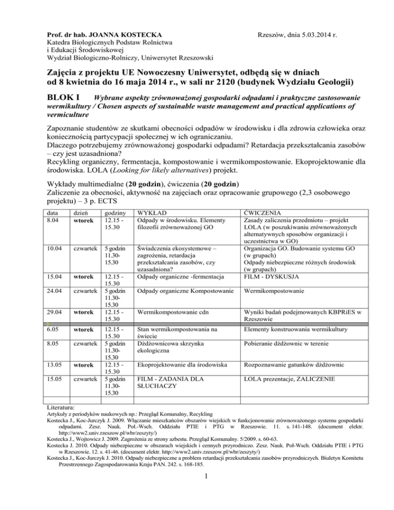 Prof. dr hab. JOANNA KOSTECKA Katedra Biologicznych Podstaw Rolnictwa i Edukacji Środowiskowej Wydział Biologiczno-Rolniczy, Uniwersytet Rzeszowski Rzeszów, dnia 5.03.2014 r. Zajęcia z projektu UE Nowoczesny Uniwersytet, odbędą się w dniach od 8 kwietnia do 16 maja 2014 r., w sali nr 2120 (budynek Wydziału Geologii) Wybrane aspekty zrównoważonej gospodarki odpadami i praktyczne zastosowanie wermikultury / Chosen aspects of sustainable waste management and practical applications of vermiculture BLOK I Zapoznanie studentów ze skutkami obecności odpadów w środowisku i dla zdrowia człowieka oraz koniecznością partycypacji społecznej w ich ograniczaniu. Dlaczego potrzebujemy zrównoważonej gospodarki odpadami? Retardacja przekształcania zasobów – czy jest uzasadniona? Recykling organiczny, fermentacja, kompostowanie i wermikompostowanie. Ekoprojektowanie dla środowiska. LOLA (Looking for likely alternatives) projekt. Wykłady multimedialne (20 godzin), ćwiczenia (20 godzin) Zaliczenie za obecności, aktywność na zajęciach oraz opracowanie grupowego (2,3 osobowego projektu) – 3 p. ECTS data 8.04 dzień wtorek godziny 12.15 15.30 WYKŁAD Odpady w środowisku. Elementy filozofii zrównoważonej GO 10.04 czwartek 5 godzin 11.3015.30 15.04 wtorek 24.04 czwartek Odpady organiczne Kompostowanie Wermikompostowanie 29.04 wtorek 12.15 15.30 5 godzin 11.3015.30 12.15 15.30 Świadczenia ekosystemowe – zagrożenia, retardacja przekształcania zasobów, czy uzasadniona? Odpady organiczne -fermentacja ĆWICZENIA Zasady zaliczenia przedmiotu – projekt LOLA (w poszukiwaniu zrównoważonych alternatywnych sposobów organizacji i uczestnictwa w GO) Organizacja GO. Budowanie systemu GO (w grupach) Odpady niebezpieczne różnych środowisk (w grupach) FILM - DYSKUSJA Wermikompostowanie cdn Wyniki badań podejmowanych KBPRiES w Rzeszowie Stan wermikompostowania na świecie Dżdżownicowa skrzynka ekologiczna Elementy konstruowania wermikultury Ekoprojektowanie dla środowiska Rozpoznawanie gatunków dżdżownic FILM - ZADANIA DLA SŁUCHACZY LOLA prezentacje, ZALICZENIE x 6.05 wtorek 8.05 czwartek 13.05 wtorek 15.05 czwartek 12.15 15.30 5 godzin 11.3015.30 12.15 15.30 5 godzin 11.3015.30 Pobieranie dżdżownic w terenie Literatura: Artykuły z periodyków naukowych np.: Przegląd Komunalny, Recykling Kostecka J., Koc-Jurczyk J. 2009. Włączanie mieszkańców obszarów wiejskich w funkcjonowanie zrównoważonego systemu gospodarki odpadami. Zesz. Nauk. Poł.-Wsch. Oddziału PTIE i PTG w Rzeszowie. 11. s. 141-148. (document elektr. http://www2.univ.rzeszow.pl/wbr/zeszyty/) Kostecka J., Wojtowicz J. 2009. Zagrożenia ze strony azbestu. Przegląd Komunalny. 5/2009. s. 60-63. Kostecka J. 2010. Odpady niebezpieczne w obszarach wiejskich i cennych przyrodniczo. Zesz. Nauk. Poł-Wsch. Oddziału PTIE i PTG w Rzeszowie. 12. s. 41-46. (document elektr. http://www2.univ.rzeszow.pl/wbr/zeszyty/) Kostecka J., Koc-Jurczyk J. 2010. Odpady niebezpieczne a problem retardacji przekształcania zasobów przyrodniczych. Biuletyn Komitetu Przestrzennego Zagospodarowania Kraju PAN. 242. s. 168-185. 1 Kostecka J. 2011. Partycypacja społeczna i segregacja odpadów niebezpiecznych a świadczenia ekosystemów. Ekonomia i Środowisko. 1(39). 195-207. (dok. elektroniczny: http://www.fe.org.pl/uploads/ngrey/eis39.pdf) Kostecka J., Dunin-Mugler C. 2011. Partycypacja społeczna a segregacja odpadów organicznych. Inżynieria ekologiczna. 27. s. 81-91. BLOK II Ekofilozofia i zrównoważony rozwój / Ecophylosophy and sustainable development Zaprezentowanie studentom wybranych elementów spuścizny po filozofach przyrody i zagadnień z zakresu filozofii ochrony środowiska, uzasadnienie dla wdrażania zrównoważonego rozwoju. Nabycie umiejętności korzystania z zasady wariantowania decyzji i zrównoważonych wyborów w rozwiązywaniu problemów organizacji życia codziennego i działań publicznych. Konsument – obywatel. Retardacja przekształcania zasobów, filozofia slow. Dekada edukacji dla zrównoważonego rozwoju, Dekada różnorodności biologicznej. Świadczenia ekosystemowe. Atrybuty zrównoważonego rozwoju - metodą aktywizującą. Współczesne trendy przemian społeczno-gospodarczych. Ekoiści – burza mózgów. Finansowanie ZR – przypadek szkoły w Węgrach. Zasady studium przypadku. Wspólne przygotowanie projektów. Wykłady multimedialne (15 godzin), ćwiczenia metodami aktywnymi (15 godzin) Zaliczenie za obecności, aktywność na zajęciach oraz opracowanie grupowego (2,3 osobowego projektu case study) – 2 p. ECTS. data 11.04 dzień piatek godziny 10.0013.30 10.0013.30 10.0013.30 WYKŁAD Wybrane elementy spuścizny po filozofach przyrody Film Stiva Cuttsa MAN Dlaczego potrzebujemy ZR (1) Dlaczego potrzebujemy ZR (2) Retardacja przekształceń zasobów 14.04 poniedziałek 25.04 piatek 28.04 ĆWICZENIA Kij w mrowisko poniedziałek 10.0013.30 Aspekty społeczne ZR Film The end of the line 5.05 poniedziałek 10.0013.30 Metody aktywizujące- znaczenie dla ZR Studium przypadku, rzeźnia 12.05 poniedziałek 16.05 piątek 10.0013.30 10.0013.30 Prośrodowiskowa organizacja przedsiębiorstw Nowe trendy –trumna z papieru? Ekonomiczne aspekty ZR (metodą aktywizującą) Prezentacja projektów , ZALICZENIE Atrybuty zrównoważonego rozwoju (metodą aktywizującą) Współczesne trendy przemian społeczno-gospodarczych (Ekoiścimetodą aktywizującą) Współczesne trendy przemian społeczno-gospodarczych (Gmina w gorącej wodzie kąpana- metodą aktywizującą) Literatura: 1. Henryk Skolimowski. Dzieło dowolne 2. Włodzimierz H. Zylbertal. Miejscem człowieka jest ziemia. Wykłady z ekofilozofii. (wersja online: zb.eco.pl/bzb/35/dzieki.htm) Literatura uzupełniająca: 1. Rozenbajger N., Kostecka J. 2012. Edukacja dla zrównoważonego rozwoju - program WARTA („wiedzieć aby rozumnie działać – twoim atutem”). Zesz. Nauk. Poł.-Wsch. Oddziału PTIE i PTG w Rzeszowie. Z. 15. 81-88. (document e