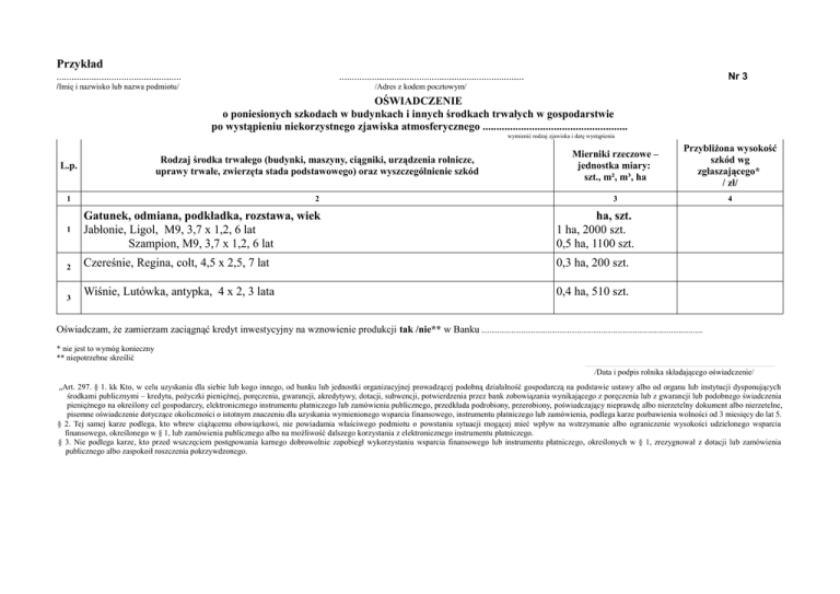 Przykład .................................................. Nr 3 .......................................................................... /Imię i nazwisko lub nazwa podmiotu/ /Adres z kodem pocztowym/ OŚWIADCZENIE o poniesionych szkodach w budynkach i innych środkach trwałych w gospodarstwie po wystąpieniu niekorzystnego zjawiska atmosferycznego ..................................................... wymienić rodzaj zjawiska i datę wystąpienia L.p. Rodzaj środka trwałego (budynki, maszyny, ciągniki, urządzenia rolnicze, uprawy trwałe, zwierzęta stada podstawowego) oraz wyszczególnienie szkód Mierniki rzeczowe – jednostka miary: szt., m², m³, ha Przybliżona wysokość szkód wg zgłaszającego* / zł/ 1 2 3 4 1 Gatunek, odmiana, podkładka, rozstawa, wiek Jabłonie, Ligol, M9, 3,7 x 1,2, 6 lat Szampion, M9, 3,7 x 1,2, 6 lat ha, szt. 1 ha, 2000 szt. 0,5 ha, 1100 szt. Czereśnie, Regina, colt, 4,5 x 2,5, 7 lat 0,3 ha, 200 szt. Wiśnie, Lutówka, antypka, 4 x 2, 3 lata 0,4 ha, 510 szt. 2 3 Oświadczam, że zamierzam zaciągnąć kredyt inwestycyjny na wznowienie produkcji tak /nie** w Banku ............................................................................................................... * nie jest to wymóg konieczny ** niepotrzebne skreślić ............................................................................................................................................................................................................................................................... /Data i podpis rolnika składającego oświadczenie/ „Art. 297. § 1. kk Kto, w celu uzyskania dla siebie lub kogo innego, od banku lub jednostki organizacyjnej prowadzącej podobną działalność gospodarczą na podstawie ustawy albo od organu lub instytucji dysponujących środkami publicznymi – kredytu, pożyczki pieniężnej, poręczenia, gwarancji, akredytywy, dotacji, subwencji, potwierdzenia przez bank zobowiązania wynikającego z poręczenia lub z gwarancji lub podobnego świadczenia pieniężnego na określony cel gospodarczy, elektronicznego instrumentu płatniczego lub zamówienia publicznego, przedkłada podrobiony, przerobiony, poświadczający nieprawdę albo nierzetelny dokument albo nierzetelne, pisemne oświadczenie dotyczące okoliczności o istotnym znaczeniu dla uzyskania wymienionego wsparcia finansowego, instrumentu płatniczego lub zamówienia, podlega karze pozbawienia wolności od 3 miesięcy do lat 5. § 2. Tej samej karze podlega, kto wbrew ciążącemu obowiązkowi, nie powiadamia właściwego podmiotu o powstaniu sytuacji mogącej mieć wpływ na wstrzymanie albo ograniczenie wysokości udzielonego wsparcia finansowego, określonego w § 1, lub zamówienia publicznego albo na możliwość dalszego korzystania z elektronicznego instrumentu płatniczego. § 3. Nie podlega karze, kto przed wszczęciem postępowania karnego dobrowolnie zapobiegł wykorzystaniu wsparcia finansowego lub instrumentu płatniczego, określonych w § 1, zrezygnował z dotacji lub zamówienia publicznego albo zaspokoił roszczenia pokrzywdzonego.