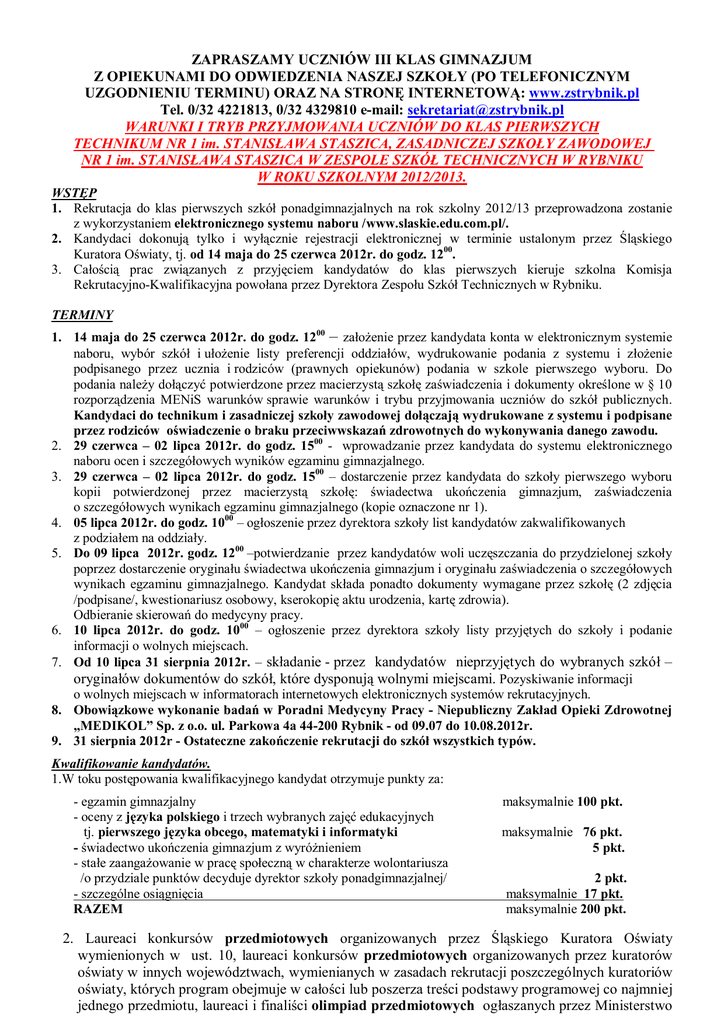ZAPRASZAMY UCZNIÓW III KLAS GIMNAZJUM Z OPIEKUNAMI DO ODWIEDZENIA NASZEJ SZKOŁY (PO TELEFONICZNYM UZGODNIENIU TERMINU) ORAZ NA STRONĘ INTERNETOWĄ: www.zstrybnik.pl Tel. 0/32 4221813, 0/32 4329810 e-mail: [email protected] WARUNKI I TRYB PRZYJMOWANIA UCZNIÓW DO KLAS PIERWSZYCH TECHNIKUM NR 1 im. STANISŁAWA STASZICA, ZASADNICZEJ SZKOŁY ZAWODOWEJ NR 1 im. STANISŁAWA STASZICA W ZESPOLE SZKÓŁ TECHNICZNYCH W RYBNIKU W ROKU SZKOLNYM 2012/2013. WSTĘP 1. Rekrutacja do klas pierwszych szkół ponadgimnazjalnych na rok szkolny 2012/13 przeprowadzona zostanie z wykorzystaniem elektronicznego systemu naboru /www.slaskie.edu.com.pl/. 2. Kandydaci dokonują tylko i wyłącznie rejestracji elektronicznej w terminie ustalonym przez Śląskiego Kuratora Oświaty, tj. od 14 maja do 25 czerwca 2012r. do godz. 1200. 3. Całością prac związanych z przyjęciem kandydatów do klas pierwszych kieruje szkolna Komisja Rekrutacyjno-Kwalifikacyjna powołana przez Dyrektora Zespołu Szkół Technicznych w Rybniku. TERMINY 1. 14 maja do 25 czerwca 2012r. do godz. 1200 – założenie przez kandydata konta w elektronicznym systemie naboru, wybór szkół i ułożenie listy preferencji oddziałów, wydrukowanie podania z systemu i złożenie podpisanego przez ucznia i rodziców (prawnych opiekunów) podania w szkole pierwszego wyboru. Do podania należy dołączyć potwierdzone przez macierzystą szkołę zaświadczenia i dokumenty określone w § 10 rozporządzenia MENiS warunków sprawie warunków i trybu przyjmowania uczniów do szkół publicznych. Kandydaci do technikum i zasadniczej szkoły zawodowej dołączają wydrukowane z systemu i podpisane przez rodziców oświadczenie o braku przeciwwskazań zdrowotnych do wykonywania danego zawodu. 2. 29 czerwca – 02 lipca 2012r. do godz. 1500 - wprowadzanie przez kandydata do systemu elektronicznego naboru ocen i szczegółowych wyników egzaminu gimnazjalnego. 3. 29 czerwca – 02 lipca 2012r. do godz. 1500 – dostarczenie przez kandydata do szkoły pierwszego wyboru kopii potwierdzonej przez macierzystą szkołę: świadectwa ukończenia gimnazjum, zaświadczenia o szczegółowych wynikach egzaminu gimnazjalnego (kopie oznaczone nr 1). 4. 05 lipca 2012r. do godz. 1000 – ogłoszenie przez dyrektora szkoły list kandydatów zakwalifikowanych z podziałem na oddziały. 5. Do 09 lipca 2012r. godz. 1200 –potwierdzanie przez kandydatów woli uczęszczania do przydzielonej szkoły poprzez dostarczenie oryginału świadectwa ukończenia gimnazjum i oryginału zaświadczenia o szczegółowych wynikach egzaminu gimnazjalnego. Kandydat składa ponadto dokumenty wymagane przez szkołę (2 zdjęcia /podpisane/, kwestionariusz osobowy, kserokopię aktu urodzenia, kartę zdrowia). Odbieranie skierowań do medycyny pracy. 6. 10 lipca 2012r. do godz. 1000 – ogłoszenie przez dyrektora szkoły listy przyjętych do szkoły i podanie informacji o wolnych miejscach. 7. Od 10 lipca 31 sierpnia 2012r. – składanie - przez kandydatów nieprzyjętych do wybranych szkół – oryginałów dokumentów do szkół, które dysponują wolnymi miejscami. Pozyskiwanie informacji o wolnych miejscach w informatorach internetowych elektronicznych systemów rekrutacyjnych. 8. Obowiązkowe wykonanie badań w Poradni Medycyny Pracy - Niepubliczny Zakład Opieki Zdrowotnej „MEDIKOL” Sp. z o.o. ul. Parkowa 4a 44-200 Rybnik - od 09.07 do 10.08.2012r. 9. 31 sierpnia 2012r - Ostateczne zakończenie rekrutacji do szkół wszystkich typów. Kwalifikowanie kandydatów. 1.W toku postępowania kwalifikacyjnego kandydat otrzymuje punkty za: - egzamin gimnazjalny - oceny z języka polskiego i trzech wybranych zajęć edukacyjnych tj. pierwszego języka obcego, matematyki i informatyki - świadectwo ukończenia gimnazjum z wyróżnieniem - stałe zaangażowanie w pracę społeczną w charakterze wolontariusza /o przydziale punktów decyduje dyrektor szkoły ponadgimnazjalnej/ - szczególne osiągnięcia RAZEM maksymalnie 100 pkt. maksymalnie 76 pkt. 5 pkt. 2 pkt. maksymalnie 17 pkt. maksymalnie 200 pkt. 2. Laureaci konkursów przedmiotowych organizowanych przez Śląskiego Kuratora Oświaty wymienionych w ust. 10, laureaci konkursów przedmiotowych organizowanych przez kuratorów oświaty w innych województwach, wymienianych w zasadach rekrutacji poszczególnych kuratoriów oświaty, których program obejmuje w całości lub poszerza treści podstawy programowej co najmniej jednego przedmiotu, laureaci i finaliści olimpiad przedmiotowych ogłaszanych przez Ministerstwo Edukacji Narodowej, przyjmowani są do wybranej szkoły ponadgimnazjalnej niezależnie od kryteriów podanych w poprzednich punktach. 3. Szczegółowe zasady punktacji: Zagadnienie Punktacja szczegółowa Punktacja maksymalna dopuszczający – 0 punktów dostateczny – 9 punktów Język polski 19 punktów dobry – 13 punktów bardzo dobry –16 punktów celujący – 19 punktów Pierwszy język obcy jak w przypadku języka polskiego 19 punktów Matematyka jak w przypadku języka polskiego 19 punktów Informatyka jak w przypadku języka polskiego 19 punktów Świadectwo ukończenia gimnazjum z wyróżnieniem 5 punktów Uzyskanie tytułu finalisty w wojewódzkim konkursie przedmiotowym organizowanym przez kuratora oświaty: - za jeden tytuł - 10 punktów - za dwa i więcej tytułów – dodatkowo 2 punkty 12 punktów Inne szczególne osiągnięcia - w zawodach wiedzy, artystycznych i sportowych (indywidualne lub zespołowe) lub konkursy inne, co najmniej na szczeblu powiatowym wymienione na świadectwie ukończenia gimnazjum. Kandydat może uzyskać maksymalnie 5 pkt. 5 punktów I miejsce lub tytuł laureata – 5 pkt. II miejsce lub tytuł finalisty – 4 pkt. III miejsce lub wyróżnienie - 3 pkt. Uwaga: W przyznawaniu punktów za szczególne osiągnięcia ucznia- sportowe, artystyczne (indywidualne lub zespołowe) lub konkursy inne, co najmniej na szczeblu powiatowym wymienione na świadectwie ukończenia gimnazjum, prz