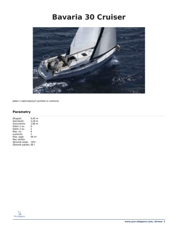 Bavaria 30 Cruiser Jeden z najmniejszych jachtów w czarterze. Parametry Długość: 9,45 m Szerokość: 3,29 m Zanurzenie: 1,85 m Kabin 1 os.: 0 Kabin 2 os.: 2 Max. os.: 6 Łazienek: 1 Pow. żagli: 49 m2 Moc silnika: Zbiornik wody: 150 l Zbiornik paliwa: 90 l www.pro-skippers.com, strona: 1 www.pro-skippers.com, strona: 2