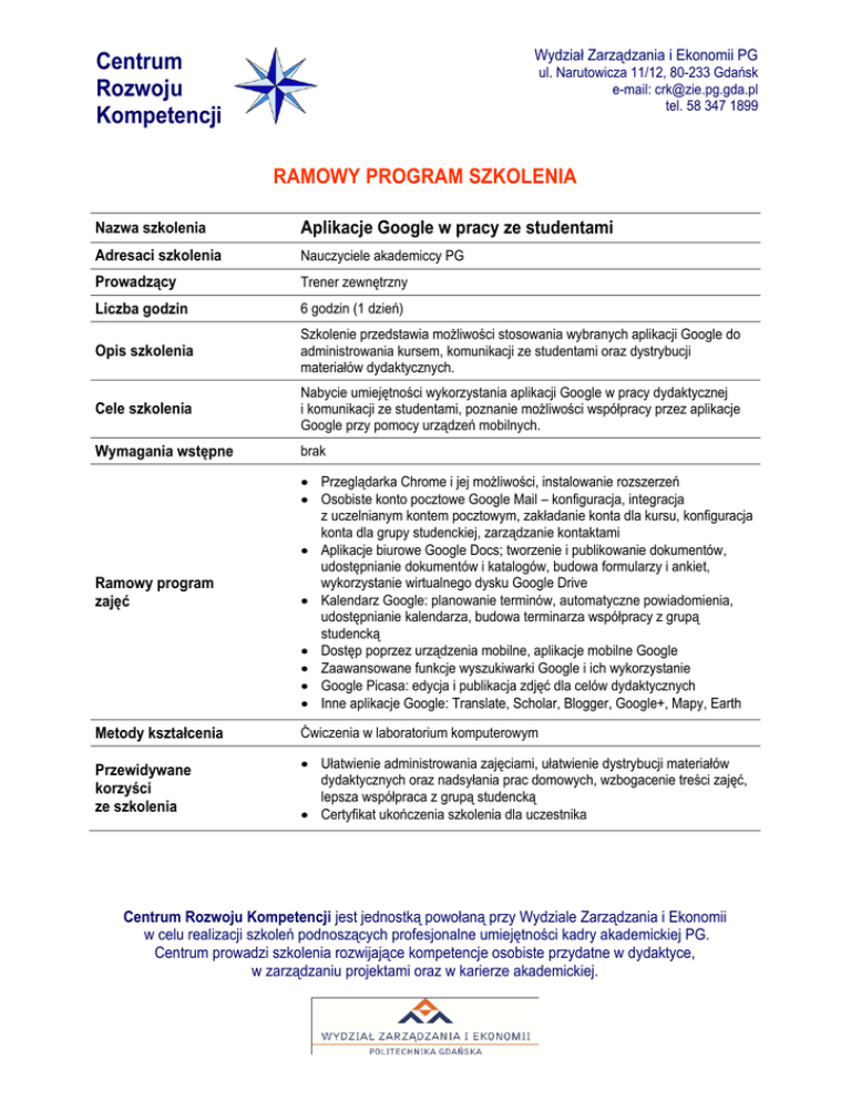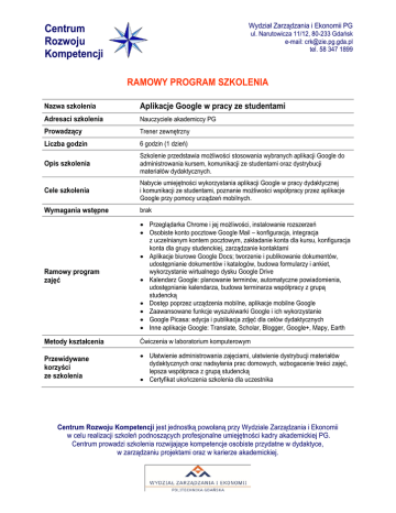 Wydział Zarządzania i Ekonomii PG Centrum Rozwoju Kompetencji ul. Narutowicza 11/12, 80-233 Gdańsk e-mail: [email protected] tel. 58 347 1899 RAMOWY PROGRAM SZKOLENIA Nazwa szkolenia Aplikacje Google w pracy ze studentami Adresaci szkolenia Nauczyciele akademiccy PG Prowadzący Trener zewnętrzny Liczba godzin 6 godzin (1 dzień) Opis szkolenia Szkolenie przedstawia możliwości stosowania wybranych aplikacji Google do administrowania kursem, komunikacji ze studentami oraz dystrybucji materiałów dydaktycznych. Cele szkolenia Nabycie umiejętności wykorzystania aplikacji Google w pracy dydaktycznej i komunikacji ze studentami, poznanie możliwości współpracy przez aplikacje Google przy pomocy urządzeń mobilnych. Wymagania wstępne brak Ramowy program zajęć Przeglądarka Chrome i jej możliwości, instalowanie rozszerzeń Osobiste konto pocztowe Google Mail – konfiguracja, integracja z uczelnianym kontem pocztowym, zakładanie konta dla kursu, konfiguracja konta dla grupy studenckiej, zarządzanie kontaktami Aplikacje biurowe Google Docs; tworzenie i publikowanie dokumentów, udostępnianie dokumentów i katalogów, budowa formularzy i ankiet, wykorzystanie wirtualnego dysku Google Drive Kalendarz Google: planowanie terminów, automatyczne powiadomienia, udostępnianie kalendarza, budowa terminarza współpracy z grupą studencką Dostęp poprzez urządzenia mobilne, aplikacje mobilne Google Zaawansowane funkcje wyszukiwarki Google i ich wykorzystanie Google Picasa: edycja i publikacja zdjęć dla celów dydaktycznych Inne aplikacje Google: Translate, Scholar, Blogger, Google+, Mapy, Earth Metody kształcenia Ćwiczenia w laboratorium komputerowym Przewidywane korzyści ze szkolenia Ułatwienie administrowania zajęciami, ułatwienie dystrybucji materiałów dydaktycznych oraz nadsyłania prac domowych, wzbogacenie treści zajęć, lepsza współpraca z grupą studencką Certyfikat ukończenia szkolenia dla uczestnika Centrum Rozwoju Kompetencji jest jednostką powołaną przy Wydziale Zarządzania i Ekonomii w celu realizacji szkoleń podnoszących profesjonalne umiejętności kadry akademickiej PG. Centrum prowadzi szkolenia rozwijające kompetencje osobiste przydatne w dydaktyce, w zarządzaniu projektami oraz w karierze akademickiej.