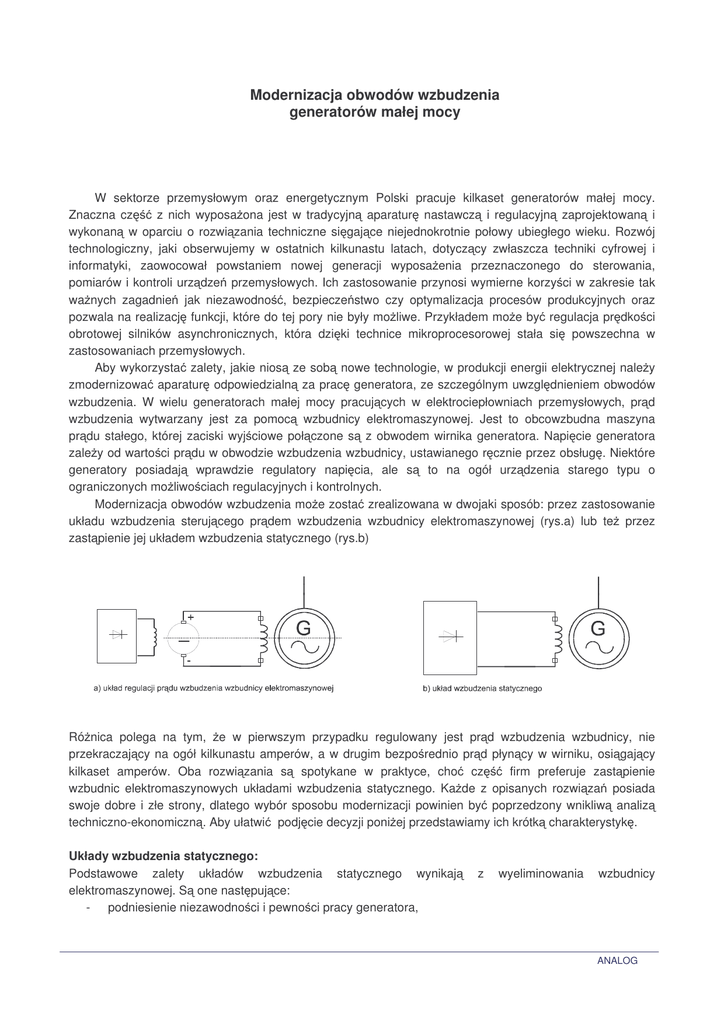 Modernizacja obwodów wzbudzenia generatorów małej mocy W sektorze przemysłowym oraz energetycznym Polski pracuje kilkaset generatorów małej mocy. Znaczna cz z nich wyposa ona jest w tradycyjn aparatur nastawcz i regulacyjn zaprojektowan i wykonan w oparciu o rozwi zania techniczne si gaj ce niejednokrotnie połowy ubiegłego wieku. Rozwój technologiczny, jaki obserwujemy w ostatnich kilkunastu latach, dotycz cy zwłaszcza techniki cyfrowej i informatyki, zaowocował powstaniem nowej generacji wyposa enia przeznaczonego do sterowania, pomiarów i kontroli urz dze przemysłowych. Ich zastosowanie przynosi wymierne korzy ci w zakresie tak wa nych zagadnie jak niezawodno , bezpiecze stwo czy optymalizacja procesów produkcyjnych oraz pozwala na realizacj funkcji, które do tej pory nie były mo liwe. Przykładem mo e by regulacja pr dko ci obrotowej silników asynchronicznych, która dzi ki technice mikroprocesorowej stała si powszechna w zastosowaniach przemysłowych. Aby wykorzysta zalety, jakie nios ze sob nowe technologie, w produkcji energii elektrycznej nale y zmodernizowa aparatur odpowiedzialn za prac generatora, ze szczególnym uwzgl dnieniem obwodów wzbudzenia. W wielu generatorach małej mocy pracuj cych w elektrociepłowniach przemysłowych, pr d wzbudzenia wytwarzany jest za pomoc wzbudnicy elektromaszynowej. Jest to obcowzbudna maszyna pr du stałego, której zaciski wyj ciowe poł czone s z obwodem wirnika generatora. Napi cie generatora zale y od warto ci pr du w obwodzie wzbudzenia wzbudnicy, ustawianego r cznie przez obsług . Niektóre generatory posiadaj wprawdzie regulatory napi cia, ale s to na ogół urz dzenia starego typu o ograniczonych mo liwo ciach regulacyjnych i kontrolnych. Modernizacja obwodów wzbudzenia mo e zosta zrealizowana w dwojaki sposób: przez zastosowanie układu wzbudzenia steruj cego pr dem wzbudzenia wzbudnicy elektromaszynowej (rys.a) lub te przez zast pienie jej układem wzbudzenia statycznego (rys.b) Ró nica polega na tym, e w pierwszym przypadku regulowany jest pr d wzbudzenia wzbudnicy, nie przekraczaj cy na ogół kilkunastu amperów, a w drugim bezpo rednio pr d płyn cy w wirniku, osi gaj cy kilkaset amperów. Oba rozwi zania s spotykane w praktyce, cho cz firm preferuje zast pienie wzbudnic elektromaszynowych układami wzbudzenia statycznego. Ka de z opisanych rozwi za posiada swoje dobre i złe strony, dlatego wybór sposobu modernizacji powinien by poprzedzony wnikliw analiz techniczno-ekonomiczn . Aby ułatwi podj cie decyzji poni ej przedstawiamy ich krótk charakterystyk . Układy wzbudzenia statycznego: Podstawowe zalety układów wzbudzenia statycznego wynikaj elektromaszynowej. S one nast puj ce: - podniesienie niezawodno ci i pewno ci pracy generatora, z wyeliminowania wzbudnicy ANALOG - ograniczenie przegl dów okresowych obwodów wzbudzenia do kontroli izolacji uzwojenia wirnika oraz stanu szczotek i pier cieni, - szybsza reakcja generatora na stany zakłóceniowe zdarzaj ce si w sieci energetycznej. Niezale nie od wymienionych wy ej własno ci, układy wzbudzenia statycznego, wyposa one w cyfrowy regulator napi cia, pozwalaj na optymalne i bezpieczne prowadzenie ruchu generatora, ograniczaj c do minimum prac obsługi. Jednak bezpo rednia regulacja pr du płyn cego przez wirnik, o warto ci kilkuset amperów, wymaga zastosowania transformatora zasilaj cego (lub w wersjach bardziej rozbudowanych dwóch transformatorów: napi ciowego i pr dowego) o znacznej mocy oraz wyposa enia układu wzbudzenia w obwody siłowe zdolne do przeniesienia pr dów o takiej warto ci. To powoduje, e koszt urz dze oraz wykonania instalacji na obiekcie, jest wysoki i waha si w przedziale 160 ÷ 240 tys. zł. Zasilanie obwodu wirnika bezpo rednio z zacisków generatora poprzez przekształtnik tyrystorowy posiada tak e pewne niekorzystne wła ciwo ci. Nale do nich przede wszystkim: - szybki zanik pr du generatora w stanach zwarciowych utrudniaj cy prawidłowe zadziałanie zabezpiecze generatora (dla układów z jednym transformatorem zasilaj cym), - konieczno rozruchu generatora z zewn trznego ródła zasilania, - konieczno odstawienia generatora w przypadku uszkodzenia układu wzbudzenia, - mo liwo pogorszenia stanu izolacji uzwojenia wirnika w wyniku oddziaływania napi cia zasilaj cego o znacznych stromo ciach narastania. Układy wzbudzenia steruj ce pr dem wzbudzenia wzbudnicy elektromaszynowej: Rozwi zanie to zapewnia zachowanie wszystkich zalet jakie posiada wzbudnica elektromaszynowa t.j. utrzymanie dobrych własno ci zwarciowych generatora, mo liwo pracy r cznej w przypadku awarii regulatora, zasilanie obwodu wirnika gładkim napi ciem stałym. Jednocze nie dzi ki zastosowaniu nowoczesnego układu regulacji znacz cej poprawie ulega prowadzenie ruchu generatora, który podobnie jak dla układów wzbudzenia statycznego, praktycznie nie wymaga ingerencji obsługi. Wadami tego rozwi zania jest zwi kszone ryzyko odstawienia generatora z uwagi na znaczn awaryjno wzbudnicy elektromaszynowej, konieczno jej okresowych przegl dów, a tak e wydłu ony czas reakcji na zakłóceniowe zmiany napi cia generatora. Koszt wykonania i instalacji takiego układu nie przekracza na ogół 80.000,- zł. Podsumowuj c, je eli stan techniczny elementów wzbudnicy tj. m.in. stan i grubo komutatora, stan izolacji wirnika i stojana, stan ło ysk jest zadowalaj cy, a tak e nie stanowi problemu okresowe przegl dy i ewentualne przetaczanie komutatora, rozwi zaniem znacznie ta szym i maj cym wystarczaj co dobre parametry techniczne dla wi kszo ci zastosowa , jest układ wzbudzenia steruj cy pr dem wzbudzenia wzbudnicy elektromaszynowej. Natomiast dla jednostek o znacznym stopniu zu ycia elementów wzbudnicy, zwłaszcza gdy zachodzi konieczno ich gruntownego remontu, wła ciwym wydaje si zastosowanie układu wzbudzenia statycznego. Poddajemy zatem pod rozwag wybór sposobu modernizacji obwodów generatora, a w poszukiwaniu optymalnego rozwi zania zapraszamy do współpr