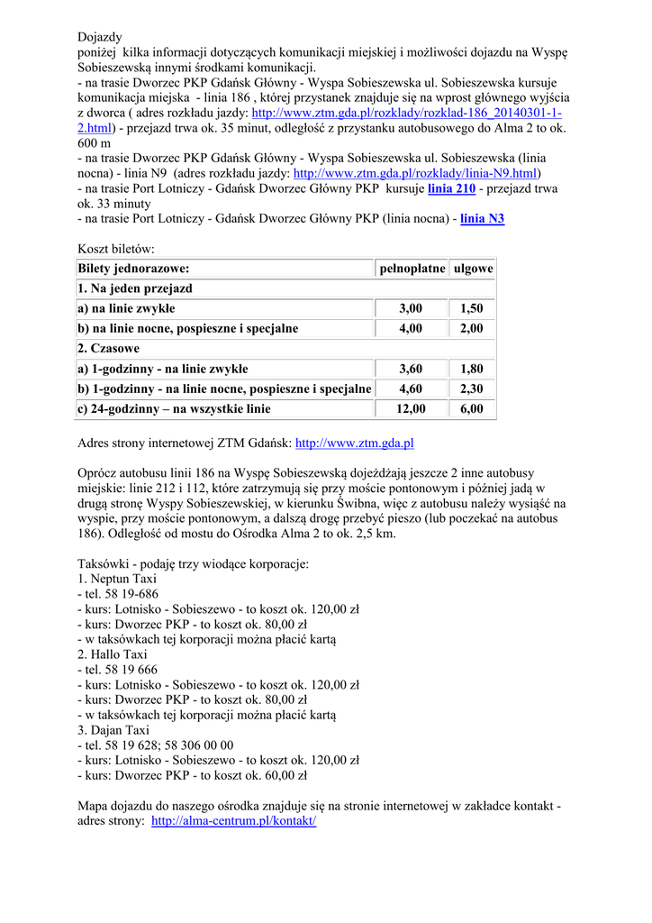 Dojazdy poniżej kilka informacji dotyczących komunikacji miejskiej i możliwości dojazdu na Wyspę Sobieszewską innymi środkami komunikacji. - na trasie Dworzec PKP Gdańsk Główny - Wyspa Sobieszewska ul. Sobieszewska kursuje komunikacja miejska - linia 186 , której przystanek znajduje się na wprost głównego wyjścia z dworca ( adres rozkładu jazdy: http://www.ztm.gda.pl/rozklady/rozklad-186_20140301-12.html) - przejazd trwa ok. 35 minut, odległość z przystanku autobusowego do Alma 2 to ok. 600 m - na trasie Dworzec PKP Gdańsk Główny - Wyspa Sobieszewska ul. Sobieszewska (linia nocna) - linia N9 (adres rozkładu jazdy: http://www.ztm.gda.pl/rozklady/linia-N9.html) - na trasie Port Lotniczy - Gdańsk Dworzec Główny PKP kursuje linia 210 - przejazd trwa ok. 33 minuty - na trasie Port Lotniczy - Gdańsk Dworzec Główny PKP (linia nocna) - linia N3 Koszt biletów: Bilety jednorazowe: pełnopłatne ulgowe 1. Na jeden przejazd a) na linie zwykłe 3,00 1,50 b) na linie nocne, pospieszne i specjalne 4,00 2,00 a) 1-godzinny - na linie zwykłe 3,60 1,80 b) 1-godzinny - na linie nocne, pospieszne i specjalne 4,60 2,30 c) 24-godzinny – na wszystkie linie 12,00 6,00 2. Czasowe Adres strony internetowej ZTM Gdańsk: http://www.ztm.gda.pl Oprócz autobusu linii 186 na Wyspę Sobieszewską dojeżdżają jeszcze 2 inne autobusy miejskie: linie 212 i 112, które zatrzymują się przy moście pontonowym i później jadą w drugą stronę Wyspy Sobieszewskiej, w kierunku Świbna, więc z autobusu należy wysiąść na wyspie, przy moście pontonowym, a dalszą drogę przebyć pieszo (lub poczekać na autobus 186). Odległość od mostu do Ośrodka Alma 2 to ok. 2,5 km. Taksówki - podaję trzy wiodące korporacje: 1. Neptun Taxi - tel. 58 19-686 - kurs: Lotnisko - Sobieszewo - to koszt ok. 120,00 zł - kurs: Dworzec PKP - to koszt ok. 80,00 zł - w taksówkach tej korporacji można płacić kartą 2. Hallo Taxi - tel. 58 19 666 - kurs: Lotnisko - Sobieszewo - to koszt ok. 120,00 zł - kurs: Dworzec PKP - to koszt ok. 80,00 zł - w taksówkach tej korporacji można płacić kartą 3. Dajan Taxi - tel. 58 19 628; 58 306 00 00 - kurs: Lotnisko - Sobieszewo - to koszt ok. 120,00 zł - kurs: Dworzec PKP - to koszt ok. 60,00 zł Mapa dojazdu do naszego ośrodka znajduje się na stronie internetowej w zakładce kontakt adres strony: http://alma-centrum.pl/kontakt/