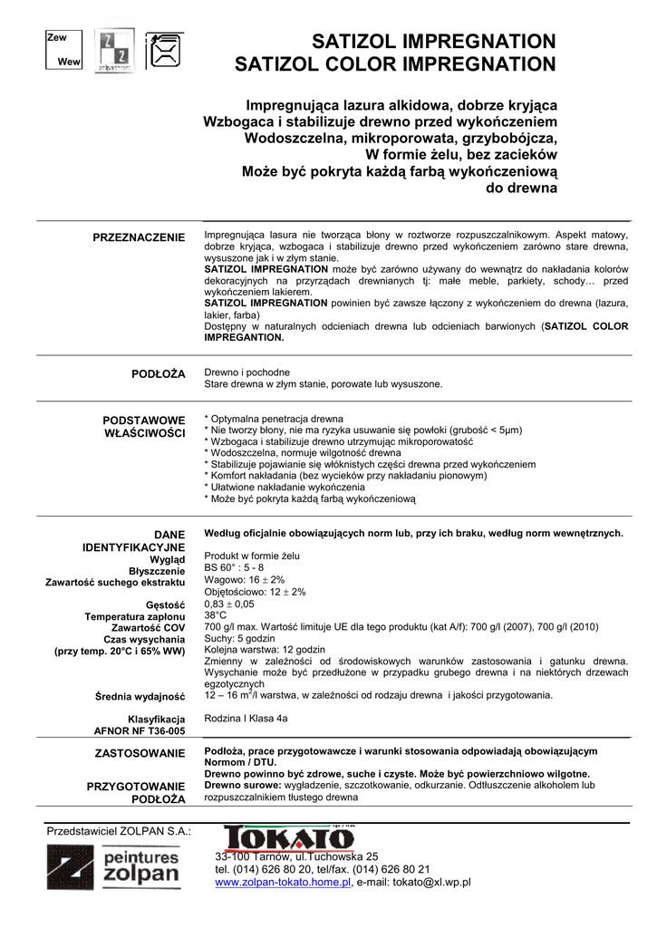 Zew SATIZOL IMPREGNATION SATIZOL COLOR IMPREGNATION Wew Impregnująca lazura alkidowa, dobrze kryjąca Wzbogaca i stabilizuje drewno przed wykończeniem Wodoszczelna, mikroporowata, grzybobójcza, W formie Ŝelu, bez zacieków MoŜe być pokryta kaŜdą farbą wykończeniową do drewna PRZEZNACZENIE PODŁOśA PODSTAWOWE WŁAŚCIWOŚCI DANE IDENTYFIKACYJNE Wygląd Błyszczenie Zawartość suchego ekstraktu Gęstość Temperatura zapłonu Zawartość COV Czas wysychania (przy temp. 20°C i 65% WW) Średnia wydajność Impregnująca lasura nie tworząca błony w roztworze rozpuszczalnikowym. Aspekt matowy, dobrze kryjąca, wzbogaca i stabilizuje drewno przed wykończeniem zarówno stare drewna, wysuszone jak i w złym stanie. SATIZOL IMPREGNATION moŜe być zarówno uŜywany do wewnątrz do nakładania kolorów dekoracyjnych na przyrządach drewnianych tj: małe meble, parkiety, schody… przed wykończeniem lakierem. SATIZOL IMPREGNATION powinien być zawsze łączony z wykończeniem do drewna (lazura, lakier, farba) Dostępny w naturalnych odcieniach drewna lub odcieniach barwionych (SATIZOL COLOR IMPREGANTION. Drewno i pochodne Stare drewna w złym stanie, porowate lub wysuszone. * Optymalna penetracja drewna * Nie tworzy błony, nie ma ryzyka usuwanie się powłoki (grubość < 5µm) * Wzbogaca i stabilizuje drewno utrzymując mikroporowatość * Wodoszczelna, normuje wilgotność drewna * Stabilizuje pojawianie się włóknistych części drewna przed wykończeniem * Komfort nakładania (bez wycieków przy nakładaniu pionowym) * Ułatwione nakładanie wykończenia * MoŜe być pokryta kaŜdą farbą wykończeniową Według oficjalnie obowiązujących norm lub, przy ich braku, według norm wewnętrznych. Produkt w formie Ŝelu BS 60° : 5 - 8 Wagowo: 16 ± 2% Objętościowo: 12 ± 2% 0,83 ± 0,05 38°C 700 g/l max. Wartość limituje UE dla tego produktu (kat A/f): 700 g/l (2007), 700 g/l (2010) Suchy: 5 godzin Kolejna warstwa: 12 godzin Zmienny w zaleŜności od środowiskowych warunków zastosowania i gatunku drewna. Wysychanie moŜe być przedłuŜone w przypadku grubego drewna i na niektórych drzewach egzotycznych 2 12 – 16 m /l warstwa, w zaleŜności od rodzaju drewna i jakości przygotowania. Klasyfikacja AFNOR NF T36-005 Rodzina I Klasa 4a ZASTOSOWANIE PodłoŜa, prace przygotowawcze i warunki stosowania odpowiadają obowiązującym Normom / DTU. Drewno powinno być zdrowe, suche i czyste. MoŜe być powierzchniowo wilgotne. Drewno surowe: wygładzenie, szczotkowanie, odkurzanie. Odtłuszczenie alkoholem lub rozpuszczalnikiem tłustego drewna PRZYGOTOWANIE PODŁOśA Przedstawiciel ZOLPAN S.A.: 33-100 Tarnów, ul.Tuchowska 25 tel. (014) 626 80 20, tel/fax. (014) 626 80 21 www.zolpan-tokato.home.pl, e-mail: [email protected] Drewno stare: nakładanie powinno się odbywać na drewnach o dobrej integralności fizycznej i dobrej spójności podłoŜa. Ze względu na przypadek: * Powrót do zdrowego drewna poprzez lekkie szlifowanie, wodogumowanie pod niskim ciśnieniem,… lub całkowita zamiana części zdegradowanych. * Mycie, odkaŜanie powierzchni i rozjaśnianie drewna zczarniałego wodą Javel (1 objętość wody Javel rozcieńczonej w 2 objętościach wody). Sposób nakładania: pędzel kwadratowy, pozostawić na ok. 15 min, i szczotkować szczotką nylonową. Spłukać i pozostawić do wyschnięcia. Dodatkowe moŜliwe przygotowanie: Środkiem SATIZOL TRAITANT zabezpieczyć drewno uszkodzone przez pasoŜyty lub które moŜe być zaatakowane przez insekty lub pleśń. ZASTOSOWANIE PRODUKTU Liczba warstw Narzędzia Rozcieńczanie Mycie narzędzi ZALECENIA KOLORY OPAKOWANIE PRZECHOWYWANIE BEZPIECZEŃSTWO I HIGIENA PRACY 1 warstwa do nasycenia W pracach na zewnątrz, zwracać szczególną uwagę na złączenia, lub części bardzo wchłaniające. MoŜe być pokryta kaŜdą farbą wykończeniową (lazura, lakier, farba) Płaski i szeroki pędzel z elastycznym włosiem lub średni wałek i spalter-ruchy wykonywać w kierunku słojów drewna. Zaleca się uŜywać specjalnego sprzętu lazurowego. Produkt gotowy do uŜytku. Do 3% WHITE SPIRIT na 1 warstwę. WHITE SPIRIT, natychmiast po uŜyciu Warunki i sposób nakładania: - przy temperaturze otoczenia i podkładu między 5°C i 35°C - przy suchej pogodzie, bez gwałtownego wiatru i bezpośredniego nasłonecznienia 1 kolor drewna Wzornik TEINTES COLOREES realizowane w ZOLPACHROM 2 (baza T = SATIZOL COLOR IMPREGNATION) 1 L - 4 L - 12 L 24 miesiące w nieuszkodzonym opakowaniu fabrycznym. Chronić przed mrozem. Zapoznać się z : • etykietą na opakowaniu • plik informacyjny nt. bezpieczeństwa • INTERNET: www.zolpan.fr (pozycja: oferta handlowa) • MINITEL: 08.36.05.10.12 kod ZOLPAN (nr zielony bezpłatny) • Karta Techniczna nr 2260 Data wydania: styczeń 2008 Producent: ZOLPAN S.A. Francja Uwaga: UniewaŜnia i zastępuje wcześniejsze wydania. Do naszych klientów naleŜy sprawdzenie, przed uŜyciem, czy chodzi o ostatnie wydanie ulotki. Informacje zawarte w tej ulotce mają tylko charakter orientacyjny i nie mogą zastąpić instrukcji postępowania dostosowanego do natury oraz do stanu konkretnego podłoŜa. Przedstawiciel ZOLPAN S.A.: 33-100 Tarnów, ul.Tuchowska 25 tel. (014) 626 80 20, tel/fax. (014) 626 80 21 www.zolpan-tokato.home.pl, e-mail: [email protected]