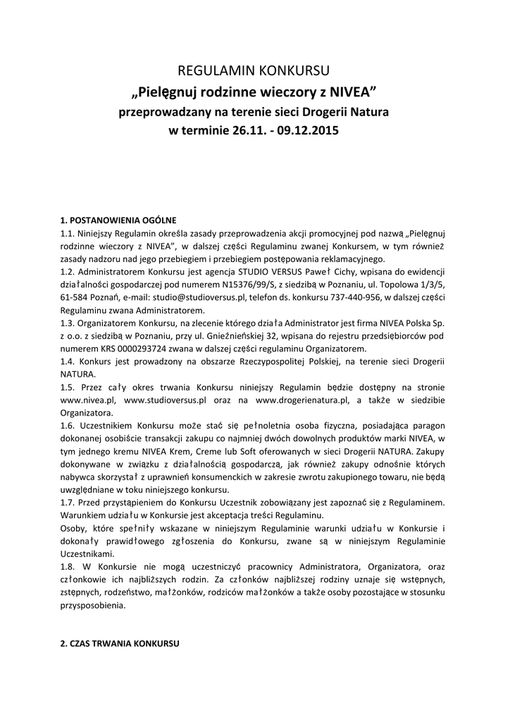 REGULAMIN KONKURSU „Pielę gnuj rodzinne wieczory z NIVEA” przeprowadzany na terenie sieci Drogerii Natura w terminie 26.11. - 09.12.2015 1. POSTANOWIENIA OGÓLNE 1.1. Niniejszy Regulamin określa zasady przeprowadzenia akcji promocyjnej pod nazwą„Pielęgnuj rodzinne wieczory z NIVEA”, w dalszej części Regulaminu zwanej Konkursem, w tym również zasady nadzoru nad jego przebiegiem i przebiegiem postępowania reklamacyjnego. 1.2. Administratorem Konkursu jest agencja STUDIO VERSUS PawełCichy, wpisana do ewidencji działalności gospodarczej pod numerem N15376/99/S, z siedzibąw Poznaniu, ul. Topolowa 1/3/5, 61-584 Poznań, e-mail: [email protected], telefon ds. konkursu 737-440-956, w dalszej części Regulaminu zwana Administratorem. 1.3. Organizatorem Konkursu, na zlecenie którego działa Administrator jest firma NIVEA Polska Sp. z o.o. z siedzibąw Poznaniu, przy ul. Gnieźnieńskiej 32, wpisana do rejestru przedsiębiorców pod numerem KRS 0000293724 zwana w dalszej części regulaminu Organizatorem. 1.4. Konkurs jest prowadzony na obszarze Rzeczypospolitej Polskiej, na terenie sieci Drogerii NATURA. 1.5. Przez cały okres trwania Konkursu niniejszy Regulamin będzie dostępny na stronie www.nivea.pl, www.studioversus.pl oraz na www.drogerienatura.pl, a także w siedzibie Organizatora. 1.6. Uczestnikiem Konkursu może stać się pełnoletnia osoba fizyczna, posiadająca paragon dokonanej osobiście transakcji zakupu co najmniej dwóch dowolnych produktów marki NIVEA, w tym jednego kremu NIVEA Krem, Creme lub Soft oferowanych w sieci Drogerii NATURA. Zakupy dokonywane w związku z działalnością gospodarczą, jak również zakupy odnośnie których nabywca skorzystałz uprawnieńkonsumenckich w zakresie zwrotu zakupionego towaru, nie będą uwzględniane w toku niniejszego konkursu. 1.7. Przed przystąpieniem do Konkursu Uczestnik zobowiązany jest zapoznaćsięz Regulaminem. Warunkiem udziału w Konkursie jest akceptacja treści Regulaminu. Osoby, które spełniły wskazane w niniejszym Regulaminie warunki udziału w Konkursie i dokonały prawidłowego zgłoszenia do Konkursu, zwane są w niniejszym Regulaminie Uczestnikami. 1.8. W Konkursie nie mogą uczestniczyć pracownicy Administratora, Organizatora, oraz członkowie ich najbliższych rodzin. Za członków najbliższej rodziny uznaje się wstępnych, zstępnych, rodzeństwo, małżonków, rodziców małżonków a także osoby pozostające w stosunku przysposobienia. 2. CZAS TRWANIA KONKURSU 2.1. Konkurs rozpoczyna sięw dniu 26.11.2015 od godz.00:00:01, a zakończy sięw dniu 09.12.2015 o godz. 23:59:59. We wskazanym okresie przyjmowane sązgłoszenia do Konkursu. Okres ten nie obejmuje wydania nagród oraz ewentualnej procedury reklamacyjnej. 2.2. Sprzedażąpromocyjnąuprawniającądo udziału w Konkursie objęte wszystkie produkty marki NIVEA, oferowe w sieci Drogerii NATURA, w okresie sprzedaży promocyjnej. W konkursie biorą udziałwszystkie sklepy sieci drogerii Natura na terenie Rzeczypospolitej Polskiej. Zakup tych produktów przed rozpoczęciem lub po zakończeniu Konkursu nie uprawnia do wzięcia udziału w Konkursie. 3. ZASADY KONKURSU 3.1. Aby wziąćudziałw Konkursie należy w trakcie trwania Konkursu: A) dokonaćzakupu co najmniej dwóch dowolnych produktów NIVEA, w tym jednego kremu NIVEA Krem, Creme lub Soft oferowanych w sieci Drogerii NATURA w godzinach ich otwarcia; B) zachowaćoryginalny paragon potwierdzający zakup; C) odpowiedziećna zadanie konkursowe, polegające na kreatywnym dokończeniu zdania: "Krem NIVEA to dla mnie…" - odpowiedź(rozwiązanie zadania) poprzedzonąsłowem „NIVEA” i numerem paragonu wysłaćSMS-em pod numer 70711 wg schematu („zgłoszenie”): NIVEA.numer paragonu.odpowiedź np: NIVEA.020202.TREŚĆODPOWIEDZI 3.2. Oryginalny paragon należy zachowaćprzez okres 60 dni od zakończenia Konkursu. 3.3. Jeden paragon upoważnia do wysłania tylko i wyłącznie jednego zgłoszenia do Konkursu. Wykorzystanie kolejny raz tego samego paragonu będzie traktowane jako zgłoszenie nieprawidłowe, nie biorące udziału w Konkursie. 3.4. Jedna osoba może wielokrotnie wysyłaćzgłoszenia do Konkursu pod warunkiem dokonania kolejnych zakupów i uzyskania kolejnych paragonów. 3.5 Łączna długośćSMS-a zawierającego rozwiązanie zadania konkursowego nie może przekroczyć160 znaków wraz ze spacjami. Koszt wysłania SMS wynosi 0,62 PLN brutto (tj. 0,50 PLN netto + VAT). Organizator nie ponosi kosztów wysyłania SMS przez osoby biorące udziałw Konkursie. 4. NAGRODY I SPOSÓB ICH PRZYZNAWANIA 4.1. Nagrodami w Konkursie są: - Nagroda I stopnia: Tablet Samsung Galaxy Tab 3 Lite, o wartości 370 zł- zostanie wydanych 10 szt. – zostanie przyznanych 10 szt. - Nagroda II stopnia: kosmetyki NIVEA - o wartości 90zł, zostanie wydanych 200 szt. Wykaz kosmetyków zawiera Załącznik nr 1. 4.2. Laureatów Konkursu wyłoni Komisja Konkursowa powołana przez Organizatora. 4.3. Komisja Konkursowa dokona wyboru 210 najciekawszych rozwiązańzadania konkursowego spośród wszystkich zgłoszeńnadesłanych i spełniających warunki przystąpienia do Konkursu przewidziane w Regulaminie. Kryterium wyboru będzie oryginalnośći poziom kreatywności przy czym oceny sądokonywane na podstawie subiektywnych wrażeńczłonków Komisji. 4.4. Osoby, których rozwiązania zadania konkursowego zostaną wybrane przez Komisję Konkursową(„Laureaci”) zostanąpoinformowane o tym fakcie drogątelefonicznąw ciągu 30 dni roboczych od dnia zakończenia Konkursu na numer telefonu, z którego nastąpiło przesłanie zgłoszenia. 4.5. Laureatom nie przysługuje prawo do zastrzeżenia wyboru szczególnych właściwości nagrody. 4.6 Na podstawie art. 30 ust. 1 pkt 2 ustawy z dnia 26 lipca 1991 roku o podatku dochodowym od osób fizycznych (tekst jedn. Dz. U. z 2012 r., poz. 361 z późn. zm.) wydanie nagród, o których mowa w ust. 4.1., podlega opodatkowaniu zryczałtowanym podatkiem dochodow