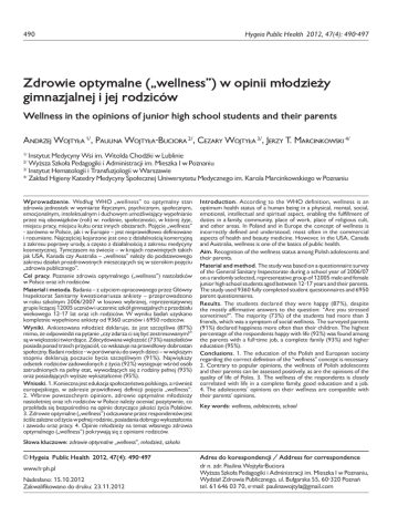490 Hygeia Public Health 2012, 47(4): 490-497 Zdrowie optymalne („wellness”) w opinii młodzieży gimnazjalnej i jej rodziców Wellness in the opinions of junior high school students and their parents Andrzej Wojtyła 1/, Paulina Wojtyła-Buciora 2/, Cezary Wojtyła 3/, Jerzy T. Marcinkowski 4/ Instytut Medycyny Wsi im. Witolda Chodźki w Lublinie Wyższa Szkoła Pedagogiki i Administracji im. Mieszka I w Poznaniu 3/ Instytut Hematologii i Transfuzjologii w Warszawie 4/ Zakład Higieny Katedry Medycyny Społecznej Uniwersytetu Medycznego im. Karola Marcinkowskiego w Poznaniu 1/ 2/ Wprowadzenie. Według WHO „wellness” to optymalny stan zdrowia jednostek w wymiarze fizycznym, psychicznym, społecznym, emocjonalnym, intelektualnym i duchowym umożliwiający wypełnianie przez nią obowiązków (roli) w: rodzinie, społeczności, w której żyje, miejscu pracy, miejscu kultu oraz innych obszarach. Pojęcie „wellness” - zarówno w Polsce, jak i w Europie – jest nieprawidłowo definiowane i rozumiane. Najczęściej kojarzone jest ono z działalnością komercyjną z zakresu poprawy urody, a często z działalnością z zakresu medycyny kosmetycznej. Tymczasem na świecie – w krajach rozwiniętych takich jak USA, Kanada czy Australia – „wellness” należy do podstawowego zakresu działań prozdrowotnych mieszczących się w szerokim pojęciu „zdrowia publicznego”. Cel pracy. Poznanie zdrowia optymalnego („wellness”) nastolatków w Polsce oraz ich rodziców. Materiał i metoda. Badania – z użyciem opracowanego przez Główny Inspektorat Sanitarny kwestionariusza ankiety – przeprowadzono w roku szkolnym 2006/2007 w losowo wybranej, reprezentatywnej grupie liczącej 12005 uczniów i uczennic szkół gimnazjalnych z przedziału wiekowego 12-17 lat oraz ich rodziców. W wyniku badań uzyskano kompletnie wypełnione ankiety od 9360 uczniów i 6950 rodziców. Wyniki. Ankietowana młodzież deklaruje, że jest szczęśliwa (87%) mimo, że odpowiedzi na pytanie „czy zdarza ci się być zestresowanym?” są w większości twierdzące. Zdecydowana większość (73%) nastolatków posiada ponad trzech przyjaciół, co wskazuje na prawidłowy dobrostan społeczny. Badani rodzice - w porównaniu do swych dzieci – w większym stopniu deklarują poczucie bycia szczęśliwym (91%). Największy odsetek rodziców zadowolonych z życia (92%) występuje wśród osób zatrudnionych na pełny etat, wywodzących się z rodziny pełnej (93%) oraz posiadających wyższe wykształcenie (95%). Wnioski. 1. Konieczna jest edukacja społeczeństwa polskiego, a również europejskiego, w zakresie prawidłowej definicji pojęcia „wellness”. 2. Wbrew powszechnym opiniom, zdrowie optymalne młodzieży nastoletniej oraz ich rodziców w Polsce należy oceniać pozytywnie, co przekłada się bezpośrednio na opinie dotyczące jakości życia Polaków. 3. Zdrowie optymalne („wellness”) odczuwane przez respondentów jest ściśle zależne od życia w pełnej rodzinie, posiadania dobrego wykształcenia i zawodu oraz pracy. 4. Opinie młodzieży na temat własnego zdrowia optymalnego („wellness”) pokrywają się z opiniami rodziców. Introduction. According to the WHO definition, wellness is an optimum health status of a human being in a physical, mental, social, emotional, intellectual and spiritual aspect, enabling the fulfillment of duties in a family, community, place of work, place of religious cult, and other areas. In Poland and in Europe the concept of wellness is incorrectly defined and understood; most often in the commercial aspects of health and beauty medicine. However, in the USA, Canada and Australia, wellness is one of the basics of public health. Aim. Recognition of the wellness status among Polish adolescents and their parents. Material and method. The study was based on a questionnaire survey of the General Sanitary Inspectorate during a school year of 2006/07 on a randomly selected, representative group of 12005 male and female junior high school students aged between 12-17 years and their parents. The study used 9360 fully completed student questionnaires and 6950 parent questionnaires. Results. The students declared they were happy (87%), despite the mostly affirmative answers to the question: “Are you stressed sometimes?”. The majority (73%) of the students had more than 3 friends, which was a symptom of social wellness. The surveyed parents (91%) declared happiness more often than their children. The highest percentage of the respondents happy with life (92%) was found among the parents with a full-time job, a complete family (93%) and higher education (95%). Conclusions. 1. The education of the Polish and European society regarding the correct definition of the “wellness” concept is necessary. 2. Contrary to popular opinions, the wellness of Polish adolescents and their parents can be assessed positively, as are the opinions of the quality of life of Poles. 3. The wellness of the respondents is closely correlated with life in a complete family, good education and a job. 4. The adolescents’ opinions on their wellness are compatible with their parents’ opinions. Key words: wellness, adolescents, school Słowa kluczowe: zdrowie optymalne „wellness”, młodzież, szkoła © Hygeia Public Health 2012, 47(4): 490-497 Adres do korespondencji / Address for correspondence www.h-ph.pl dr n. zdr. Paulina Wojtyła-Buciora Wyższa Szkoła Pedagogiki i Administracji im. Mieszka I w Poznaniu, Wydział Zdrowia Publicznego, ul. Bułgarska 55, 60-320 Poznań tel. 61 646 03 70, e-mail: [email protected] Nadesłano: 15.10.2012 Zakwalifikowano do druku: 23.11.2012 Wojtyła A i wsp. Zdrowie optymalne („wellness”) w opinii młodzieży gimnazjalnej i jej rodziców Wstęp Według Światowej Organizacji Zdrowia (WHO – World Health Organization) „wellness” to optymalny stan zdrowia jednostek w wymiarze fizycznym, psychicznym, społecznym, emocjonalnym, intelektual