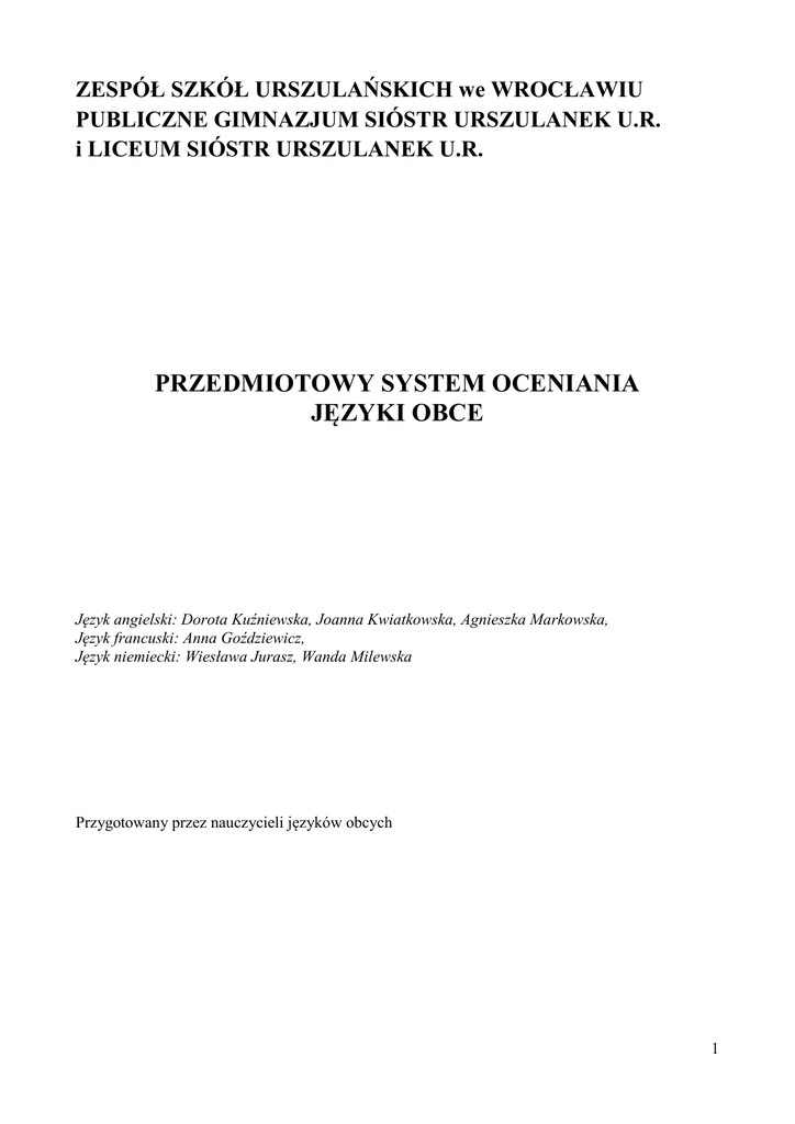 ZESPÓŁ SZKÓŁ URSZULAŃSKICH we WROCŁAWIU PUBLICZNE GIMNAZJUM SIÓSTR URSZULANEK U.R. i LICEUM SIÓSTR URSZULANEK U.R. PRZEDMIOTOWY SYSTEM OCENIANIA JĘZYKI OBCE Język angielski: Dorota Kuźniewska, Joanna Kwiatkowska, Agnieszka Markowska, Język francuski: Anna Goździewicz, Język niemiecki: Wiesława Jurasz, Wanda Milewska Przygotowany przez nauczycieli języków obcych 1 Przedmiotowy system oceniania z języka obcego 1. Na początku każdego roku szkolnego nauczyciel zapoznaje uczniów z zakresem wymagań edukacyjnych oraz systemem oceniania na lekcjach języka obcego. 2. Obszary aktywności ucznia. i. umiejętność rozumienia tekstu słuchanego, ii. umiejętność rozumienia tekstu pisanego, iii. umiejętność mówienia, iv. umiejętność pisania, v. znajomość słownictwa, vi. znajomość gramatyki, vii. aktywność na lekcji, viii. odrabianie prac domowych, ix. udział w konkursach i olimpiadach szkolnych i pozaszkolnych. 3. Obszary aktywności oceniane na lekcjach: • przyswajanie niezbędnej wiedzy z zakresu języka obcego oraz wiedzy o kulturze danego kraju, • opanowanie niezbędnych umiejętności językowych: mówienie, rozumienie ze słuchu, czytanie, pisanie i stosowanie struktur leksykalno-gramatycznych, • wkład pracy własnej: pilność, staranność i systematyczność. 4. Formy sprawdzania wiedzy i umiejętności uczniów: a) prace klasowe (sprawdziany, testy gramatyczne, testy leksykalne, testy z rozumienia ze słuchu, testy z rozumienia tekstów pisanych, wypowiedzi pisemne). Dopuszcza się łączenie różnych typów testów w ramach jednej pracy pisemnej, b) kartkówki niezapowiedziane (obejmujące materiał leksykalno-gramatyczny z 3 ostatnich zajęć edukacyjnych), c) kartkówki zapowiedziane (obejmujące materiał określony przez nauczyciela), d) wypowiedzi ustne (opowiadania, dialogi itp.), e) dyktanda, f) aktywność na zajęciach edukacyjnych, g) wypowiedzi pisemne, h) zadania domowe, i) zadania długoterminowe – projekty, prezentacje . 2 5. Poszczególne formy oceniania wiadomości i umiejętności mają następujące wagi: Waga 6 praca klasowa, poprawa pracy klasowej Waga 5 kartkówka trudniejsza, projekt, prezentacja, odpowiedź ustna Waga 4 wypowiedź pisemna, nieprzygotowanie do lekcji Waga 3 Kartkówka łatwiejsza, zadanie domowe Waga 2 czytanie, dyktando Waga 1 inne 6. Oceny uzyskane przez ucznia są jawne i na prośbę ucznia lub rodziców mogą być uzasadnione. 7. Procedura ustalania ocen: a) We wszystkich klasach prace klasowe, kartkówki i wypowiedzi pisemne ocenia się wg następującej skali procentowej : 0% ocena niedostateczna 44% 45% ocena dopuszczająca 60% 60 ocena dostateczna 75% ocena dobra 89% ocena bardzo dobra 100% = ocena celująca. b) Nie stosuje się znaków „+” i „-” przy ocenach. c) W przypadku osób z dysfunkcjami nie bierze się pod uwagę błędów w pisowni i w wymowie, chyba że zakłócają one w sposób istotny komunikację w języku angielskim (błąd ortograficzny powodujący zmianę znaczenia zastosowanych słów i zwrotów uznawany jest za błąd językowy). W sytuacji, gdy kartkówki bądź sprawdziany będą zawierać ćwiczenia zamknięte, np.: wielokrotny wybór, prawda/fałsz, dobieranie, wówczas uczeń dyslektyczny oceniany jest tak jak uczniowie bez zdiagnozowanych dysfunkcji. 8. Zasady przeprowadzania prac klasowych i innych form oceniania oraz poprawiania ocen: a) Uczeń zostaje poinformowany o zaplanowanej pracy klasowej z przynajmniej tygodniowym wyprzedzeniem. Nauczyciel podaje zakres materiału obowiązującego na pracę klasową oraz określa wymagania. Nauczyciel zapisuje informację o pracy klasowej w dzienniku lekcyjnym. b) Prace klasowe są obowiązkowe. Jeśli z przyczyn losowych lub nieobecności dłuższej niż 3 dni uczeń nie może pisać pracy klasowej w ustalonym terminie, to powinien zaliczyć go na warunkach ustalonych z nauczycielem. c) Ocena niedostateczna z pracy klasowej uzyskana w pierwszym terminie może być poprawiona jednokrotnie w ciągu dwóch tygodni od daty rozdania prac. Ocena otrzymana z poprawy wpisana zostaje jako ocena z poprawy pracy klasowej. Ocen wyższych niż ocena niedostateczna nie poprawia się. 3 d) Uczeń nieobecny na zajęciach edukacyjnych, na których przeprowadzono kartkówkę zapowiedzianą bądź niezapowiedzianą, ma obowiązek napisać zaległą pracę na najbliższych zajęciach, na których jest obecny. e) Oceny z kartkówek nie podlegają poprawie. f) Uczeń, który w czasie sprawdzianu, testu, kartkówki lub innej formy pracy klasowej został przyłapany na ściąganiu, posiadaniu ściągi, komunikowaniu się z koleżanką/kolegą lub udzielaniu podpowiedzi, otrzymuje ocenę niedostateczną i nie ma możliwości poprawy tej oceny. To samo dotyczy osoby, której pomagano, podpowiadano, przekazywano ściągę. 9. Oceny śródroczne i końcoworoczne: a) Na ocenę śródroczną i końcoworoczną uczeń pracuje przez cały czas. Przy wystawieniu oceny końcoworocznej uwzględnia się oceny z pierwszego semestru, 10. Obowiązki i prawa ucznia: a) Uczeń na lekcji ma obowiązek posiadać podręcznik, zeszyt przedmiotowy, kserokopie ćwiczeń dodatkowych, inne materiały zalecone przez nauczyciela , których brak jest traktowany jako nieprzygotowanie do lekcji. b) Prace domowe, prace projektowe są obowiązkowe. c) Odpisywanie zadań domowych, oraz oddawanie do oceny prac nie napisanych samodzielnie jest jednoznaczne z otrzymaniem oceny niedostatecznej. d) Uczeń, który był nieobecny na ostatniej lekcji, ma obowiązek przygotować się do zajęć we własnym zakresie (zadanie domowe + omawiane zagadnienia). Wyjątek stanowi przypadek, gdy uczeń przychodzi do szkoły po dłuższej nieobecności spowodowanej chorobą. W przypadku dłuższej niż 2 tygodnie nieobecności, termin uzupełnienia braków należy ustalić z nauczycielem. e) Jeśli uczeń otrzymał ocenę niedostateczną (lub nieprzygotowanie) za brak zadania domowego, ma obo