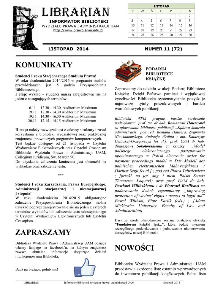 LIBRARIAN INFORMATOR BIBLIOTEKI WYDZIAŁU PRAWA I ADMINISTRACJI UAM http://www.prawo.amu.edu.pl LISTOPAD 2014 NUMER 11 (72) KOMUNIKATY Studenci I roku Stacjonarnego Studium Prawa! W roku akademickim 2014/2015 w programie studiów przewidzianych jest 5 godzin Przysposobienia Bibliotecznego. I etap: wykład – studenci muszą zarejestrować się na jeden z następujących terminów: 6.11 19.11 19.11 20.11 12.30 - 14.30 Auditorium Maximum 12.30 - 14.30 Auditorium Maximum 14.30 - 16.30 Auditorium Maximum 12.15 - 14.15 Auditorium Maximum II etap: należy rozwiązać test z zakresy struktury i zasad korzystania z biblioteki wydziałowej oraz praktycznej znajomości prawniczych programów komputerowych. Test będzie dostępny od 21 listopada w Czytelni Wydawnictw Elektronicznych oraz Czytelni Czasopism Biblioteki Wydziału Prawa i Administracji UAM, Collegium Iuridicum, Św. Marcin 90. Do uzyskania zaliczenia konieczna jest obecność na wykładzie oraz zaliczenie testu. *** Studenci I roku Zarządzania, Prawa Europejskiego, Administracji stacjonarnej i niestacjonarnej I stopnia! W roku akademickim 2014/2015 obligatoryjne zaliczenie Przysposobienia Bibliotecznego można uzyskać poprzez zarejestrowanie się na jeden z czterech terminów wykładów lub zaliczenie testu udostępnianego w Czytelni Wydawnictw Elektronicznych lub Czytelni Czasopism. ZAPRASZAMY PODARUJ BIBLIOTECE KSIĄŻKĘ Zapraszamy do udziału w akcji Podaruj Bibliotece Książkę. Dzięki Państwa pamięci i wyjątkowej życzliwości Biblioteka systematycznie pozyskuje najnowsze tytuły poszukiwanych i bardzo wartościowych publikacji. Biblioteka WPiA pragnie bardzo serdecznie podziękować prof. zw. dr hab. Romanowi Hauserowi za ofiarowanie bibliotece publikacji „Sądowa kontrola administracji” pod red. Romana Hausera, Zygmunta Niewiadomskego, Andrzeja Wróbla ; aut. Katarzyny Celińskej-Grzegorczyk [et al.]; prof. UAM dr hab. Tomaszowi Sokołowskiemu za książkę „Model polskiego elektronicznego postępowania upominawczego = Polish electronic order for payment proceedings model = Das Modell des polnischen elektronischen Mahnverfahrens / Dariusz Segit [et al.] ; pod red.Piotra Telusiewicza ; [przekł. na jęz. ang. i niem. Polski Serwis Tłumaczeń Loquax]; oraz prof. UAM dr hab. Pawłowi Wilińskiemu i dr Piotrowi Karlikowi za podarowanie dwóch egzemplarzy „Improving protection of victims' rights : access to legal aid” Paweł Wiliński, Piotr Karlik (eds.) ; [Adam Mickiewicz University. Faculty of Law and Administration]. Dary za zgodą ofiarodawców zostaną opatrzone etykietą "Fundatorem książki jest...", która będzie wyrazem szczególnego podziękowania i jednocześnie uhonorowania darczyńców naszej Biblioteki. Biblioteka Wydziału Prawa i Administracji UAM posiada własny fanpage na facebook’u, na którym znajdziesz zawsze aktualne informacje dotyczące działań i funkcjonowania Biblioteki. NOWOŚCI Bądź na bieżąco, polub nas! Biblioteka Wydziału Prawa i Administracji UAM przedstawia skróconą listę ostatnio wprowadzonych do inwentarza publikacji książkowych. Pełna lista LIBRARIAN Informator Biblioteki Wydziału Prawa i Administracji UAM Listopad 2014 wszystkich nowości dostępna jest na stronie internetowej Biblioteki http://prawo.amu.edu.pl, zakładka Biblioteka, nowości książkowe. KSIĄŻKI RA 128951 RA 128952 Sądowa kontrola administracji / red. Roman Hauser, Zygmunt Niewiadomski, Andrzej Wróbel ; aut. Katarzyna CelińskaGrzegorczyk [et al.]. Warszawa : 2014 - [Stan prawny na 1 września 2014 r.] RA 128953 RA 128954 Przedkontraktowe inwestycje specyficzne w reżimie odpowiedzialności przedkontraktowej / Marcin Spyra. Warszawa : 2014 RA 128955 RA 128956 Fuzje i przejęcia spółek kapitałowych : zagadnienia rachunkowe i podatkowe / André Helin [et al.]. Warszawa : 2014 - Wyd. 3 RA 128959 RA 128960 Kodeks postępowania administracyjnego : komentarz / Robert Kędziora. Warszawa : 2014 - 4. wyd. RA 128961 RA 128962 Kodeks cywilny : komentarz / red. Edward Gniewek, Piotr Machnikowski ; aut. Beata Burian [et al.]. Warszawa : 2014 RA 128963 RA 128964 Zaskarżanie decyzji podatkowej : komentarz praktyczny z orzecznictwem, wzory pism procesowych i kazus / Monika Wyszomirska-Łapczyńska. Warszawa : 2014 RA 128965 RA 128966 Kodeks spółek handlowych : komentarz / red. Zbigniew Jara ; aut. Tomasz Bieniek [et al.]. Warszawa : 2014 - [Stan prawny na 1 września 2014 RA 128967 RA 128968 Opinie prawne w praktyce / red. Małgorzata Król ; aut. Małgorzata Król [et al.]. Warszawa : 2014 RA 128969 RA 128970 Prawo umów handlowych / pod red. Stanisława Włodyki ; aut. Mirosław Bączyk [et al.]. Warszawa : 2014 - 4. wyd. RA 128971 RA 128972 Publicznoprawne podstawy bezpieczeństwa wewnętrznego / red. nauk. Marian Zdyb ; [aut.] Barbara Danieluk [et al.]. Warszawa : 2014 - Stan prawny na 1 lipca 2014 r. RA 128973 RA 128974 Historia myśli ustrojowej i społecznej / Iwona Barwicka-Tylek, Jacek Malczewski ; red. nauk. Michał Jaskólski. Warszawa : 2014 - 2. wyd. RA 128975 RA 128976 Kontrola skarbowa w systemie kontroli państwowej / Jacek Kulicki. Warszawa : 2014 - Stan prawny na 1 lipca 2014 r RA 128977 RA 128978 RA 128979 Prawo pracy : repetytorium / Magdalena Barbara Rycak, Ewa Wronikowska, Artur Rycak. Warszawa : 2014 - 2. wyd., stan prawny na 1 września 2014 r. RA 128980 RA 128981 Prawo właściwe dla dobrego imienia osoby fizycznej i jego ochrony / Justyna Balcarczyk. Warszawa : 2014 - Stan prawny na 1 września 2014 r. RA 128982 Roczność i wieloletniość w finansach publicznych / red. nauk. Eugeniusz Ruśkowski ; [aut.] Eugeniusz Ruśkowski [et al.]. Warszawa : 2014 - Stan prawny na 1 sierpnia 2014 r. RA 128983 RA 128984 RA 128985 RA 128986 Prawo cywilne i handlowe w zarysie / redakcja naukowa Wojciech J. Katner ; [aut.] Aleksander Kappes [et al.]. Warszawa : 2014 - 5. wyd., stan prawny na 30 maja 2014 r. LIBRARIAN RA 128987 RA 128988 Ustawa o związkach zawodowych : komentarz / Janus