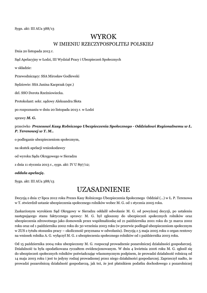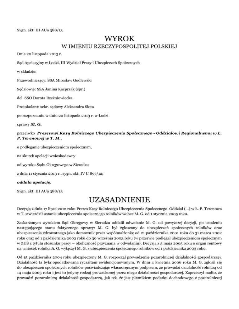 Sygn. akt: III AUa 388/13 WYROK W IMIENIU RZECZYPOSPOLITEJ POLSKIEJ Dnia 20 listopada 2013 r. Sąd Apelacyjny w Łodzi, III Wydział Pracy i Ubezpieczeń Społecznych w składzie: Przewodniczący: SSA Mirosław Godlewski Sędziowie: SSA Janina Kacprzak (spr.) del. SSO Dorota Rzeźniowiecka. Protokolant: sekr. sądowy Aleksandra Słota po rozpoznaniu w dniu 20 listopada 2013 r. w Łodzi sprawy M. G. przeciwko Prezesowi Kasy Rolniczego Ubezpieczenia Społecznego - Oddziałowi Regionalnemu w Ł. P. Terenowej w T. M.. o podleganie ubezpieczeniom społecznym, na skutek apelacji wnioskodawcy od wyroku Sądu Okręgowego w Sieradzu z dnia 11 stycznia 2013 r., sygn. akt: IV U 897/12; oddala apelację. Sygn. akt: III AUa 388/13 UZASADNIENIE Decyzją z dnia 17 lipca 2012 roku Prezes Kasy Rolniczego Ubezpieczenia Społecznego Oddział (...) w Ł. P. Terenowa w T. stwierdził ustanie ubezpieczenia społecznego rolników wobec M. G. od 1 stycznia 2005 roku. Zaskarżonym wyrokiem Sąd Okręgowy w Sieradzu oddalił odwołanie M. G. od powyższej decyzji, po ustaleniu następującego stanu faktycznego sprawy: M. G. był zgłoszony do ubezpieczeń społecznych rolników oraz ubezpieczenia zdrowotnego jako domownik przez współmałżonkę od 21 października 2001 roku do 31 marca 2002 roku oraz od 1 października 2002 roku do 30 września 2003 roku (w przerwie podlegał ubezpieczeniom społecznym w ZUS z tytułu stosunku pracy – okoliczność przyznana w odwołaniu). Decyzją z 5 maja 2005 roku o organ rentowy na wniosek rolnika A. G. wyłączył M. G. z ubezpieczenia społecznego rolników od 1 października 2003 roku. Od 15 października 2004 roku ubezpieczony M. G. rozpoczął prowadzenie pozarolniczej działalności gospodarczej. Działalność ta była opodatkowana ryczałtem ewidencjonowanym. W dniu 4 kwietnia 2006 roku M. G. zgłosił się do ubezpieczeń społecznych rolników poświadczając własnoręcznym podpisem, że prowadzi działalność rolniczą od 14 maja 2003 roku i jest to jedyny rodzaj prowadzonej przez niego działalności gospodarczej. Zaprzeczył nadto, że prowadzi pozarolniczą działalność gospodarczą, jak też, że jest płatnikiem podatku dochodowego z pozarolniczej działalności gospodarczej. Do zgłoszenia załączył akt notarialny z 14 maja 2003 roku - dowód zakupu nieruchomości rolnej o powierzchni 1,98 ha. Decyzją z dnia 21 kwietnia 2006 roku KRUS stwierdził podleganie M. G. ubezpieczeniom społecznym rolników z mocą wsteczną od 1 października 2003 roku. W maju 2012 roku do P. T. KRUS wpłynęła informacja o nieprzerwanie prowadzonej przez ubezpieczonego pozarolniczej działalności gospodarczej, od 15 października 2004 roku. W związku z tym, sporną decyzją z 17 lipca 2012 roku, Prezes KRUS stwierdził ustanie ubezpieczenia społecznego rolników wobec M. G. począwszy od 1 stycznia 2005 roku. W tym stanie faktycznym Sąd Okręgowy powołując się na treść art. 5a we wszystkich wersjach tego przepisu, uznał, że sporna decyzja Prezesa KRUS odpowiada prawu i w konsekwencji oddalił odwołanie. Wyrok sądu pierwszej instancji zaskarżony został apelacją ubezpieczonego. Apelacja zarzuciła zaskarżonemu wyrokowi: a) przyjęcie, że A. G. (była żona odwołującego) miała upoważnienie od M. G. do złożenia wniosku o wyłączenie M. G. z ubezpieczenia społecznego rolników, w sytuacji gdy M. G. nigdy nie upoważnił A. G. do złożenia takiego wniosku, b) naruszenie artykułu 233 par. 1 k.p.c. polegające na przyjęciu że odwołujący się nie prowadził działalności gospodarczej w 2006 roku, w sytuacji gdy z treści złożonych do akt sprawy podczas rozprawy w dniu 11 stycznia 2013 roku zaświadczeń jednoznacznie wynika że M. G. nieprzerwanie od 15 października 2004 roku prowadzi pozarolniczą działalność gospodarczą, c) niewłaściwą interpretację artykułu 5a ustęp 2 ustawy o ubezpieczeniu społecznym rolników obowiązującego w dniu wydania decyzji, z którego treści wynika że zmiana przedmiotu działalności gospodarczej przez podmiot podlegający ubezpieczeniu społecznemu rolników jest traktowana przez polskiego ustawodawcę tak samo jak rozpoczęcie działalności gospodarczej. Powołując się na powyższe skarżący wniósł o zmianę decyzji z 17 lipca 2012 roku i orzeczenie, że M. G. od dnia 1 października 2002 roku podlega ubezpieczeniu społecznemu rolników w zakresie ubezpieczenia wypadkowego, chorobowego, macierzyńskiego, emerytalno-rentowego, ewentualnie o: uchylenie decyzji z dnia 17 lipca 2012 roku i przekazanie KRUS sprawy do ponownego rozpoznania. Sąd Apelacyjny w Łodzi zważył, co następuje: Apelacja nie zawiera uzasadnionych podstaw. Okoliczności faktyczne istotne dla rozstrzygnięcia przedmiotowej sprawy są bezsporne. Poza sporem bowiem jest, że skarżący podlegając nieprzerwanie ubezpieczeniom społecznym rolników od 1 października 2002 roku, z dniem 15 października 2004 roku podjął prowadzenie pozarolniczej działalności gospodarczej, o czym nie powiadomił właściwej placówki terenowej Kasy Rolniczego Ubezpieczenia Społecznego. Co więcej skarżący w dniu 4 kwietnia 2006 roku wprowadził organ rentowy rolników w błąd oświadczając, że nie prowadzi pozarolniczej działalności gospodarczej (oświadczenie zawarte w zgłoszeniu do ubezpieczeń rolniczych z dnia 4 kwietnia 2006 r.). Okoliczności podnoszone w zarzutach apelacyjnych, rzekomo wadliwie ustalone przez sąd pierwszej instancji, nie mają żadnego znaczenia w przedmiotowej sprawie. Co prawda Sąd Okręgowy w swoich ustaleniach faktycznych zawarł stwierdzenie o zmianie przedmiotu pozarolniczej działalności gospodarczej skarżącego, to jednak tej okoliczności nie nadał żadnego znaczenia dla rozstrzygnięcia przedmiotowej sprawy. Nie ma również znaczenia w sprawie, czy A. G. - była żona skarżącego dysponowała upoważnieniem od skarżącego do wyłączenia go z ubezpieczeń społecznych rolników w 2005 roku