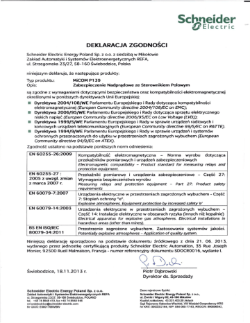 Schneider 4 ? E l e c t r ic DEKLARACJA ZGODNOŚCI Schneider Electric Energy Poland Sp. z o.o. z siedzibą w Mikołowie Zakład Automatyki i Systemów Elektroenergetycznych REFA, ul. Strzegomska 23/27, 58-160 Świebodzice, Polska niniejszym deklaruje, że następujące produkty: Typ produktu: Opis: MiCOM P I 39 Zabezpieczenie N a d p r ą d o w e ze S t e r o w n i k i e m P o l o w y m są zgodne z wymaganiami dotyczącymi bezpieczeństwa oraz kompatybilności elektromagnetycznej określonymi w poniższych dyrektywach Unii Europejskiej: • • • • Dyrektywa 2 0 0 4 / 1 0 8 / W E Parlamentu Europejskiego i Rady dotycząca kompatybilności elektromagnetycznej (Europen Community directive 2004/W8/EC on EMC); Dyrektywa 2 0 0 6 / 9 5 / W E Parlamentu Europejskiego i Rady dotycząca sprzętu elektrycznego niskich napięć (Europen Community directive 2006/95/EC on Low Voltage (LVD)); Dyrektywa 1 9 9 9 / 5 / W E Parlamentu Europejskiego i Rady w sprawie urządzeń radiowych i końcowych urządzeń telekomunikacyjnych (European Community directive 99/5/EC on R&TTE). Dyrektywa 1 9 9 4 / 9 / W E Parlamentu Europejskiego i Rady w sprawie urządzeń i systemów ochronnych przeznaczonych do użytku w przestrzeniach zagrożonych wybuchem (European Community directive 94/9/EC on ATEX). Zgodność ustalono na podstawie poniższych norm odniesienia: EN 60255-26:2009 EN 60255-27 : 2 0 0 5 z uwzgl. zmian z m a r c a 2 0 0 7 r. E N 60079-7:2007 EN 60079-14:2003 B S E N ISO/IEC 80079-34:2011 Kompatybilność elektromagnetyczna - Norma wyrobu przekaźników pomiarowych i urządzeń zabezpieczeniowych Electromagnetic compatibility protection equipment. - Product standard Przekaźniki pomiarowe i urządzenia Wymagania bezpieczeństwa wyrobu Measuring relays requirements and protection for measuring zabezpieczeniowe equipment - Part 27: dotycząca relays and - Część 27: Product safety Urządzenia elektryczne w przestrzeniach zagrożonych wybuchem - Część 7: Stopień ochrony " e " . Explosive atmospheres. Equipment protection by increased safety 'e' Urządzenia elektryczne w przestrzeniach zagrożonych wybuchem Część 14: Instalacje elektryczne w obszarach ryzyka (innych niż kopalnie) Electrical apparatus for explosive gas hazardous areas (other than mines). Przestrzenie Potentially zagrożone athospheres. Electrical wybuchem. Zastosowanie explosive atmospheres - Application of quality installations in systemów jakości. system. Niniejszą deklarację sporządzono na podstawie dokumentu źródłowego z dnia 2 1 . 0 6 . 2 0 1 3 , wydanego przez jednostkę certyfikującą produkty Schneider Electric Automation, 35 Rue Joseph Monier, 9 2 5 0 0 Rueil Malmaison, Francja - numer referencyjny dokumentu S D O C R 0 0 1 6 , wydanie I. Ś w i e b o d z i c e , 1 8 . 1 1 . 2 0 1 3 r. Piotr Dąbrowski Dyrektor ds. Sprzedaży Schneider Electric Energy Poland Sp. z o.o. Zakład Automatyki i S y s t e m ó w Elektroenergetycznych R E F A ul. Strzegomska 23/27, 58-160 Świebodzice, P O L A N D tel. +48 74 8548 410, fax+48 74 8548 548 [email protected] Nr G I O Ś : E0001768WBW Dane rejestrowe Spółki: Schneider Electric Energy Poland S p . z o.o., ul. Żwirki i W i g u r y 52,43-190 Mikołów Kapitał zakładowy; 43.031.400,00 złotych S ą d Rejonowy Katowice-Wschód, VIII Wydział Gospodarczy K R S Nr K R S : 0000202164, NIP: 884-000-77-93, R E G O N : 890006542,