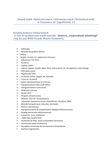 Zespół Szkół Elektronicznych i Informatycznych (Technikum nr8) w Sosnowcu, ul. Jagiellońska 13 Katalog pomocy edukacyjnych w tym do praktycznej nauki zawodu –dotyczy „stypendium szkolnego” /wg decyzji WED Urzędu Miasta Sosnowca/ - Kalkulator. - Słowniki do języków obcych. -Atlasy. -Książki, zeszyty, art. papierniczo-biurowe. - Odtwarzacz CD, filmy. - Pendrive. - Laptop, tablet. - Lektury szkolne -książki ,płyty, filmy, streszczenia, ćw. do egzaminu maturalnego. - DVD płyty-czyste - Nagrywarka DVD. - Drukarka, skaner (papier A4, koszulki). - Tusze do drukarek. -opłata abonamentowa za internet. - Oprogramowanie Microsoft Office. - Oprogramowanie Corel Draw. - Multimetr cyfrowy. - Router WiFi. - Program antywirusowy. - Monitor “LCD 19” do komputera. - Komputer stacjonarny (mysz +klawiatura) z Windows 2008. - Głośniki komputerowe, mikrofon, słuchawki. - Kamera internetowa. - Oprogramowanie do projektowania układów elektronicznych. - Katalog elementów elektronicznych. - Lutownice (cyna, kalafonia). - Kable typu skrętka RJ45 - Zaciskarka do RJ45, tester przewodów sieciowych. - Uniwersalne płytki drukowane. - Narzędzia monterskie do serwisowania komputerów. - Zasilacze regulowane. - Lupa do montażu elektronicznego. - Elementy elektroniczne - rezystory, kondensatory, tranzystory, diody, układy scalone wg harmonogramu zajęć przedmiotowych. - Przewody z końcówkami bananowymi. - Narzędzia do wykrywania układów elektronicznych. - Słuchawki i mikrofony studyjne. - Biała koszulka – krótki rękaw. - Czerwone krótkie spodenki. - Obuwie zmienne o jasnej podeszwie (do wyboru ):trampki, tenisówki lub halówki. -Adidasy ( do kwoty 250 zł – duży, męski rozmiar) - Skarpety. - Dres dwuczęściowy: długie spodnie +bluza -1 sztuka -Bluza z długim rękawem. - Getry, legginsy lub długie spodnie. -bilet do kina, teatru / wyjścia z klasą/. -opłata za wycieczkę klasową. wykaz sporządził : pedagog mgr Halina Gruszecka Sosnowiec, dnia 24.09.2013 zatwierdził: Dyrektor Zespołu Szkół Elektronicznych i Informatycznych mgr Krzysztof Będkowski