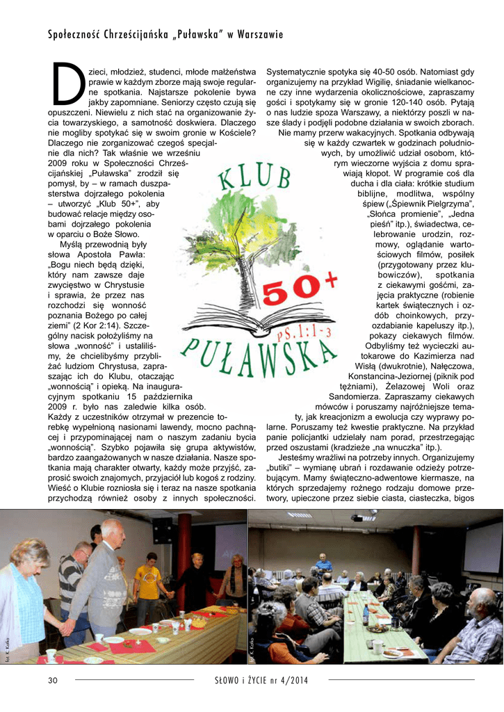 Społeczność Chrześcijańska „Puławska” w Warszawie D Systematycznie spotyka się 40-50 osób. Natomiast gdy organizujemy na przykład Wigilię, śniadanie wielkanocne czy inne wydarzenia okolicznościowe, zapraszamy gości i spotykamy się w gronie 120-140 osób. Pytają o nas ludzie spoza Warszawy, a niektórzy poszli w nasze ślady i podjęli podobne działania w swoich zborach. Nie mamy przerw wakacyjnych. Spotkania odbywają się w każdy czwartek w godzinach południowych, by umożliwić udział osobom, którym wieczorne wyjścia z domu sprawiają kłopot. W programie coś dla ducha i dla ciała: krótkie studium biblijne, modlitwa, wspólny śpiew („Śpiewnik Pielgrzyma”, „Słońca promienie”, „Jedna pieśń” itp.), świadectwa, celebrowanie urodzin, rozmowy, oglądanie wartościowych filmów, posiłek (przygotowany przez klubowiczów), spotkania z ciekawymi gośćmi, zajęcia praktyczne (robienie kartek świątecznych i oz dób choinkowych, przyozdabianie kapeluszy itp.), pokazy ciekawych filmów. Odbyliśmy też wycieczki autokarowe do Kazimierza nad Wisłą (dwukrotnie), Nałęczowa, Konstancina-Jeziornej (piknik pod tężniami), Żelazowej Woli oraz Sandomierza. Zapraszamy ciekawych mówców i poruszamy najróżniejsze tematy, jak kreacjonizm a ewolucja czy wyprawy polarne. Poruszamy też kwestie praktyczne. Na przykład panie policjantki udzielały nam porad, przestrzegając przed oszustami (kradzieże „na wnuczka” itp.). Jesteśmy wrażliwi na potrzeby innych. Organizujemy „butiki” – wymianę ubrań i rozdawanie odzieży potrzebującym. Mamy świąteczno-adwentowe kiermasze, na których sprzedajemy rożnego rodzaju domowe przetwory, upieczone przez siebie ciasta, ciasteczka, bigos fot. K. Kotko fot. K. Kotko zieci, młodzież, studenci, młode małżeństwa prawie w każdym zborze mają swoje regularne spotkania. Najstarsze pokolenie bywa jakby zapomniane. Seniorzy często czują się opuszczeni. Niewielu z nich stać na organizowanie życia towarzyskiego, a samotność doskwiera. Dlaczego nie mogliby spotykać się w swoim gronie w Kościele? Dlaczego nie zorganizować czegoś specjalnie dla nich? Tak właśnie we wrześniu 2009 roku w Społeczności Chrześ cijańskiej „Puławska” zrodził się pomysł, by – w ramach duszpasterstwa dojrzałego pokolenia – utworzyć „Klub 50+”, aby budować relacje między oso bami dojrzałego pokolenia w oparciu o Boże Słowo. Myślą przewodnią były słowa Apostoła Pawła: „Bogu niech będą dzięki, który nam zawsze daje zwycięstwo w Chrystusie i sprawia, że przez nas rozchodzi się wonność poznania Bożego po całej ziemi” (2 Kor 2:14). Szcze gólny nacisk położyliśmy na słowa „wonność” i ustaliliś my, że chcielibyśmy przybliżać ludziom Chrystusa, zapraszając ich do Klubu, otaczając „wonnością” i opieką. Na inauguracyjnym spotkaniu 15 października 2009 r. było nas zaledwie kilka osób. Każdy z uczestników otrzymał w prezencie torebkę wypełnioną nasionami lawendy, mocno pachnącej i przypominającej nam o naszym zadaniu bycia „wonnością”. Szybko pojawiła się grupa aktywistów, bardzo zaangażowanych w nasze działania. Nasze spotkania mają charakter otwarty, każdy może przyjść, zaprosić swoich znajomych, przyjaciół lub kogoś z rodziny. Wieść o Klubie rozniosła się i teraz na nasze spotkania przychodzą również osoby z innych społeczności. 30 SŁOWO i ŻYC IE n r 4/2014 Co przed nami? „Jeżeli Pan zechce, będziemy żyli i zrobimy to lub owo” (Jk 4:15). Postanowiliśmy wydawać miesięczny informator Klubu 50+. Będą w nim daty urodzin klubowiczów, grafik dyżurów w kuchni, prośby modlitewne, artykuliki i wierszyki – twórczość naszych klubowiczów. Południowe godziny naszych spotkań są bardzo dogodne dla nieaktywnych zawodowo, ale nie dla pracujących. Postano wiliśmy więc organizować dwa spotkania: w południe dla niepracujących, a wieczorem dla czynnych zawodowo. Pierwsze wieczorne spotkanie odbyło się 30 października br. Gościem specjalnym był pastor W. Andrzej Bajeński, a temat jego refleksji to „Jak się nie znudzić służbą dla Pana przez 30 lat”. Ciąg dalszy nastąpi. Pastor TADEUSZ NAUMIUK duszpasterz dojrzałego pokolenia fot. K. Kotko fot. N. Hury fot. K. Kotko fot. N. Hury i pyszny chlebek ze smalcem i ogórkiem, własnoręcznie wykonane świąteczne kartki i ozdoby choinkowe. Uzyskane w ten sposób pieniądze w połowie przekazujemy na przygotowanie „Pomocnych toreb” rozdawanych naszym sąsiadom z okolicy Kościoła podczas spotkań adwentowych i odwiedzin w domach. Pozostałą kwotę przeznaczamy na wynajęcie autokaru i kolejną wycieczkę krajoznawczą. Wielu przychodzi na Klub już o godz. 9.00, na dyżur do kuchni. Przed 10.00 zjawiają się kolejne osoby, by ustawić stoły i krzesła, rozłożyć obrusy i dekoracje, przygotować termosy z gorącą wodą, czy po prostu na rozmowy przy kawie i herbacie. O 11.00 rozpoczynamy spotkanie, kończymy koło 14.00. Potem wspólne sprzątanie, by pozostawić po sobie porządek. Rozchodząc się, mówimy: Do zobaczenia – jak Bóg pozwoli – w następny czwartek! To ważne dla nas miejsce. To nasz Klub i wspólnie tworzymy jego atmosferę. Wśród klubowiczów są zapewne i tacy, dla których najważniejszy jest gorący czwartkowy posiłek, być może jedyny w ciągu dnia. Cieszymy się, że i w ten sposób możemy okazać miłość i troskę. „Klub 50+” istnieje już pięć lat. Ten jubileusz świętowaliśmy 16 października br., jak zwykle we czwartek, ale nie w kawiarence, lecz w kaplicy. Zaprosiliśmy wielu gości. Dziękowaliśmy Bogu przede wszystkim, ale też i ludziom, dzięki którym nasza działalność jest możliwa. Jak zwykle dużo śpiewaliśmy. Stare hymny to nasz ulubiony repertuar, ale była też niespodzianka – raper Mirek Kolczyk. Trochę ryzykowałem, zapraszając go, ale został przyjęty nadzwyczaj serdec